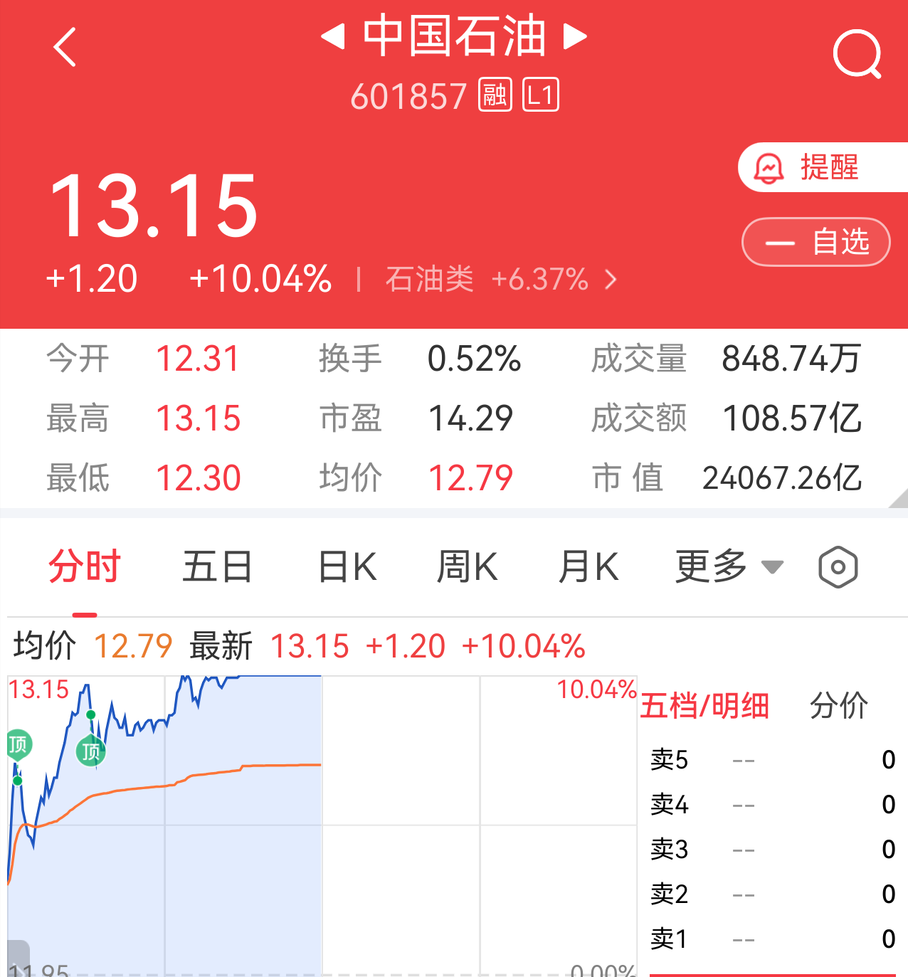油气概念延续前一交易日强势表现,中国石油、中国石化、中国海油“三桶油”再度集体涨停。