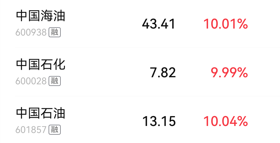 截至3月3日午间收盘,中国石油、中国石化、中国海油涨幅分别达10.04%、9.99%、10.01%。前一天,3月2日收盘,“三桶油”均告涨停,这在历史上首次出现,十分罕见。