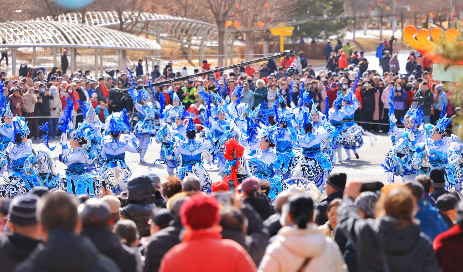 上午10时30分,伴随着铿锵锣鼓与欢快唢呐,世园瞬间化作欢乐的海洋,参演队员们身着艳丽服饰,和着鼓点节拍,尽展传统花会魅力。中国馆广场上,井家庄村舞龙队身手矫健,金龙盘旋腾跃、气势恢宏。文化馆冰雪竹马灵动轻盈,与园区雪景相映成趣。足球场主展区内,秧歌队彩绸飞舞,腰鼓队鼓点激昂。