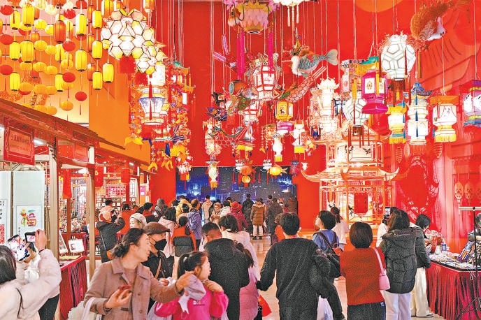 在中国工艺美术馆(中国非物质文化遗产馆),来自各地的非遗花灯造型各异、流光溢彩。今天,该馆邀请观众“智”闹元宵。馆内一层,一副妙趣横生的上联“响当当一马当先当仁不让”搭配横批“春风着意”,静候知音。观众可将书写的下联投入中央大厅北侧咨询台的“妙联箱”中,馆方将精选30条优质下联,入选者可获得限定年节非遗好礼。此外,观众还可领取任务卡,在“过年——丙午春节主题展”展厅内寻找6件与“马”或“元宵节”相关的展品参与趣味答题。