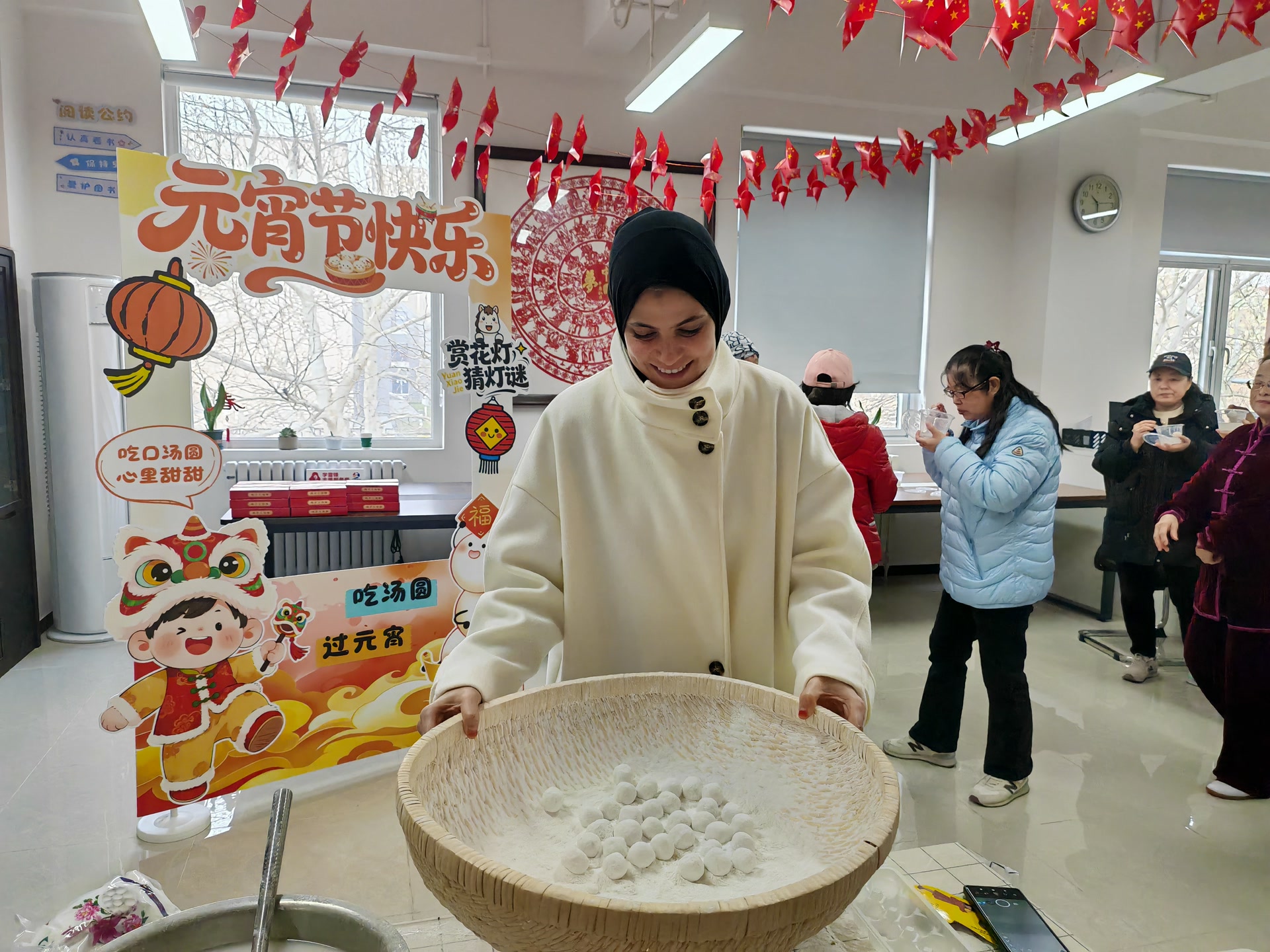 文艺演出后,还有摇元宵、猜灯谜、拍照打卡等丰富活动。在摇元宵体验区,欢声笑语最是热闹。白瓷盆里,糯米粉如雪般细腻,居民们轻轻转动盆身,一颗颗馅料在粉中翻滚,渐渐裹上银装。来自俄罗斯的Tom,在邻居阿姨的指导下,兴致勃勃地体验起了摇元宵。“这个力度要刚刚好,不然馅料会露出来。”学习了一会儿,Tom摇出的元宵模样规整,他捧着成果感叹:“太有成就感了!”