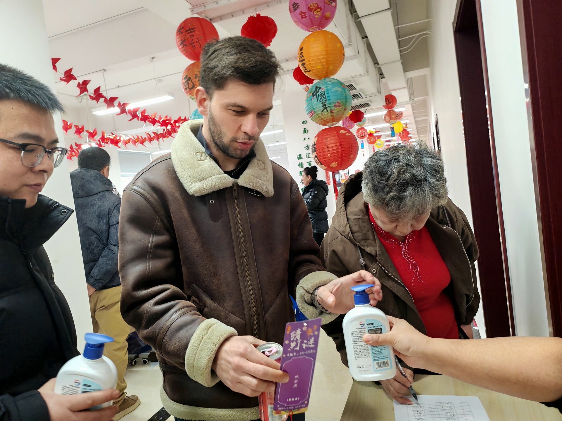 文艺演出间隙,抽奖环节惊喜不断。来自利比亚的Hana听到自己的名字被念出时,激动地起身挥手、笑容灿烂。“太幸运了,感谢社区,我感受到了中国文化,尤其是京剧表演,太棒了!”Hana接过奖品,用不太流利的中文向社区工作人员表达谢意。