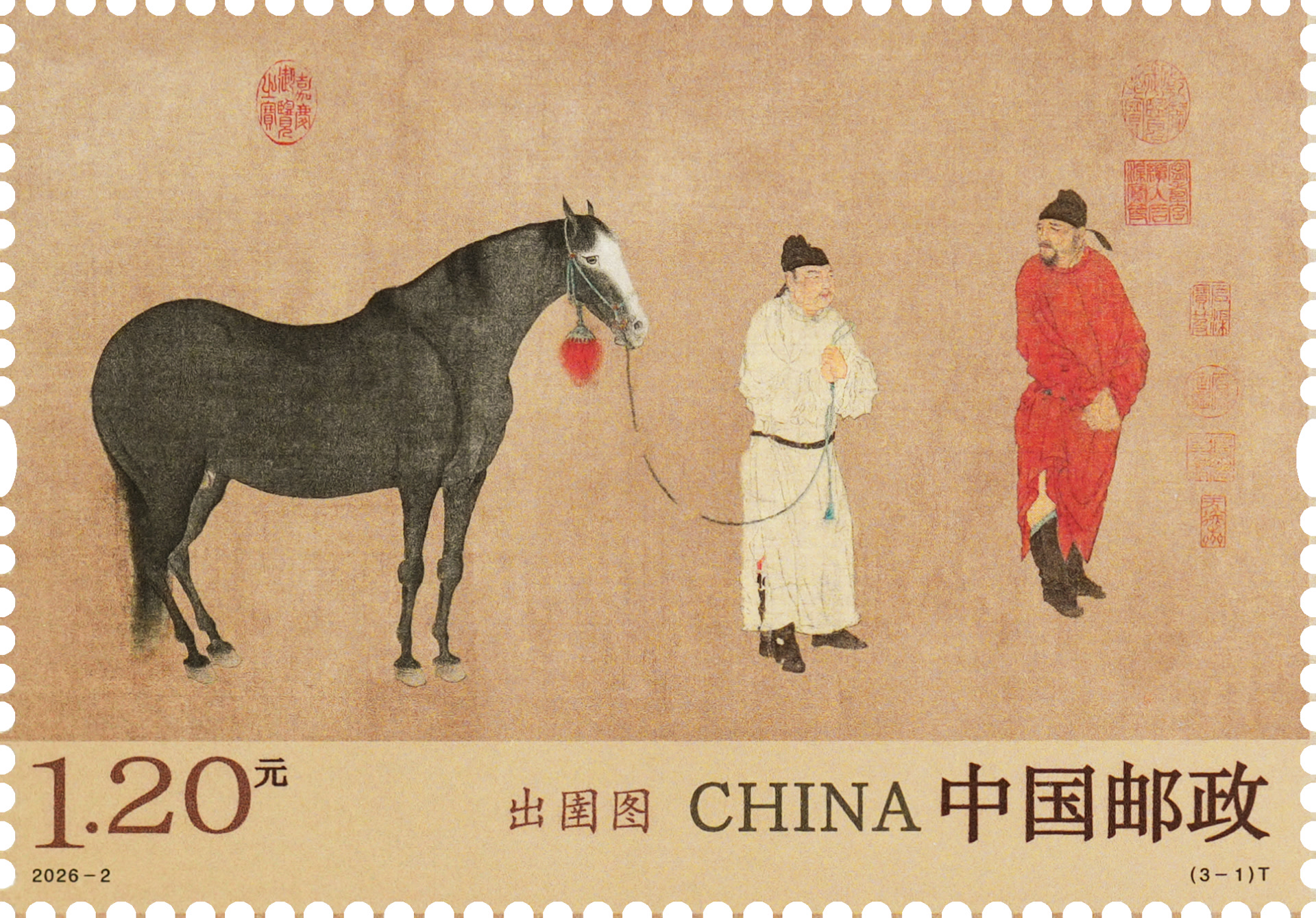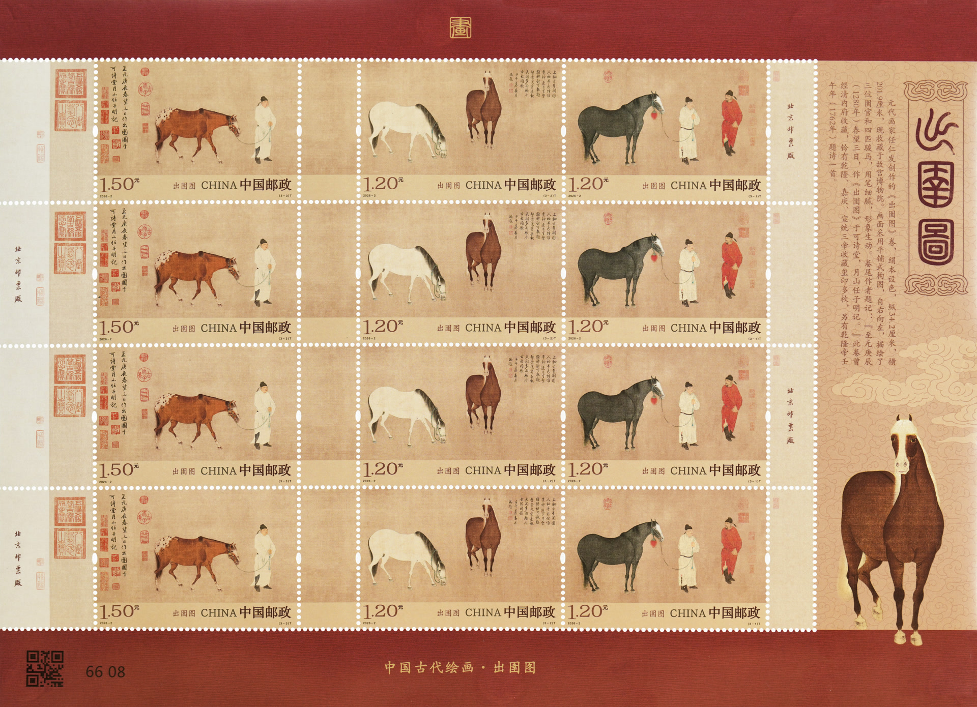 中国邮政相关负责人介绍,《出圉图》是元代画家任仁发创作的绢本设色画,现藏于故宫博物院。此画作于至元庚辰年(1280年),画面采用平铺式构图,自右向左描绘了三位圉官和四匹骏马,用笔细腻,形象生动。