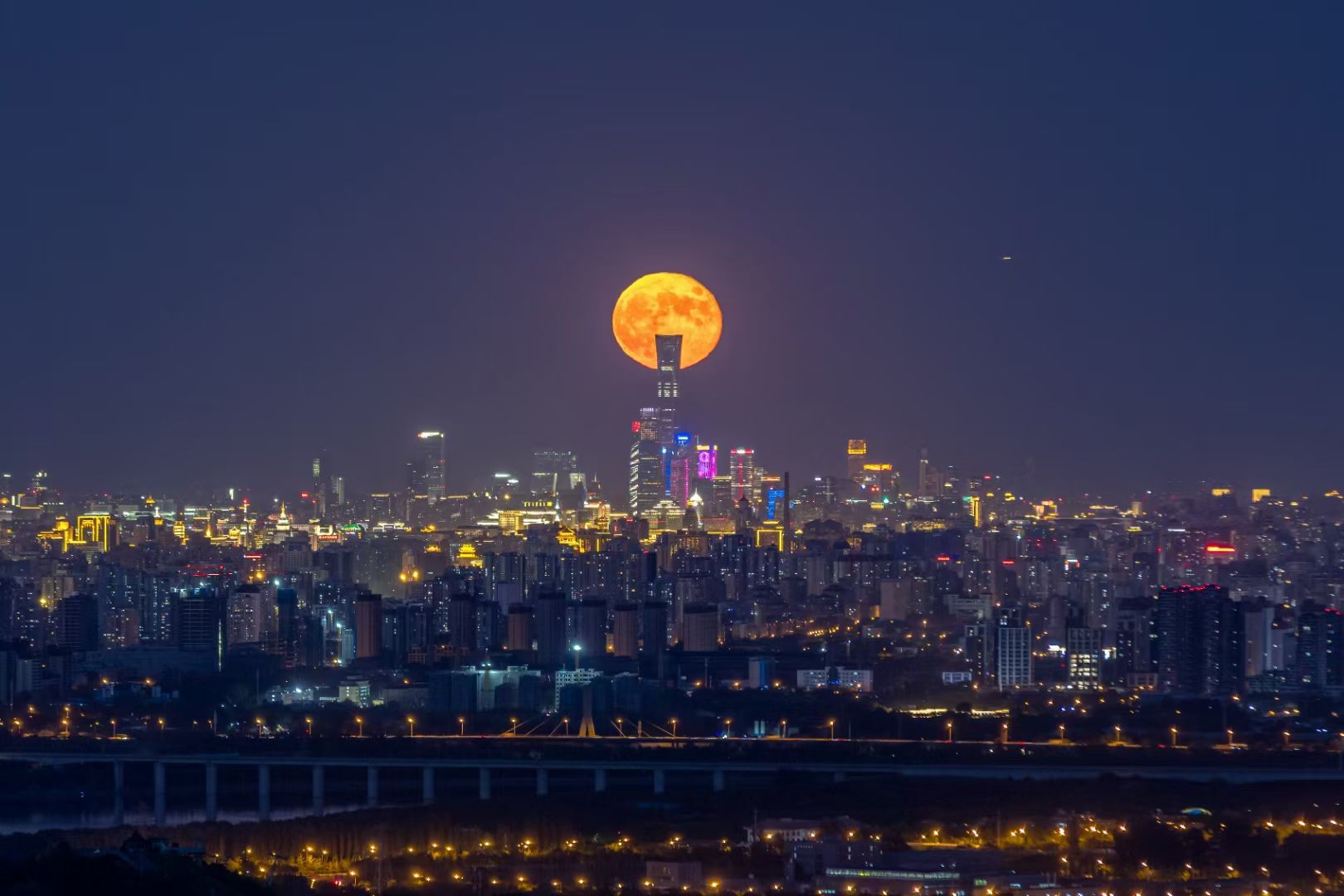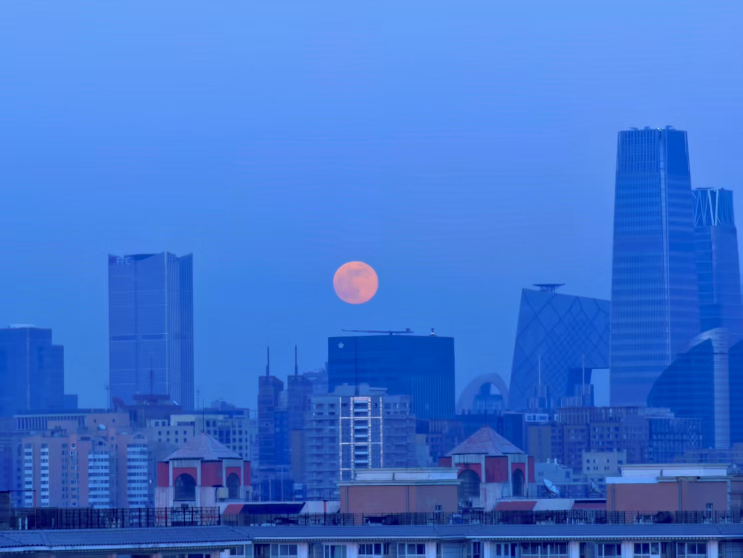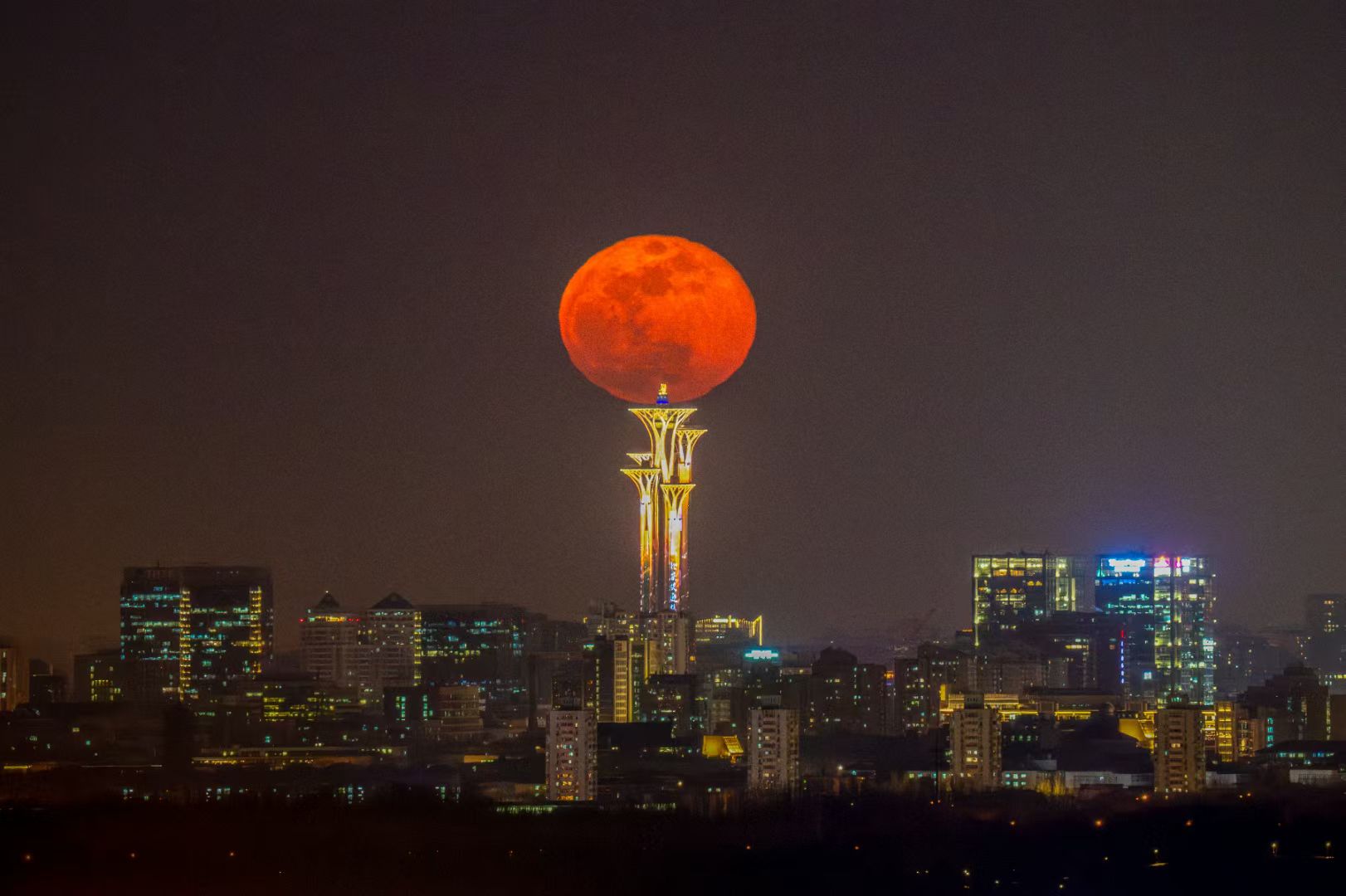 俯瞰北京中轴线全景,红月亮与紫禁城、京城夜景同框,视野无敌,是记录元宵红月与古都交融的绝佳位置。