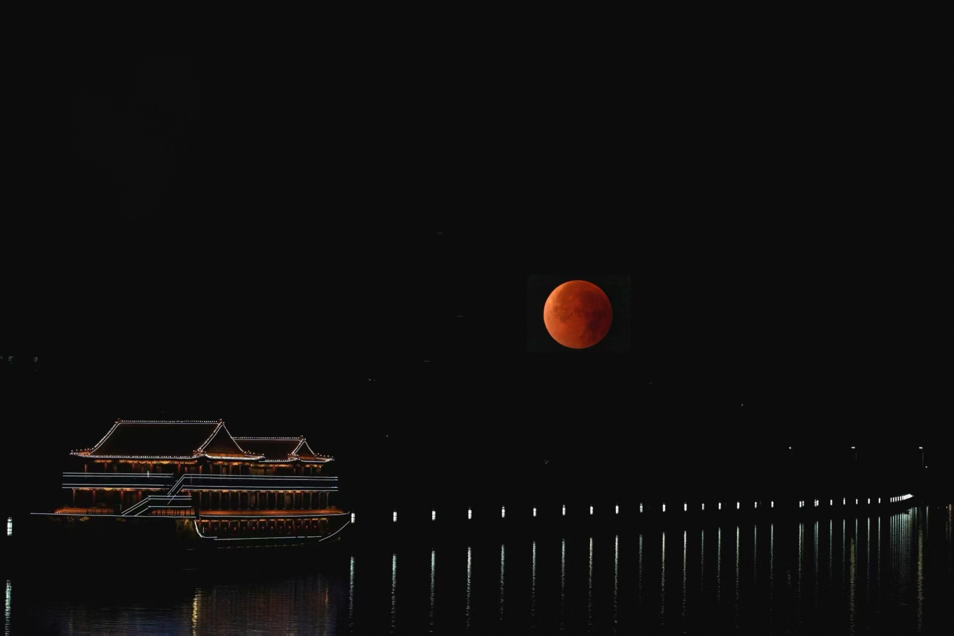 什刹海龙亭酒庄门口的水边,可拍摄古建+中国尊+湖面的月食盛况。