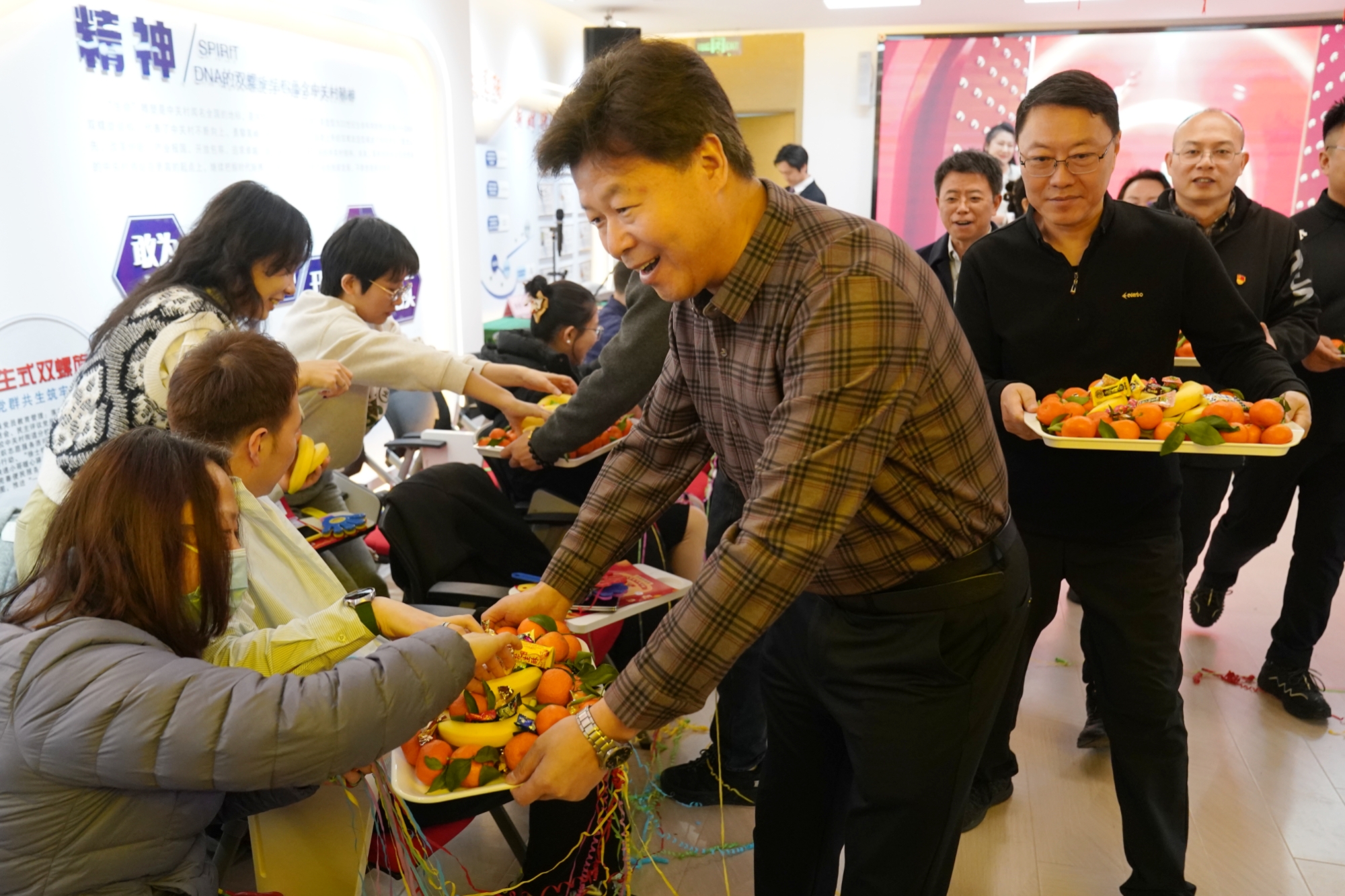 活动开始,16名党支部书记与新就业群体小哥代表登场。“凝心聚力十五五,奋楫扬帆正当时,开工大吉,马力全开!”的激昂口号点燃全场,伴随着“奔跑”背景音乐,书记们手捧水果盘穿梭在人群中,将温暖与关怀亲手传递给每一个人。