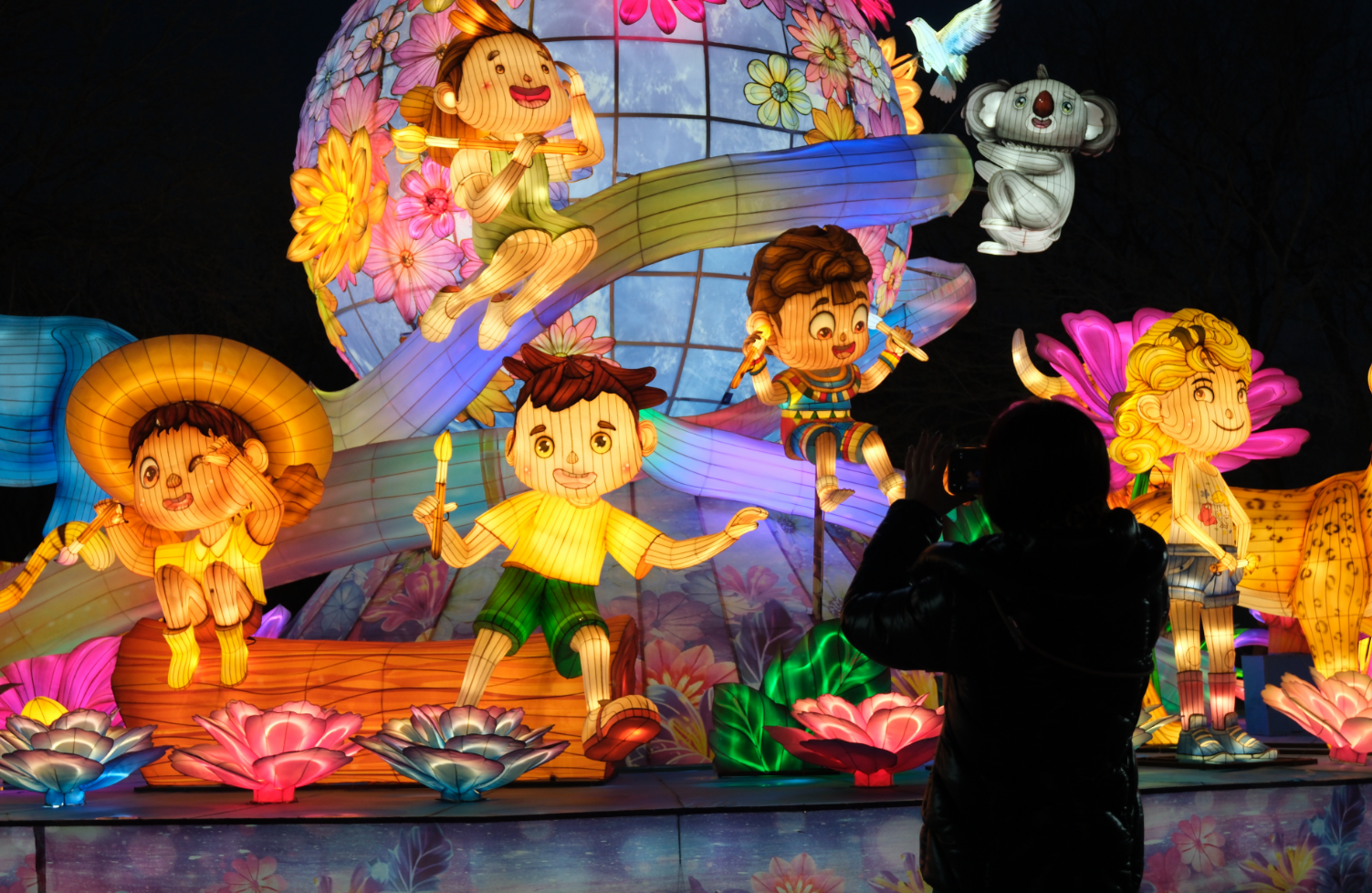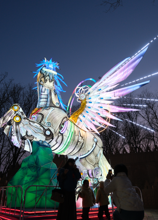 亚洲景区园区里,一组机械马彩灯吸引了众多游客驻足。一个小女孩正拉着妈妈的手不肯走。“妈妈快看!”女孩兴奋地指着正在缓缓摆头的彩灯。妈妈蹲下身,把女儿搂在怀里:“来,咱们和马儿合个影。”
