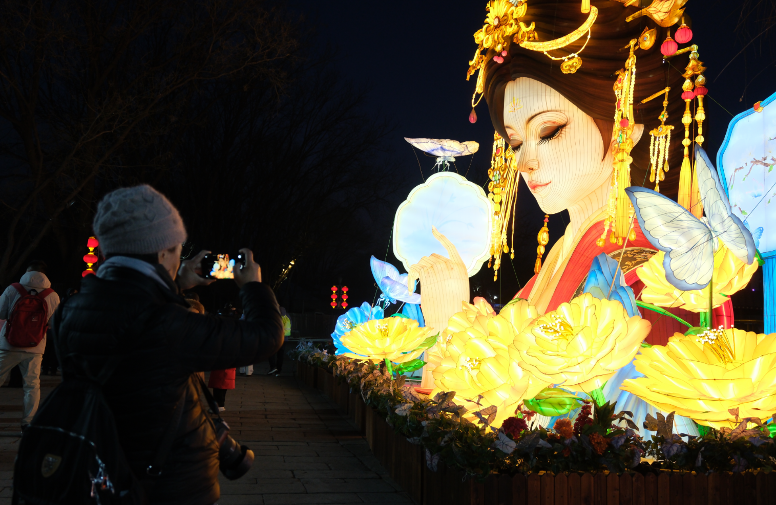 园区中央,高近十米的“京彩女神”花灯成为最热门的打卡点,人们排着队轮流与之合影。女神身着古装,头戴发簪,眼眸每隔几秒就会缓缓眨动,仿佛有了生命。