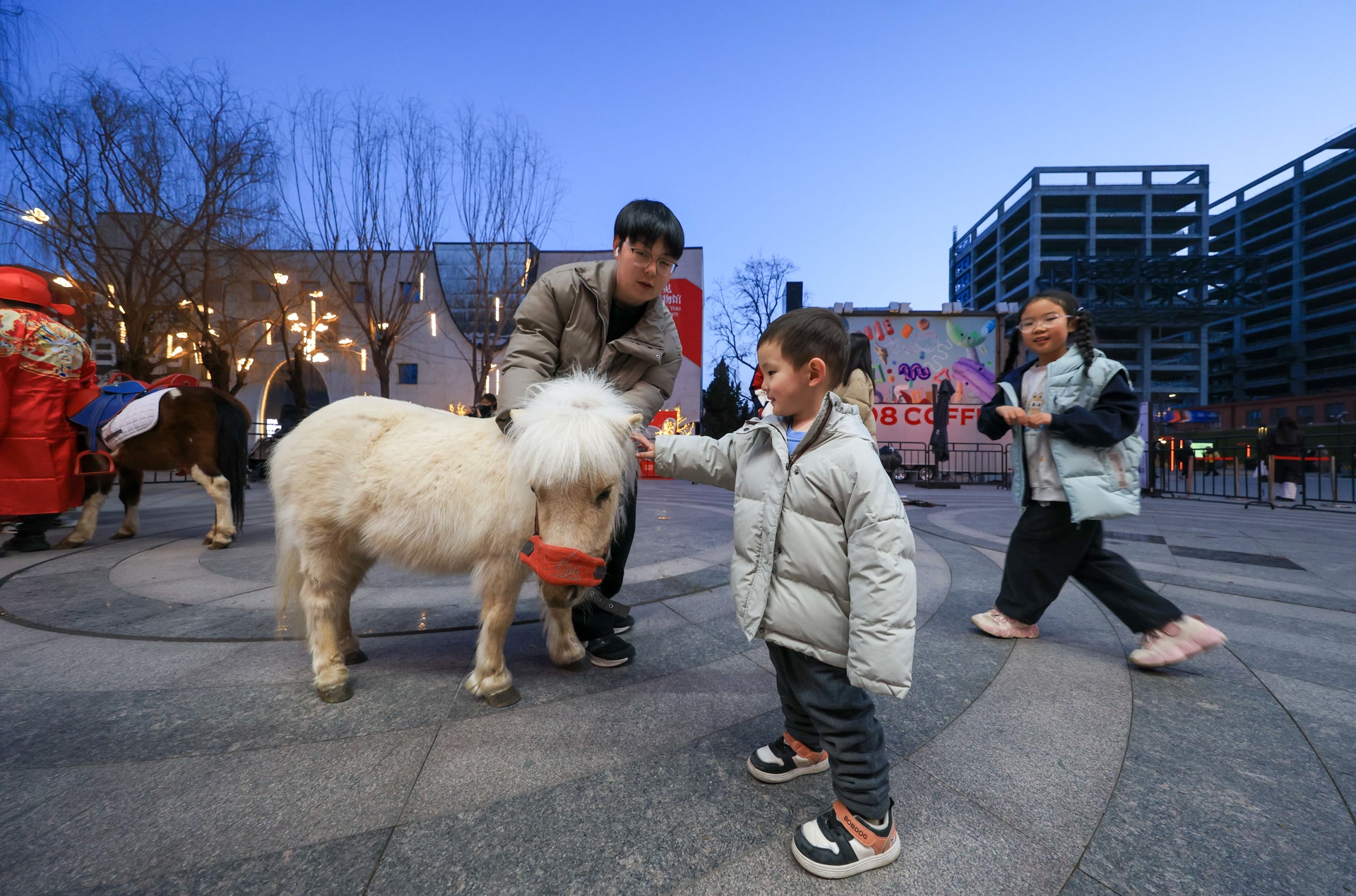 电子广场的三匹萌马成为当天的“团宠”,游客纷纷上前亲密互动,同时还能亲身尝试“鞍上射箭”,体验传统“六艺”。身着传统服饰的“财神爷”牵着小马在园区巡游,为来往游客送上祝福。