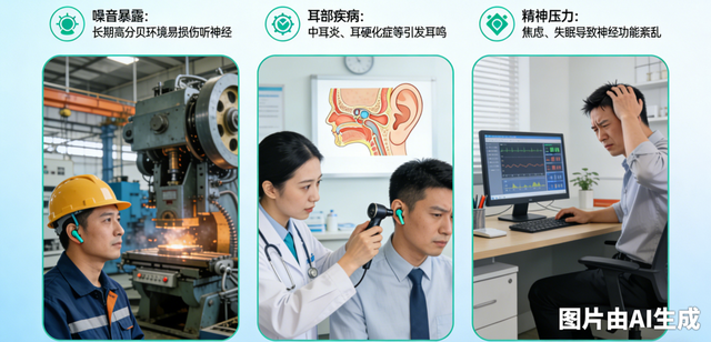 另外,长期暴露在噪音环境中(比如工厂噪音、KTV、长时间戴耳机听音乐),会损伤内耳毛细胞,导致耳鸣,严重时还会引发噪音性耳聋,这种情况在年轻人中越来越常见。