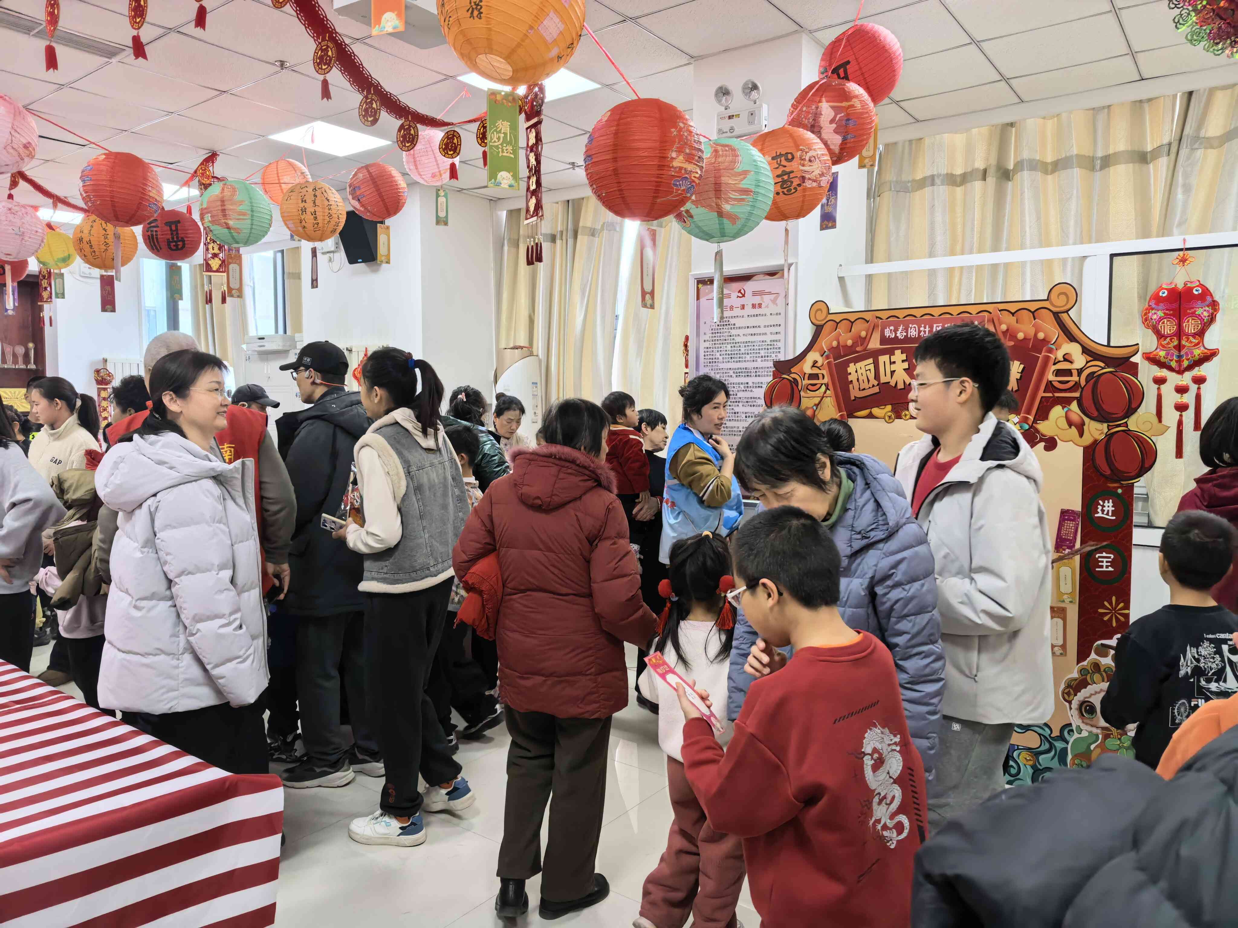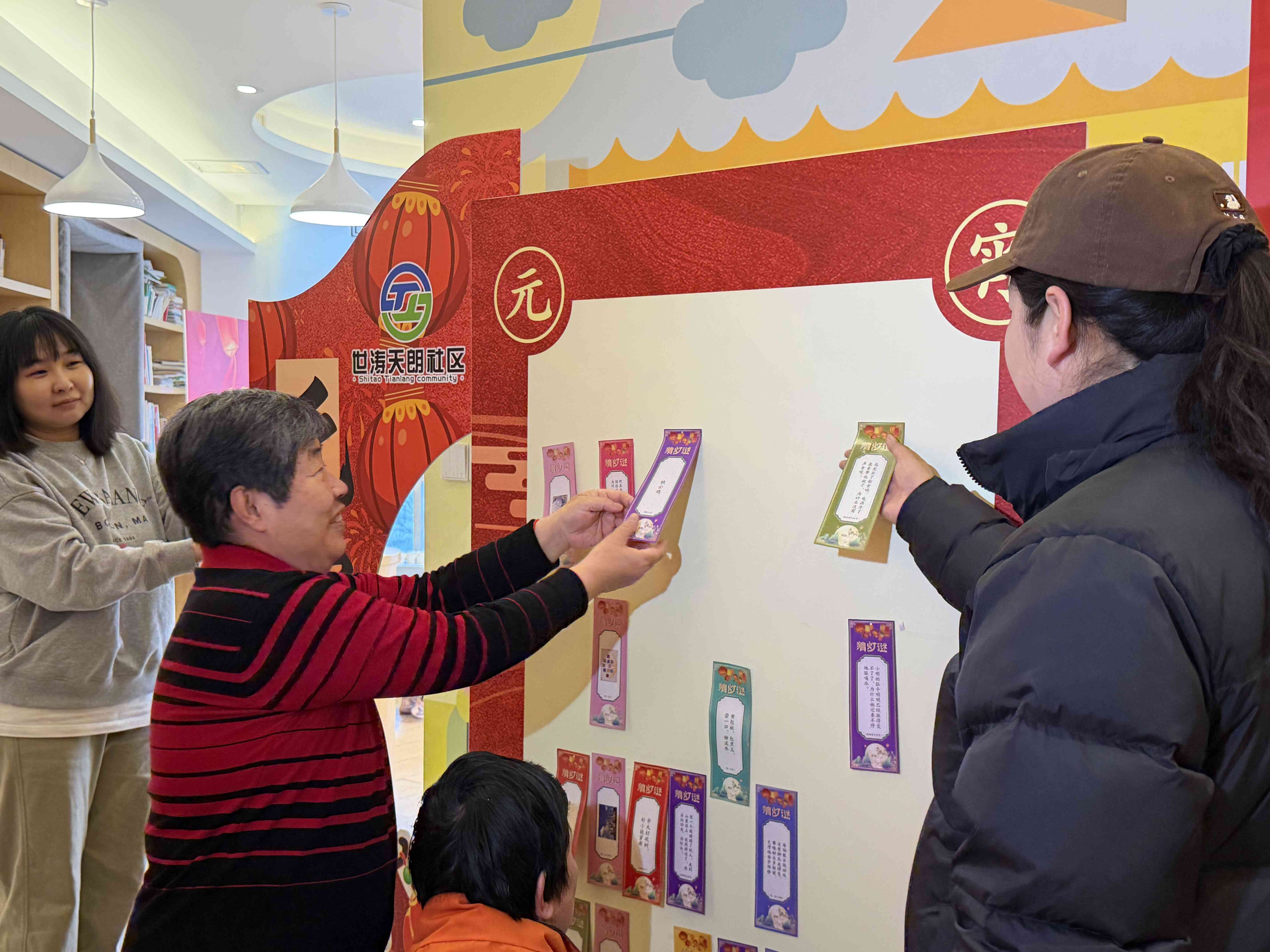城南街道世涛天朗社区开展“元宵喜乐会,文明‘邻’距离”活动,将猜灯谜、夹元宵等民俗游戏与社区治理相融合,其中“猜灯谜”摊位最为火爆,居民们纷纷揭下灯谜纸条,相互协作解谜,赢取元宵奖品,现场热闹非凡。