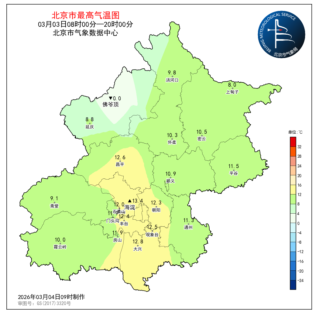 3月3日08时至3日20时,观象台最高气温12.5℃(15:05);