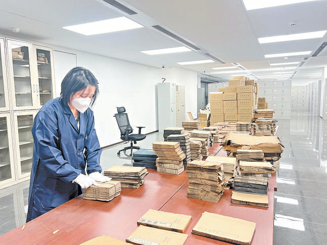 涵芬楼珍藏的善本书目还在逐步整理的过程中。商务印书馆工作人员说:“目前已登记在册的有3万余册,正在整理的大部分为商务印书馆在民国时期出版的线装书。”工作台上,摆放着早已泛黄的《金文历朔疏证》《戊戌六君子遗集》等,其中,《戊戌六君子遗集》由张元济编辑,出版于1918年。工作人员告诉记者,整理这些书籍,首先要小心翼翼地拆掉原先绑在上面的麻绳,清理灰尘,再根据类别清点后依次放置进书柜里。这些书经过时间的沉淀,已是比较珍贵的文物,要进行保护。如果有的书损坏严重,还会有选择地请专业人士进行修复。顾青表示,整理旧藏是个浩大的工程,商务印书馆会一直坚持做下去。