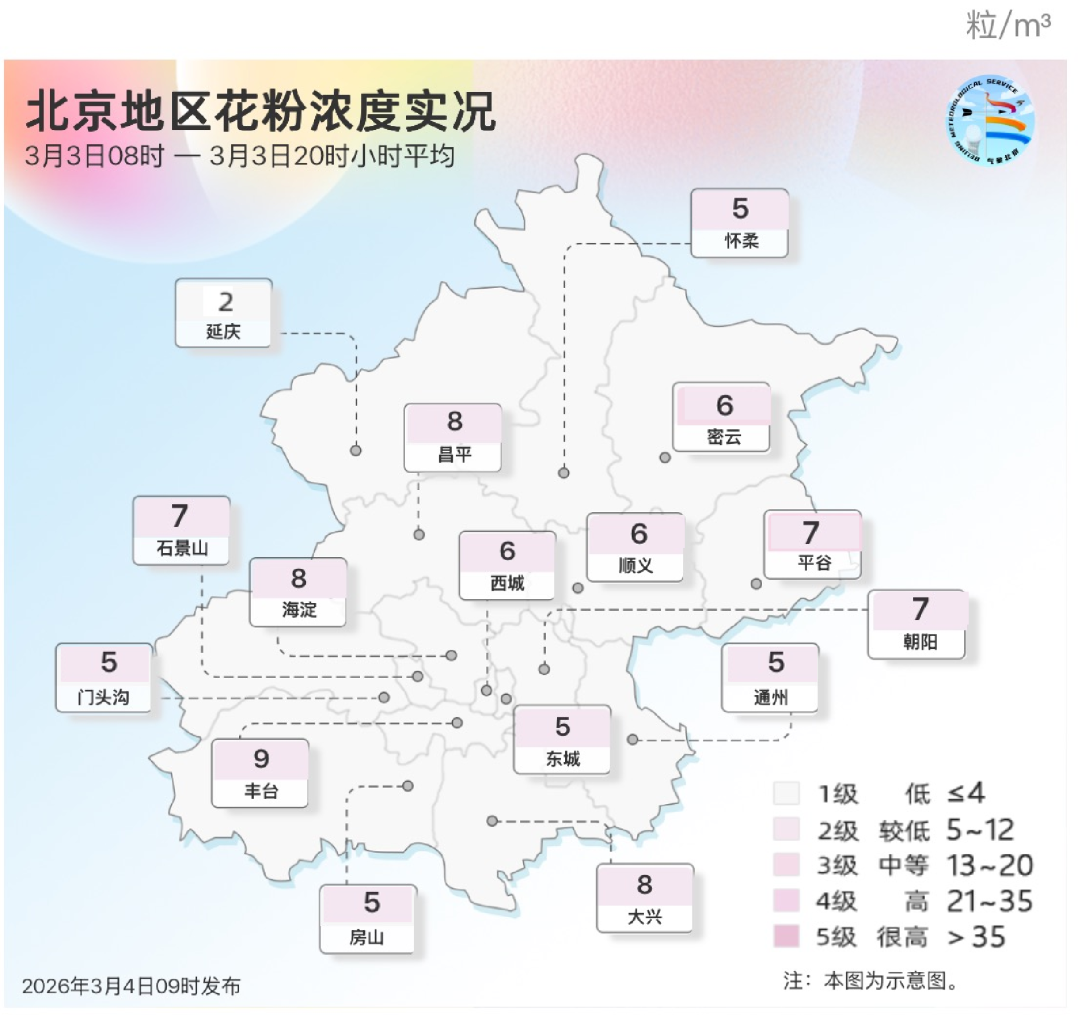 昨日北京城区大部花粉浓度等级为2级,较低级别,主要致敏花粉种类为榆科。预计3月4日花粉浓度以1级为主,为低级别(≤4粒/立方米)。