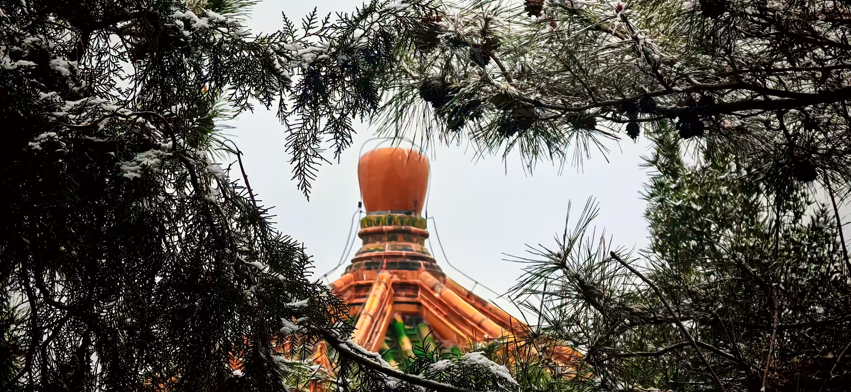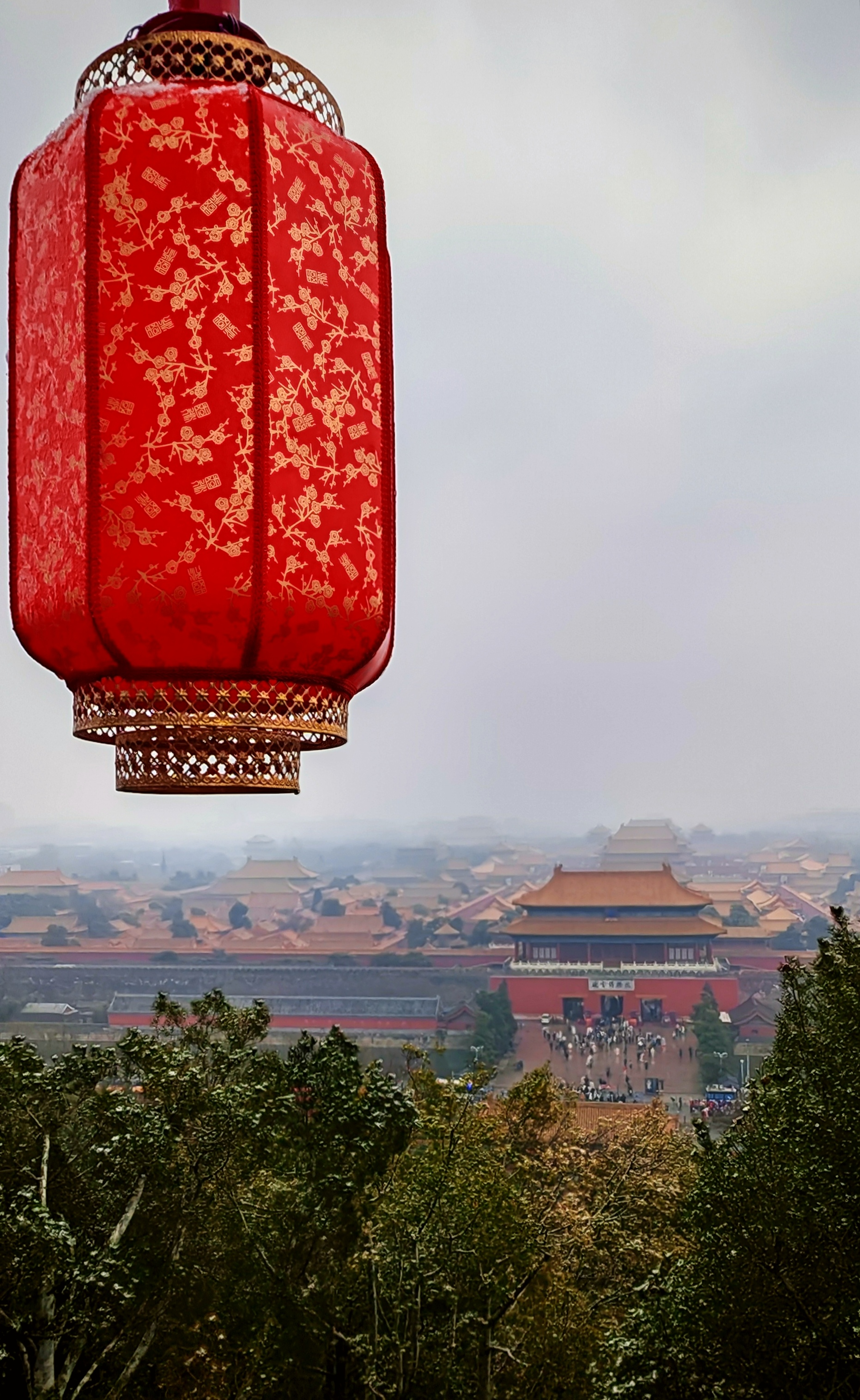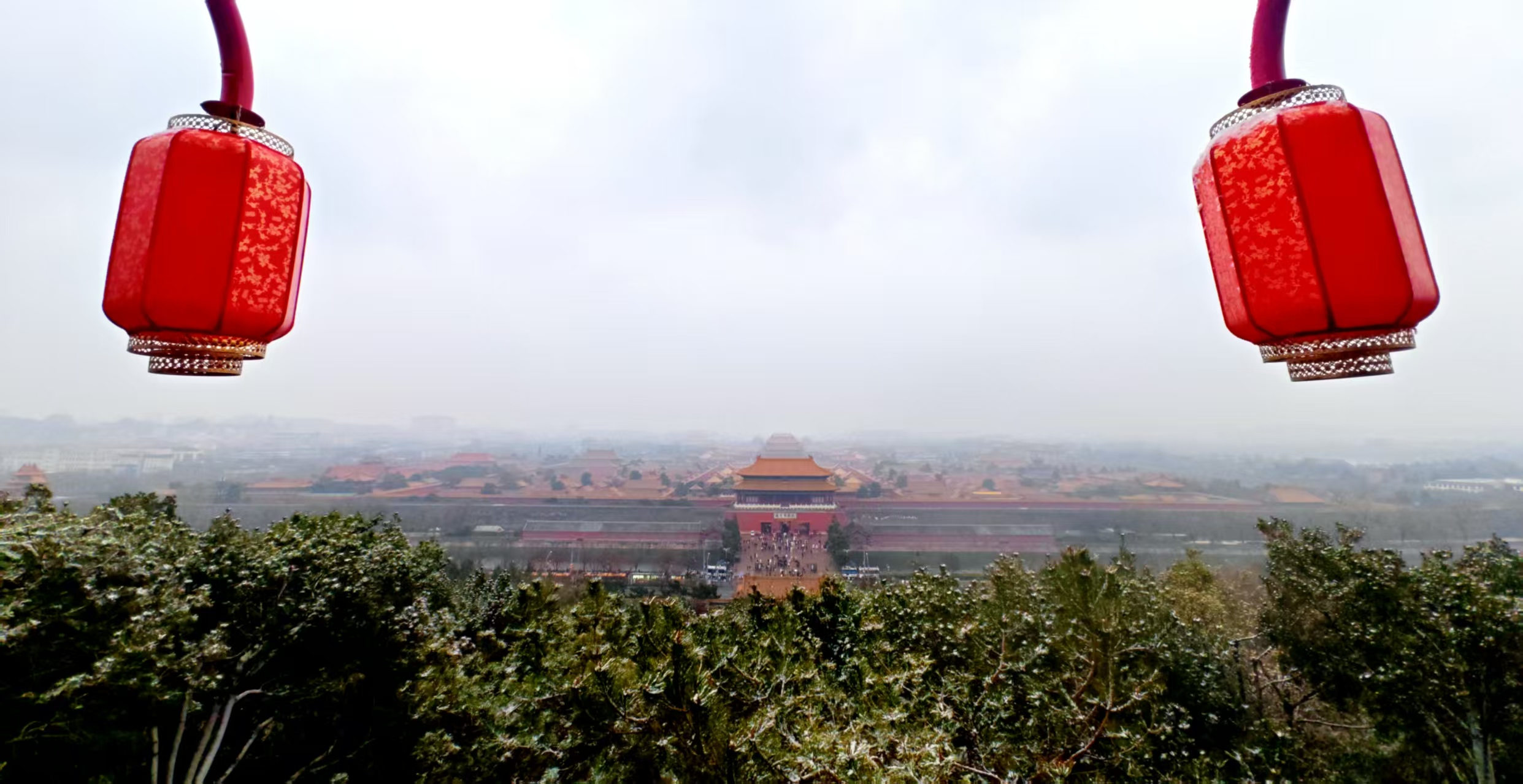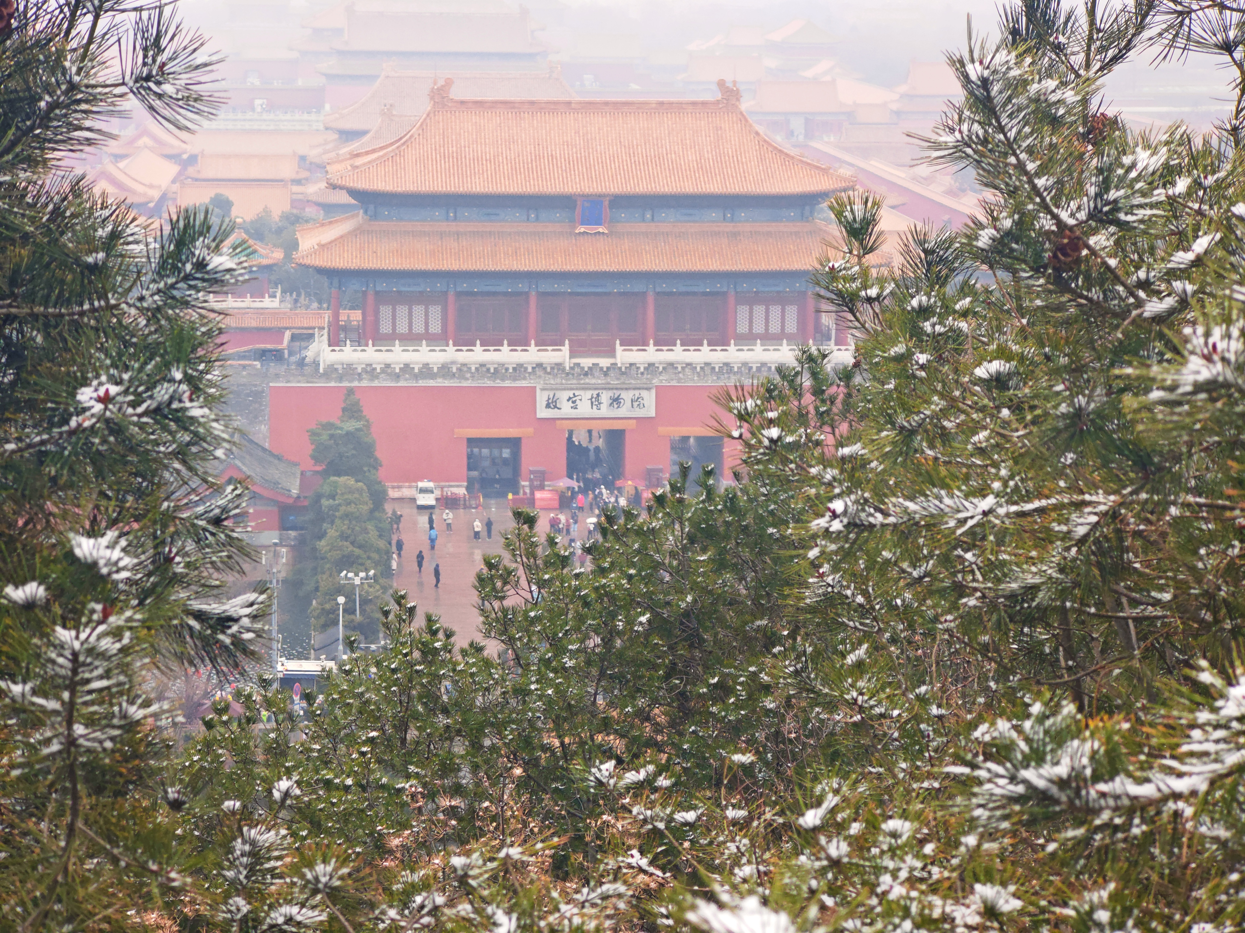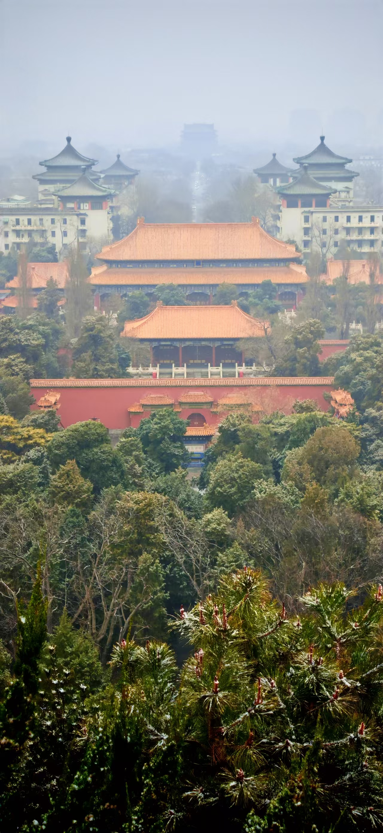 从景山最高处万春亭向南眺望,是整个京城最震撼的金色琉璃世界一一故宫。在雪雾氤氲中,景山与故宫,一高一远,一望一被望,完成了一场穿越数百年的无声对话。