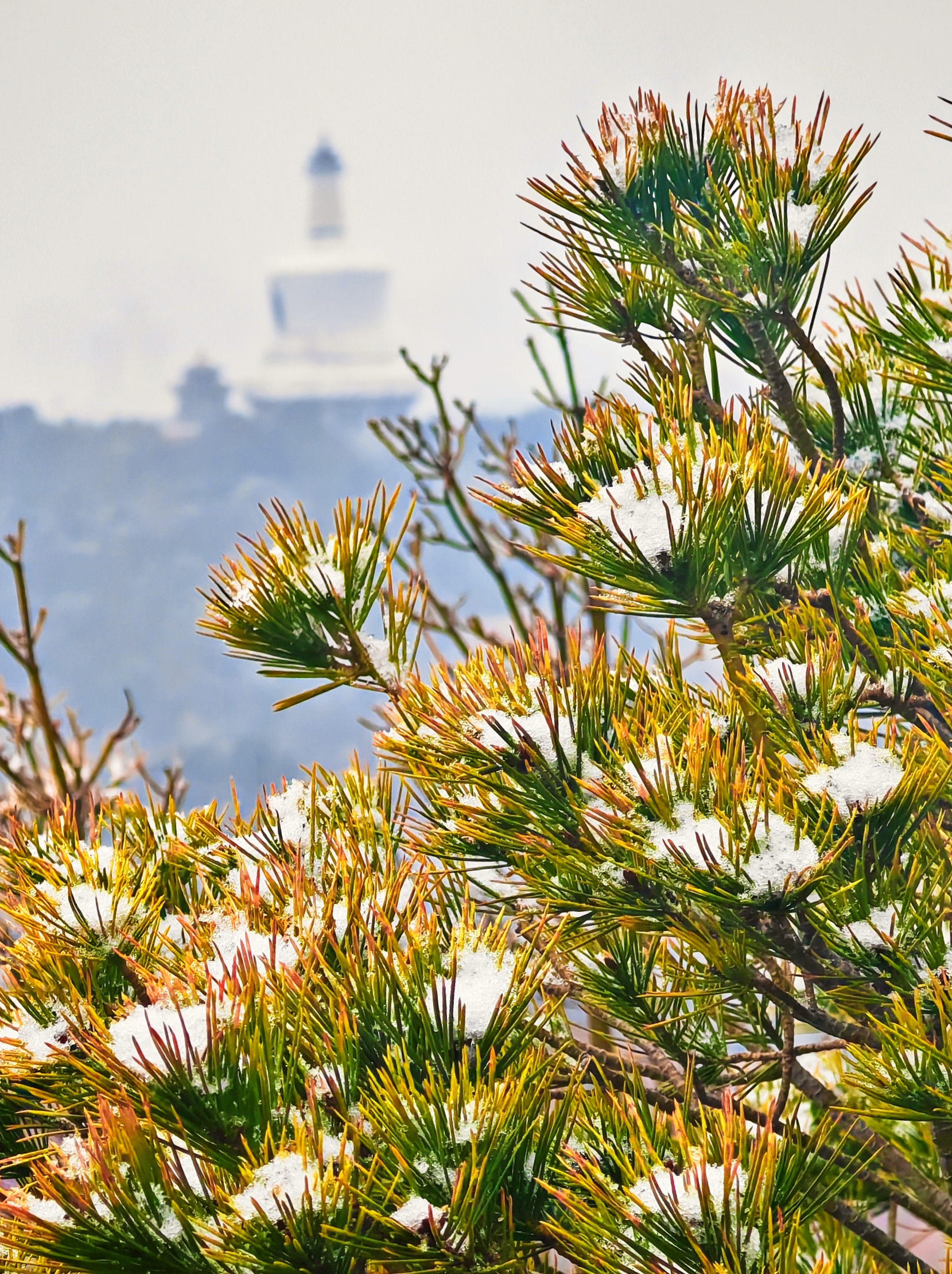 雪花落在公园四周山坡上,落在那尚未完全苏醒的枝丫间。通往山顶的山坡两旁,在这片若有若无的白色衬托下,呈现出一种朦胧、静谧而又充满生机的美。