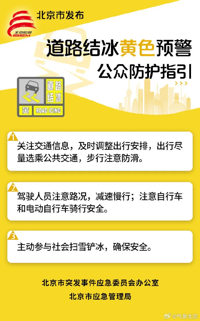 北京市气象台2026年3月4日10时45分发布道路结冰黄色预警信号:至5日白天本市有降雪天气,因地表温度低于0℃,部分地区将出现道路结冰,请注意交通安全。