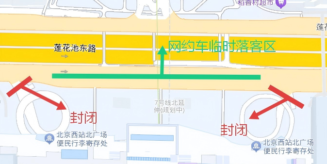 此外,莲花池东路辅路西向东方向北广场前,设置临时落客区域,即停即走,请送站车辆服从现场引导,快速下客、有序驶离。北广场原有停车场、出租车调度站、网约车接驳区正常开放。