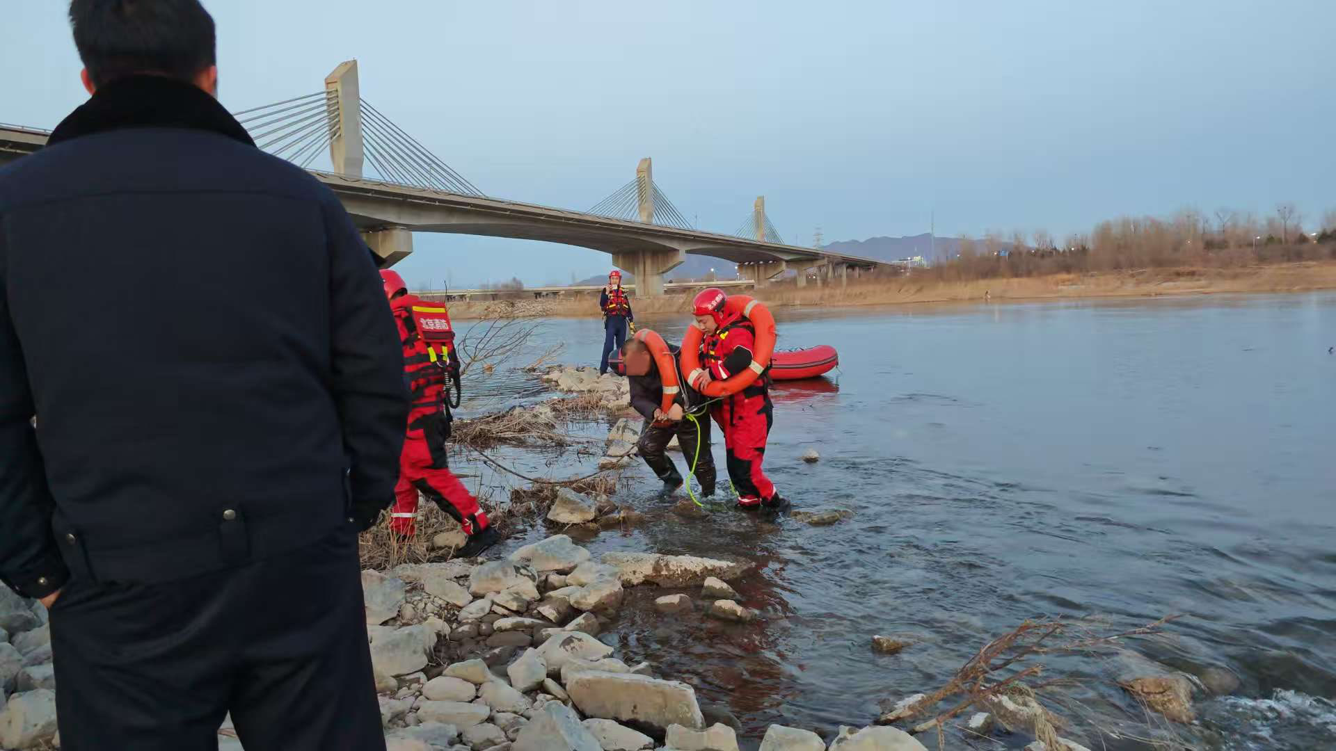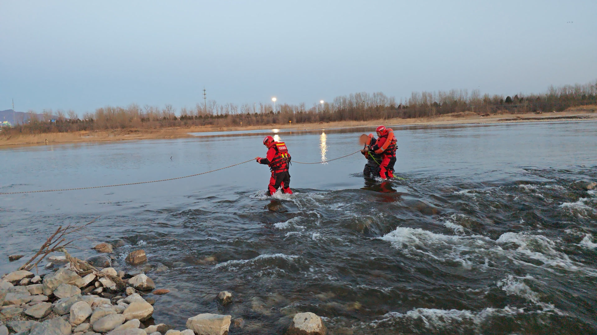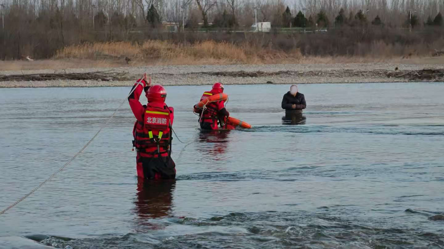 3月3日下午,在京承高速潮白河桥南侧约200米处河道中,一男子因下河捡拾掉落的遥控玩具船,被湍急水流围困,水位没至腰部,随时有被冲走的危险。怀柔区消防救援支队队员迅速到场,采取长绳牵引涉水救援方式,成功将其安全救出。