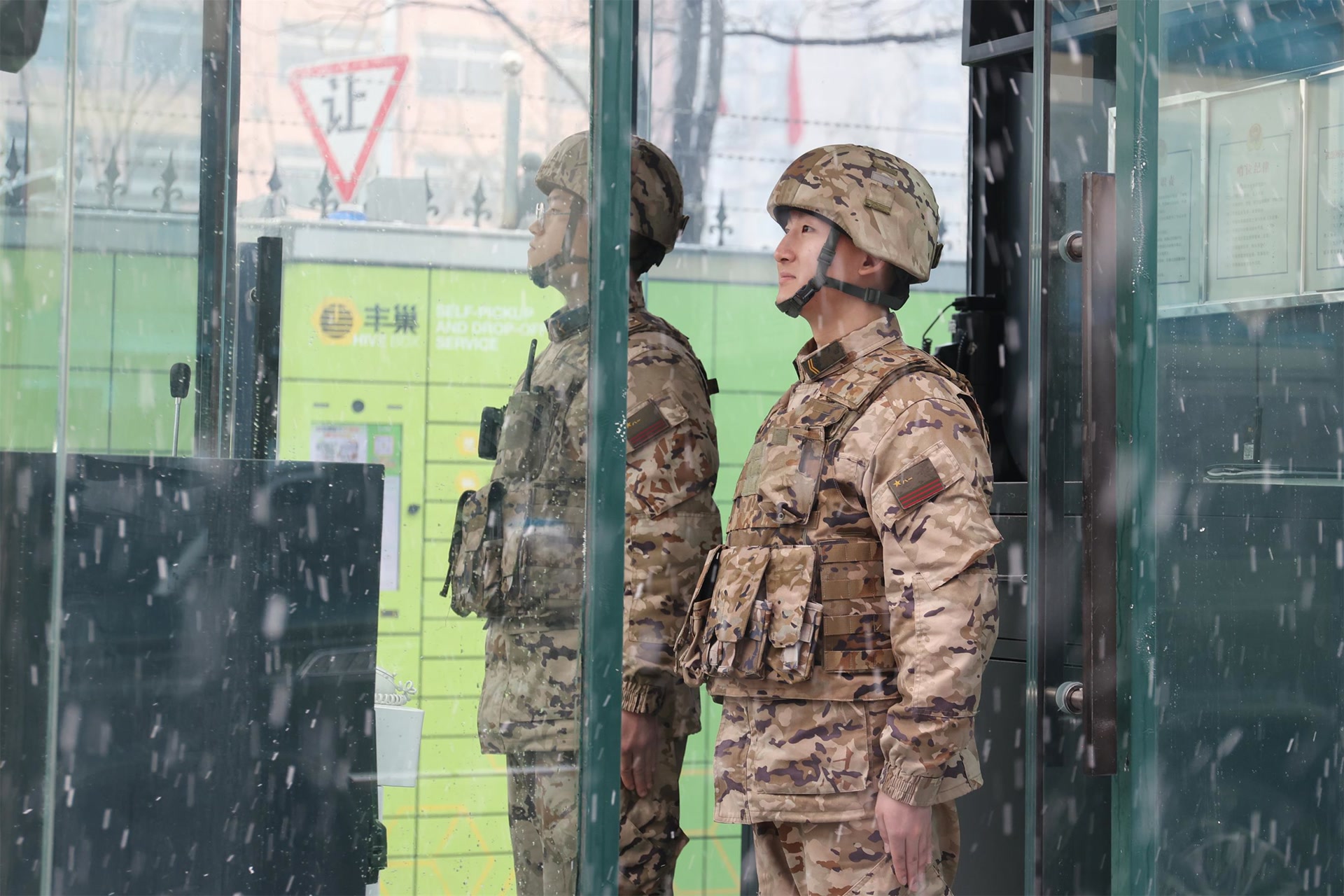 在朝阳商业核心区,人流车流密集,官兵们加大巡逻频次,全力维护驻地秩序,成为雪天里最动人的迷彩风景线。