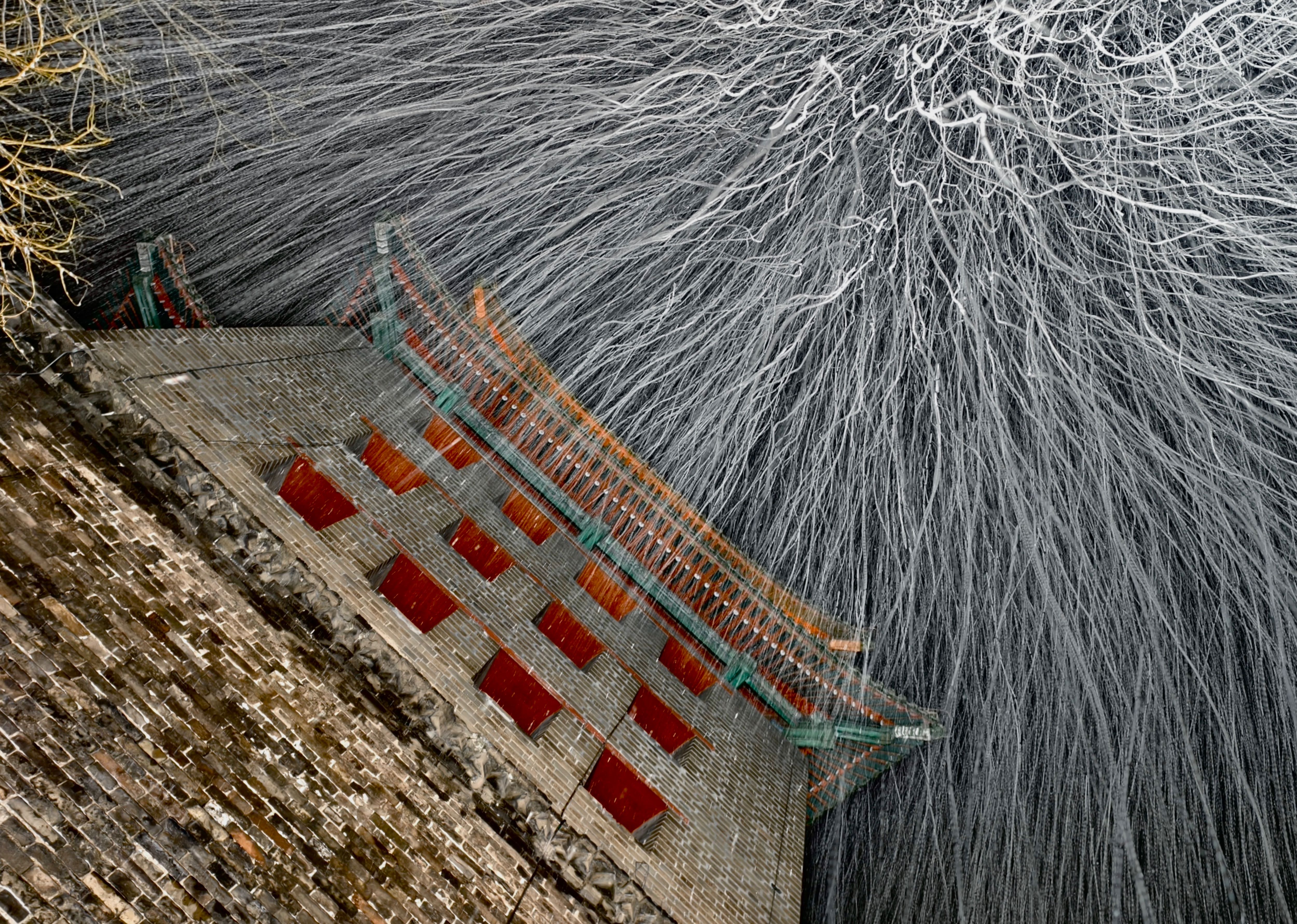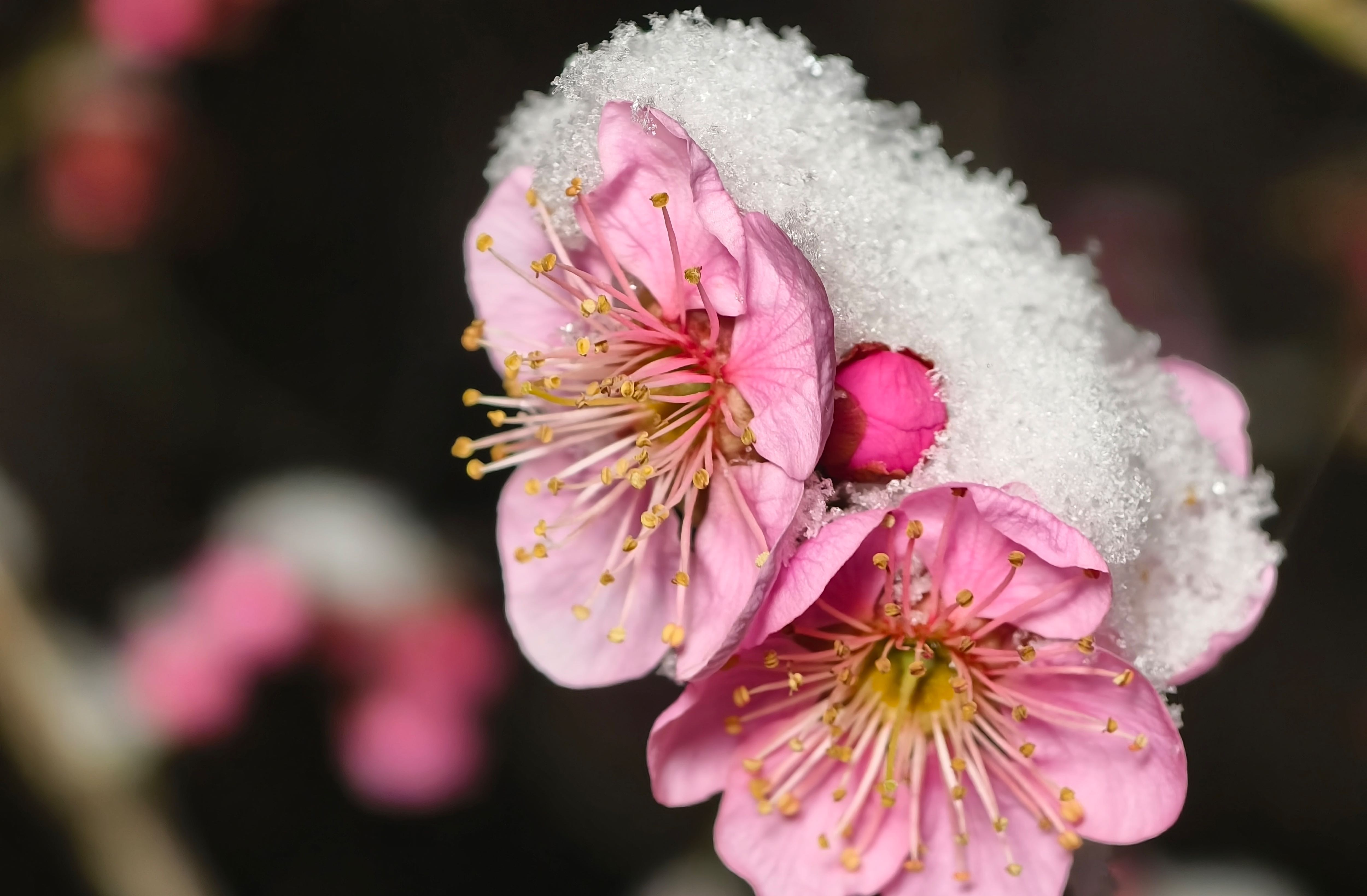 古墙映雪,梅雪争艳,粉白花瓣与银雪、沧桑城垣相映成趣。