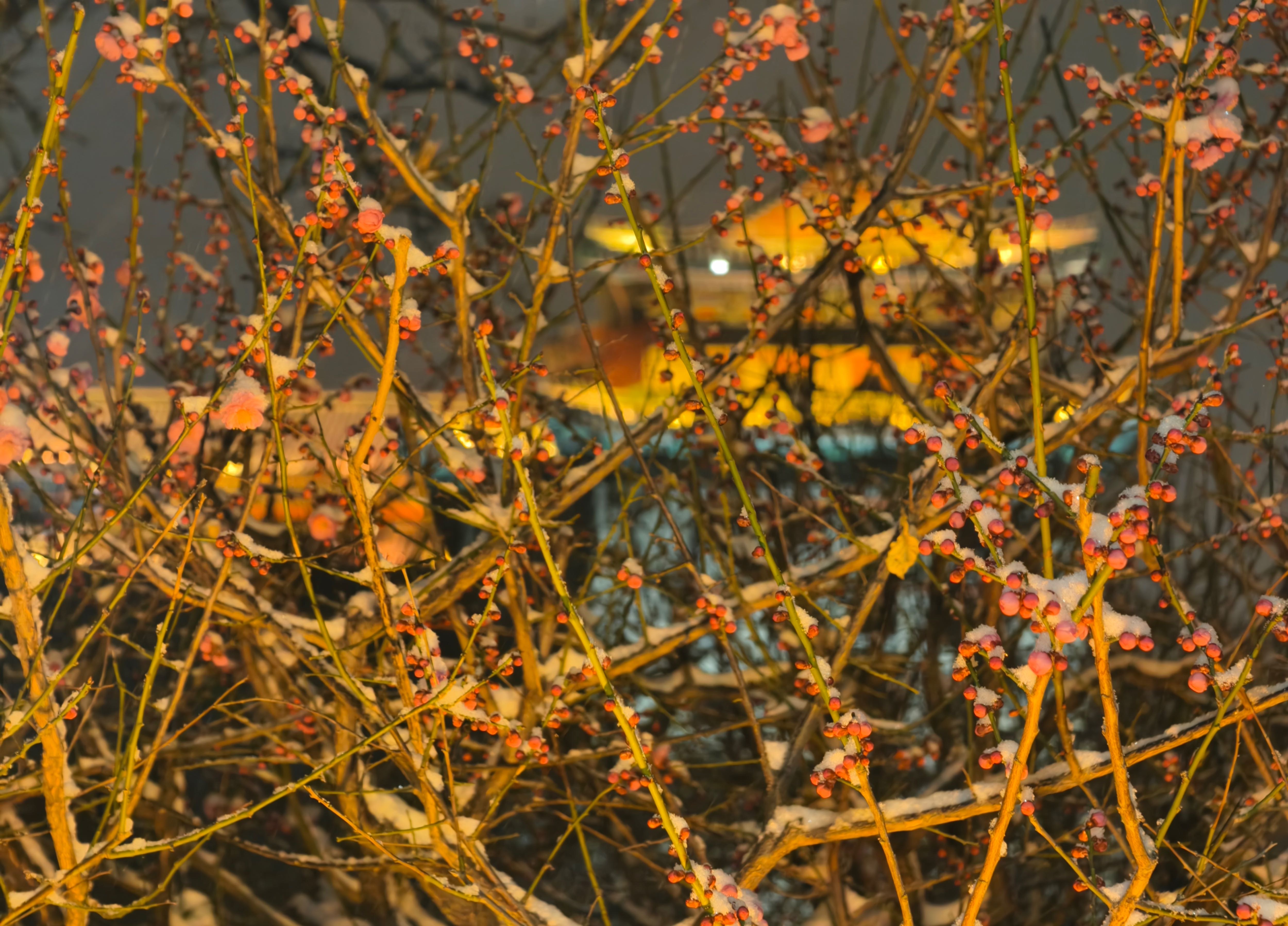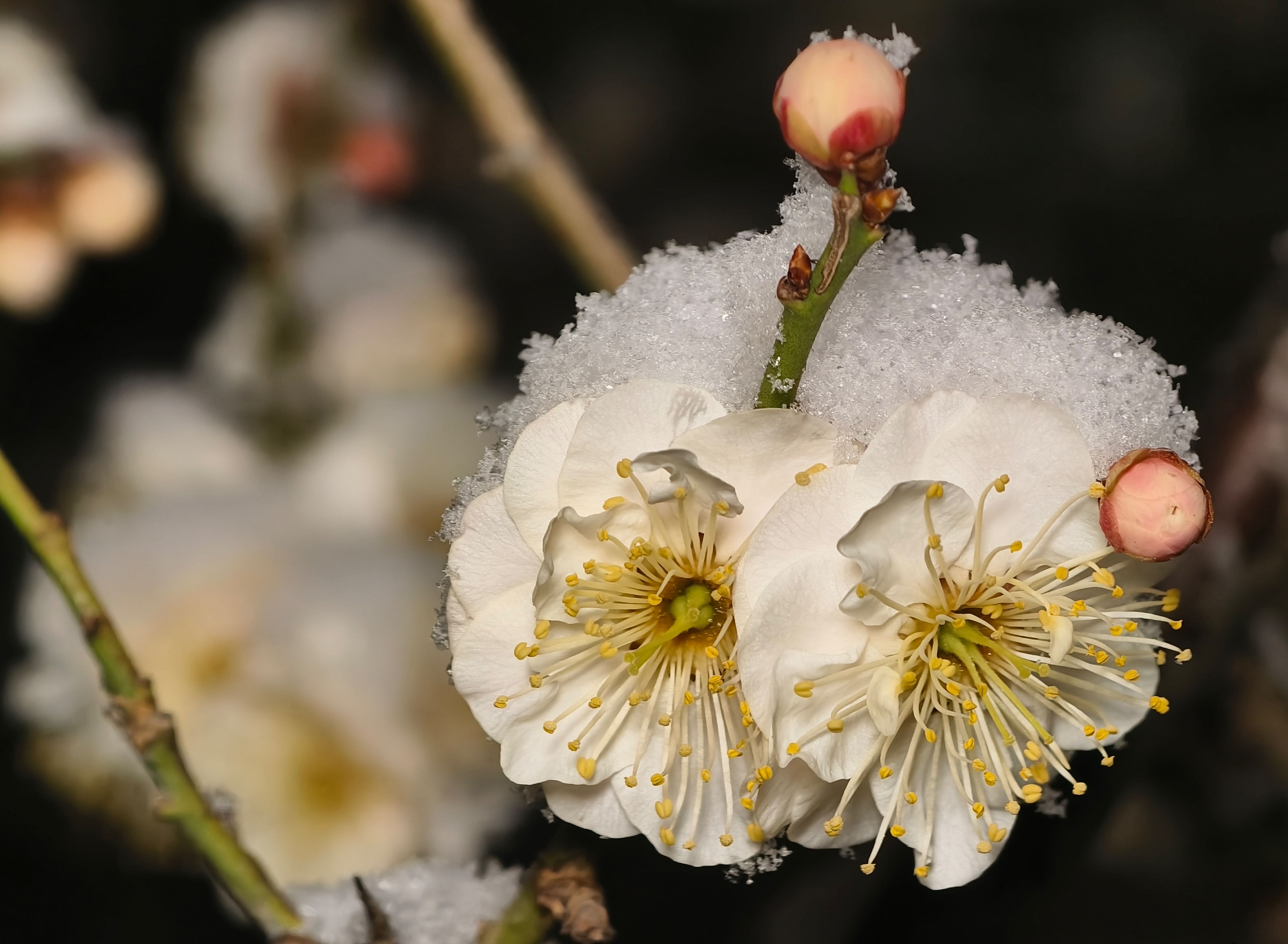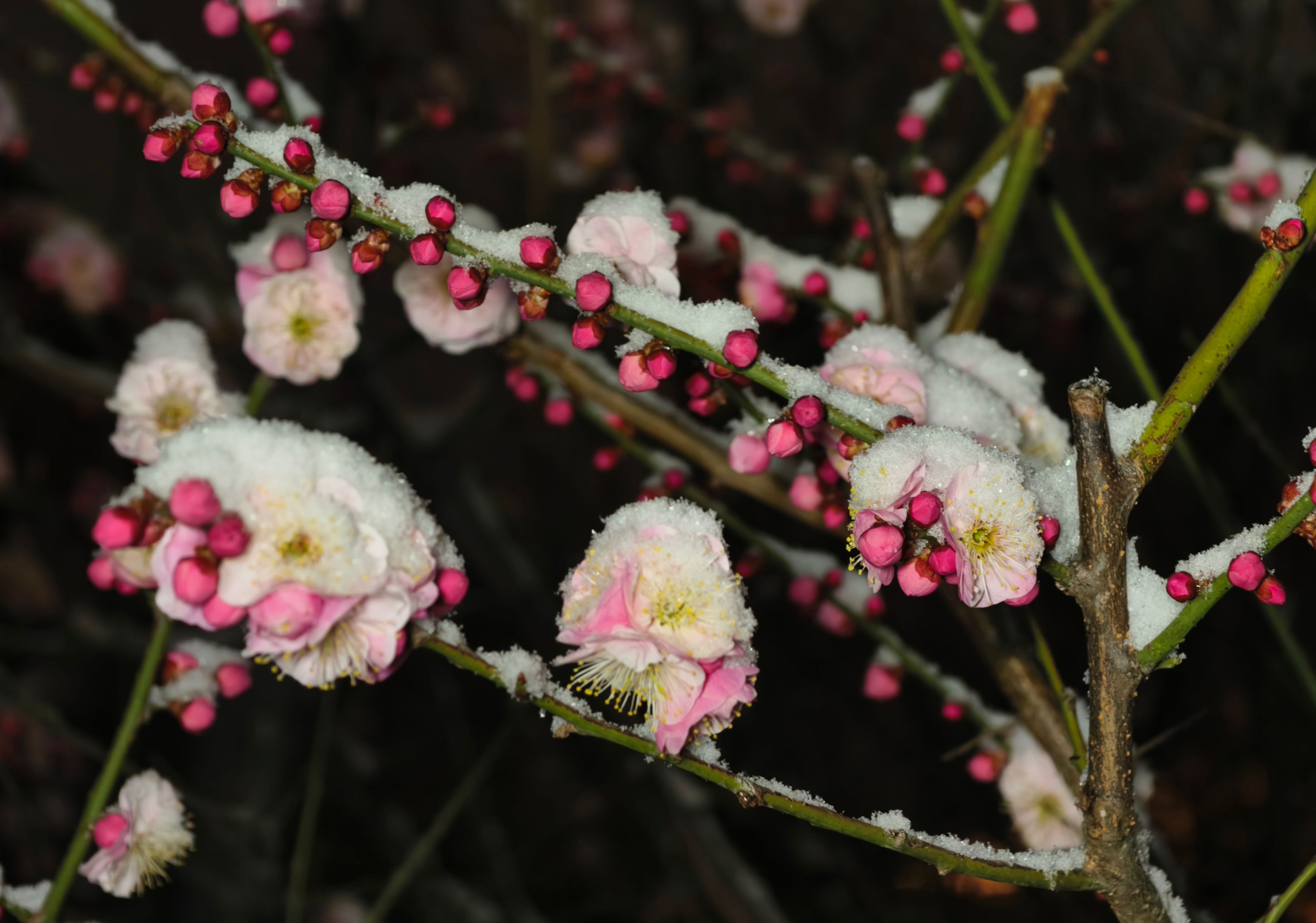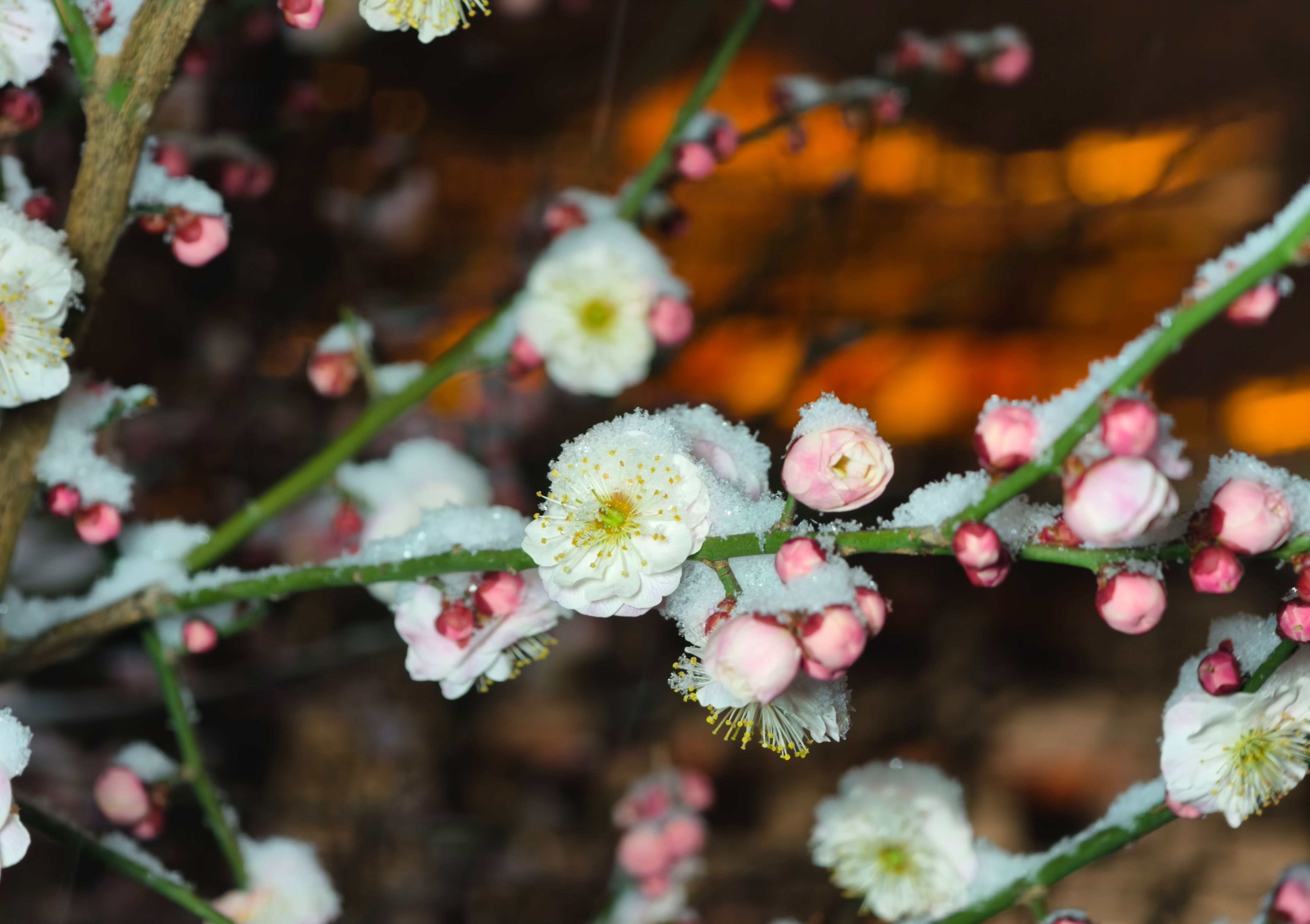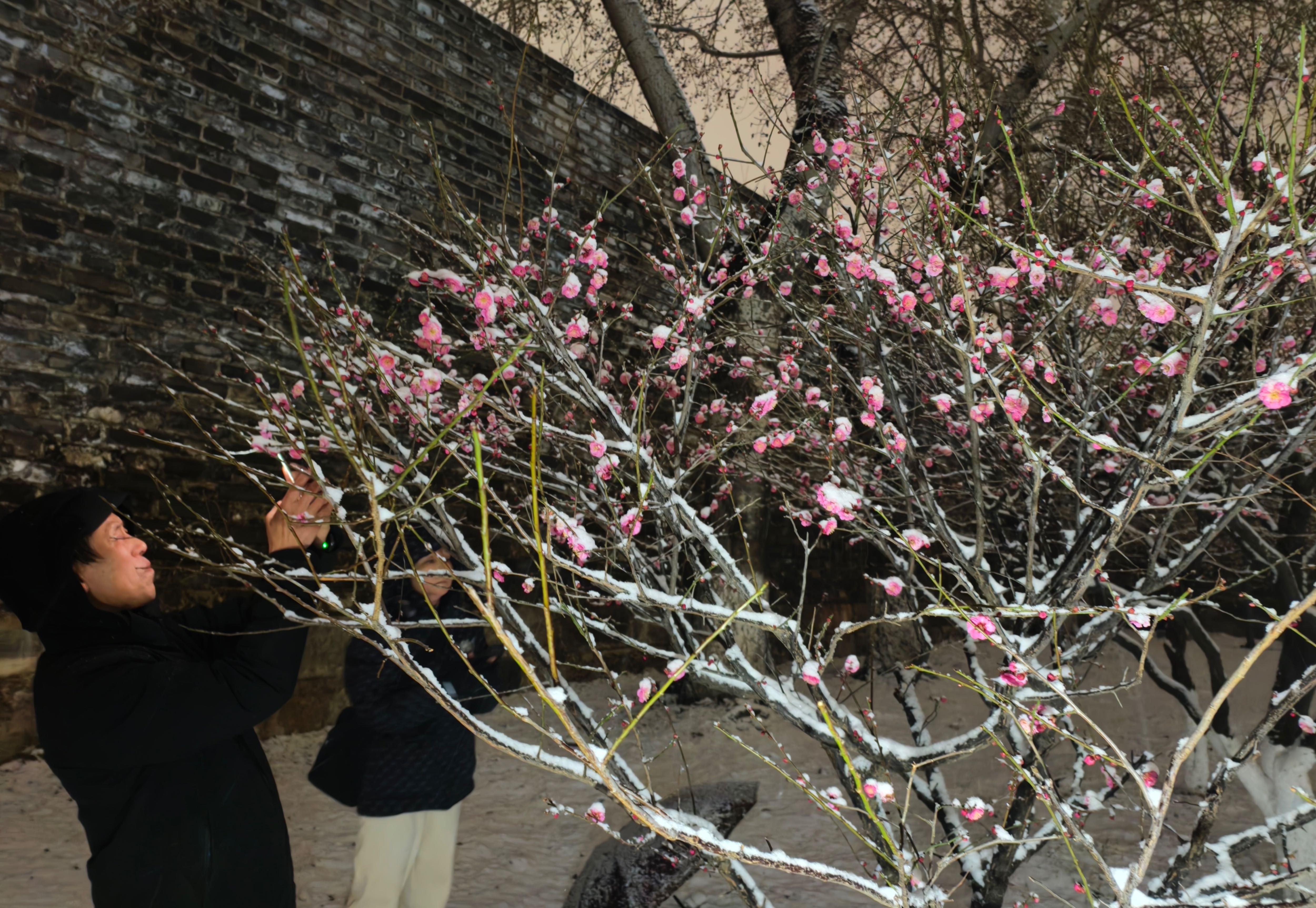 3月4日,北京迎来早春瑞雪。明城墙遗址公园内,梅花迎雪绽放,白雪覆枝、暗香浮动,呈现春梅傲雪的诗意盛景,吸引众多市民踏雪夜赏。