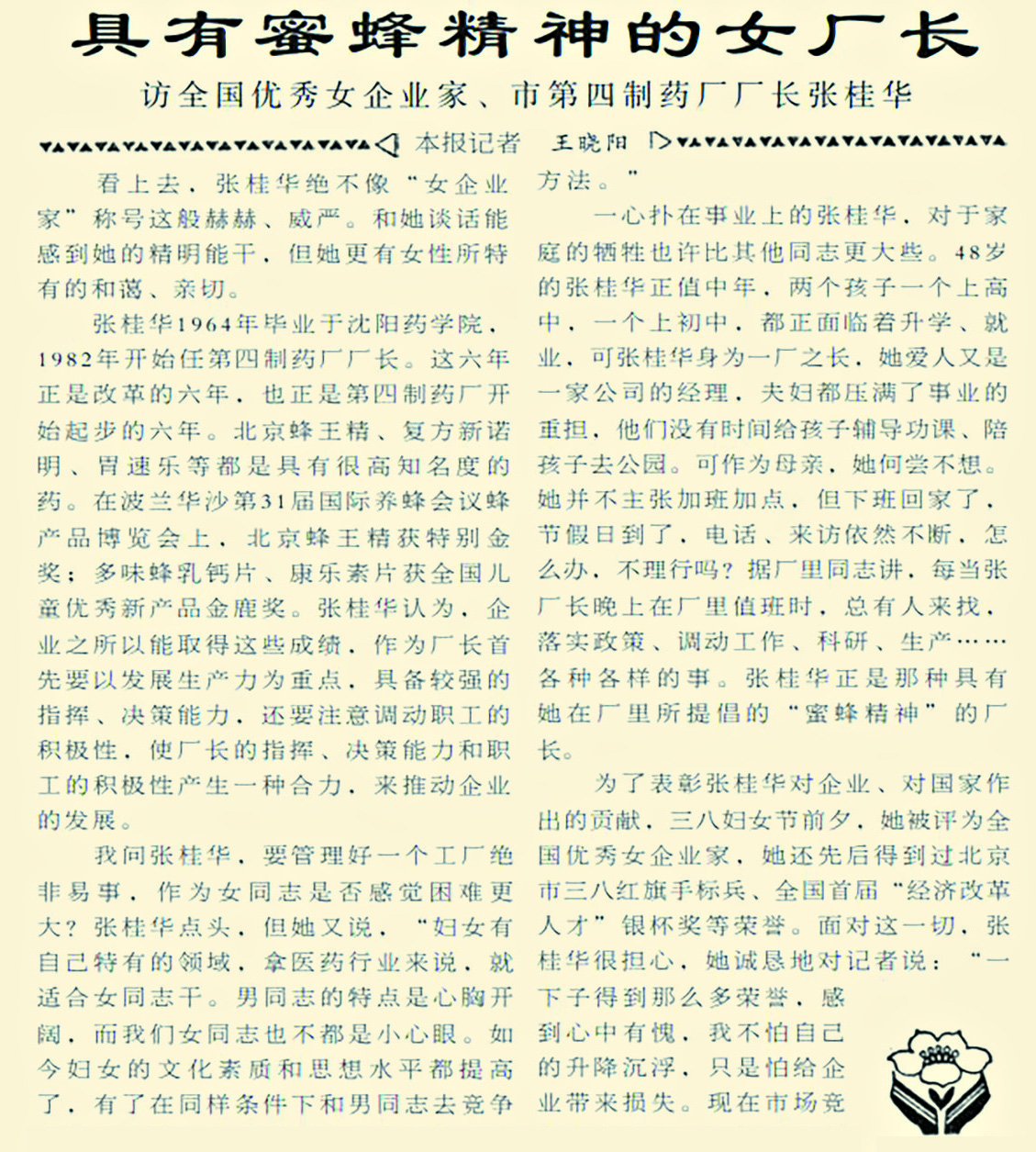 北京第四制药厂厂长张桂华上任后,带领全厂以发展生产力为核心,巧妙地将厂长的决策力与职工的积极性凝聚成强大合力,不仅显著提高了职工收入,更推动研发了“北京蜂王精”等荣获国际金奖的知名产品。张桂华因此荣获北京市三八红旗手标兵等荣誉,其管理实践体现了改革初期调动“人”的积极性以释放企业活力的鲜明时代特征。(1988年3月8日《北京晚报》1版,《具有蜜蜂精神的女厂长》)