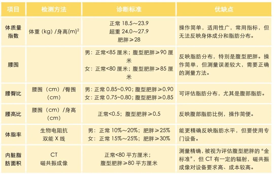 此外,腰围、腰臀比、腰高比、体脂率和内脏脂肪面积等,也是常见的健康评估指标。这些指标能够帮助我们更全面地了解身体脂肪的含量及其分布情况。以下表格展示了中国人群肥胖症的常用诊断标准。