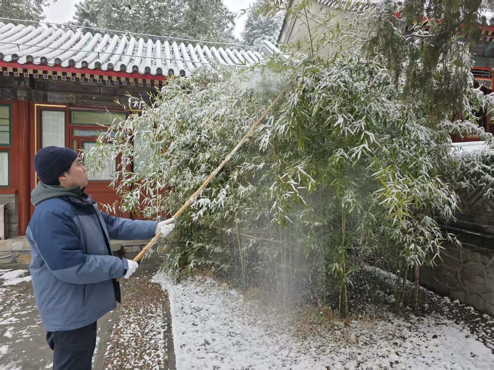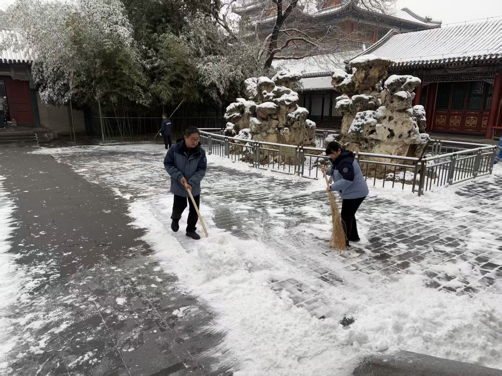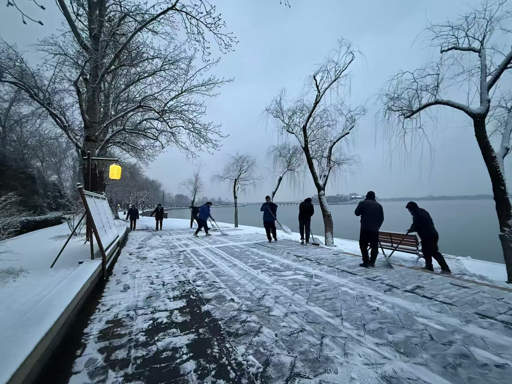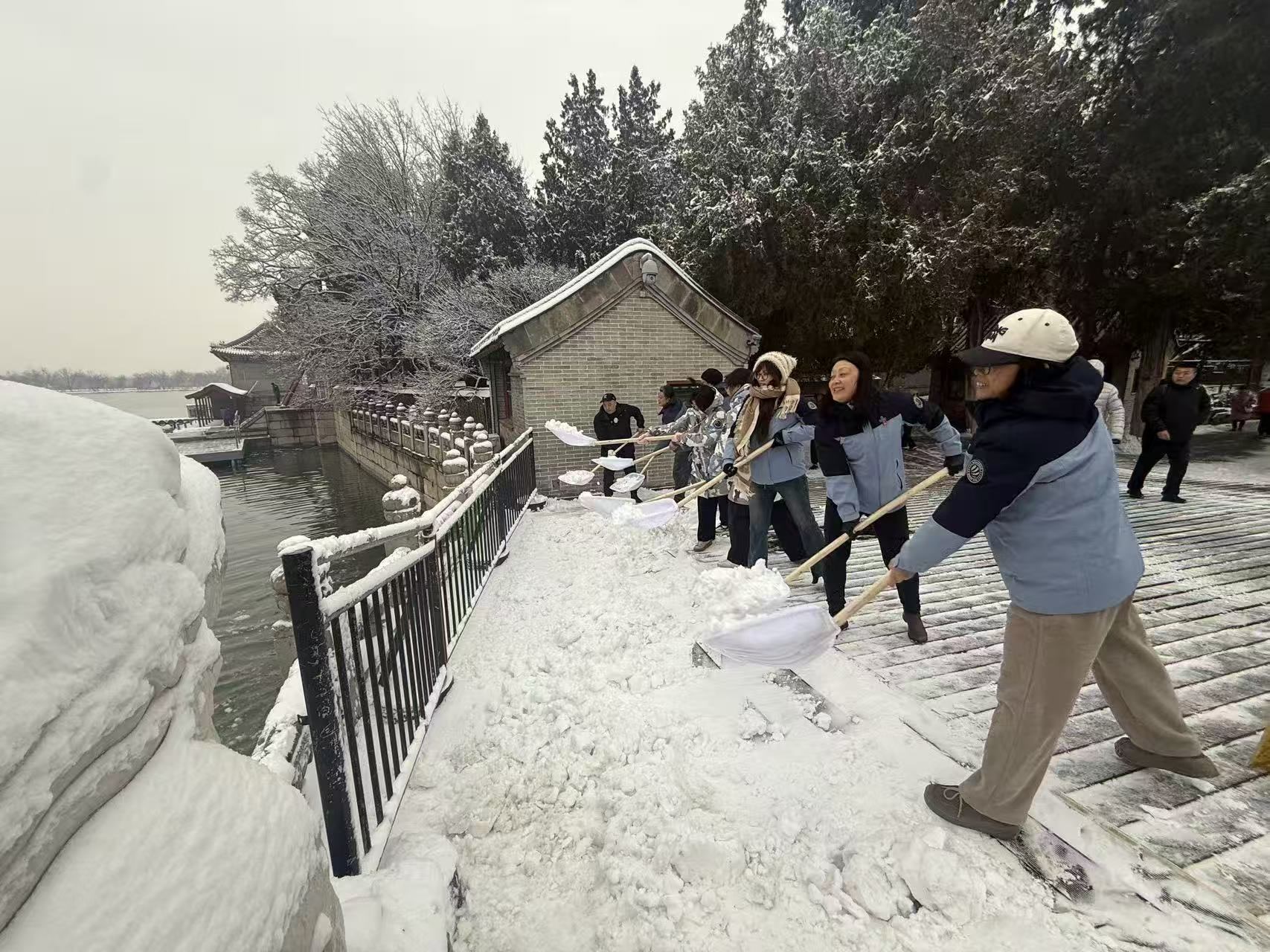 天还没有大亮,昆明湖畔、古建回廊间便处处可见职工忙碌的身影。有人推着清雪机清除积雪;更多的人手持铁锹、雪铲躬身除雪,细致清理步道积雪与薄冰。职工们以雪为令、闻雪而动,守护着每一位游客的赏景之旅。