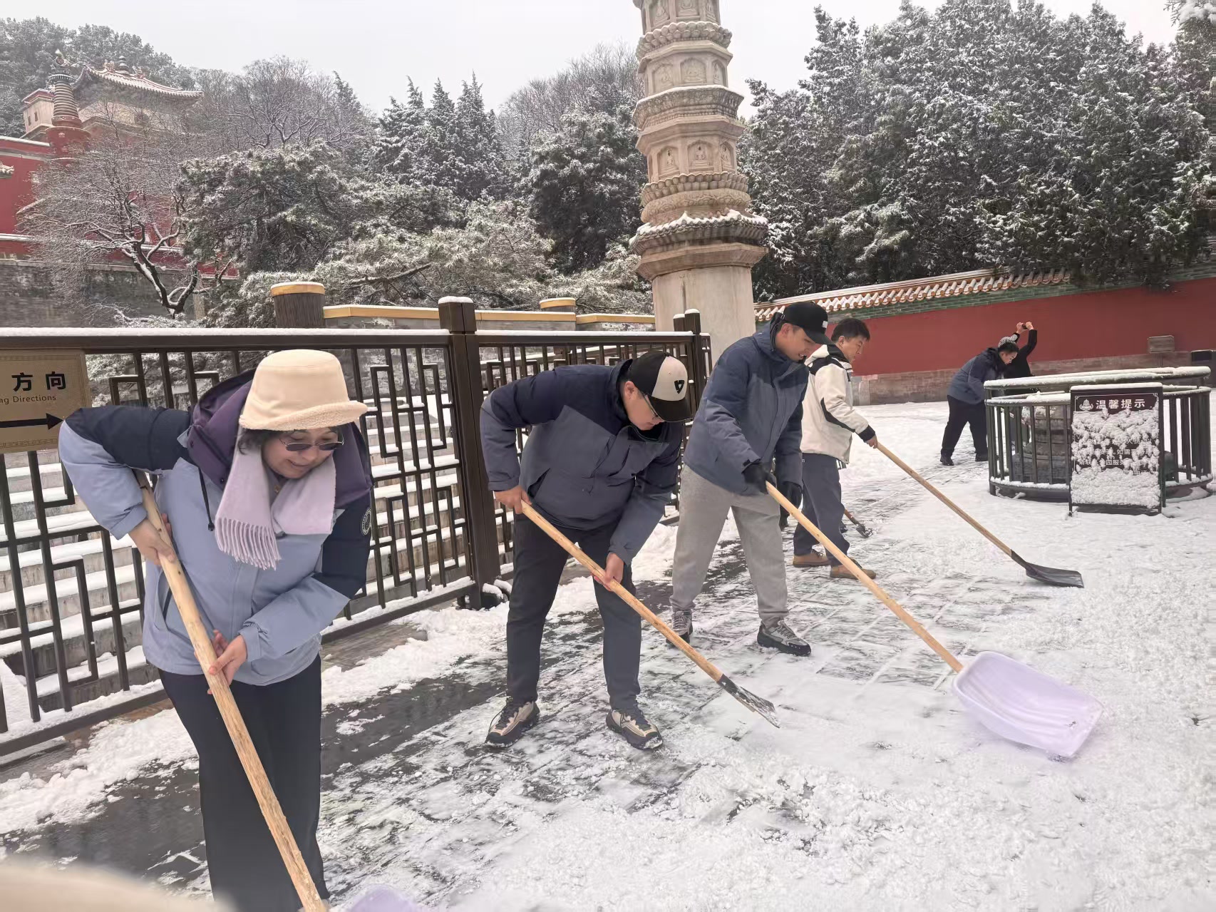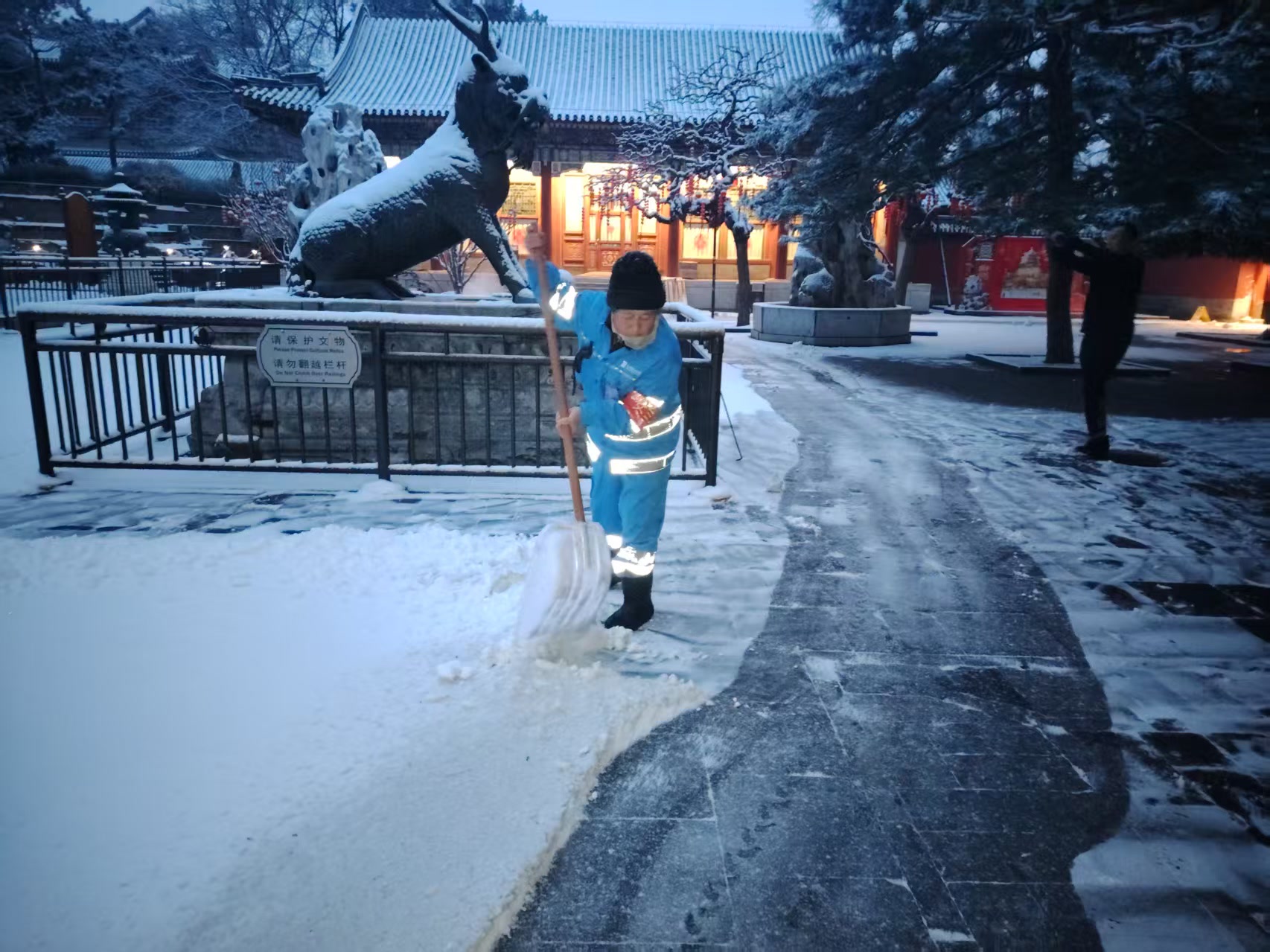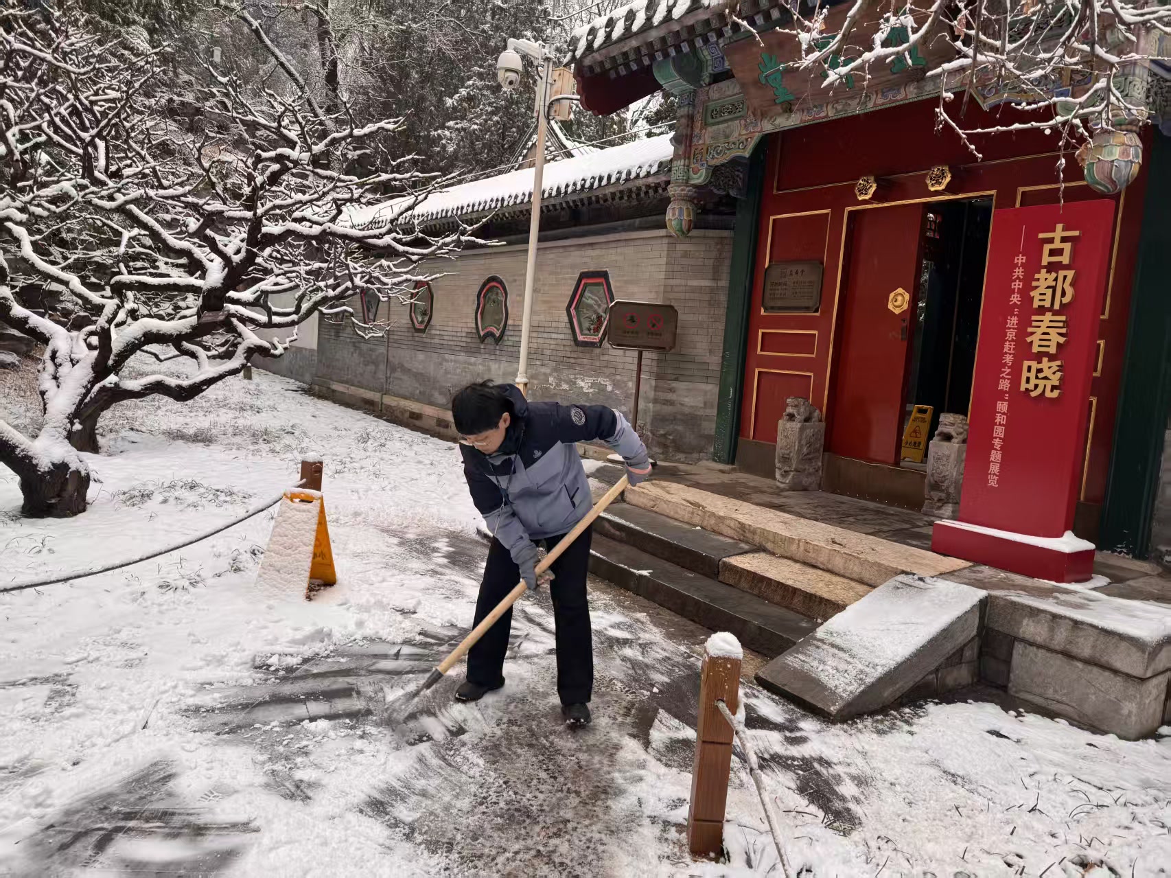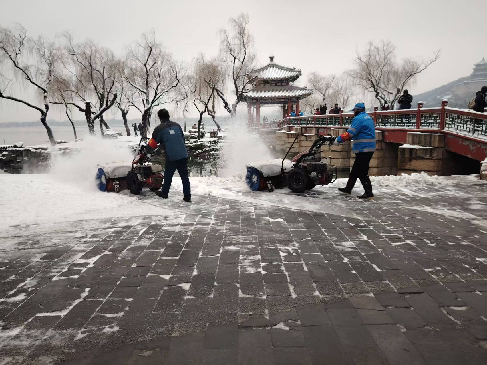 天还没有大亮,昆明湖畔、古建回廊间便处处可见职工忙碌的身影。有人推着清雪机清除积雪;更多的人手持铁锹、雪铲躬身除雪,细致清理步道积雪与薄冰。职工们以雪为令、闻雪而动,守护着每一位游客的赏景之旅。