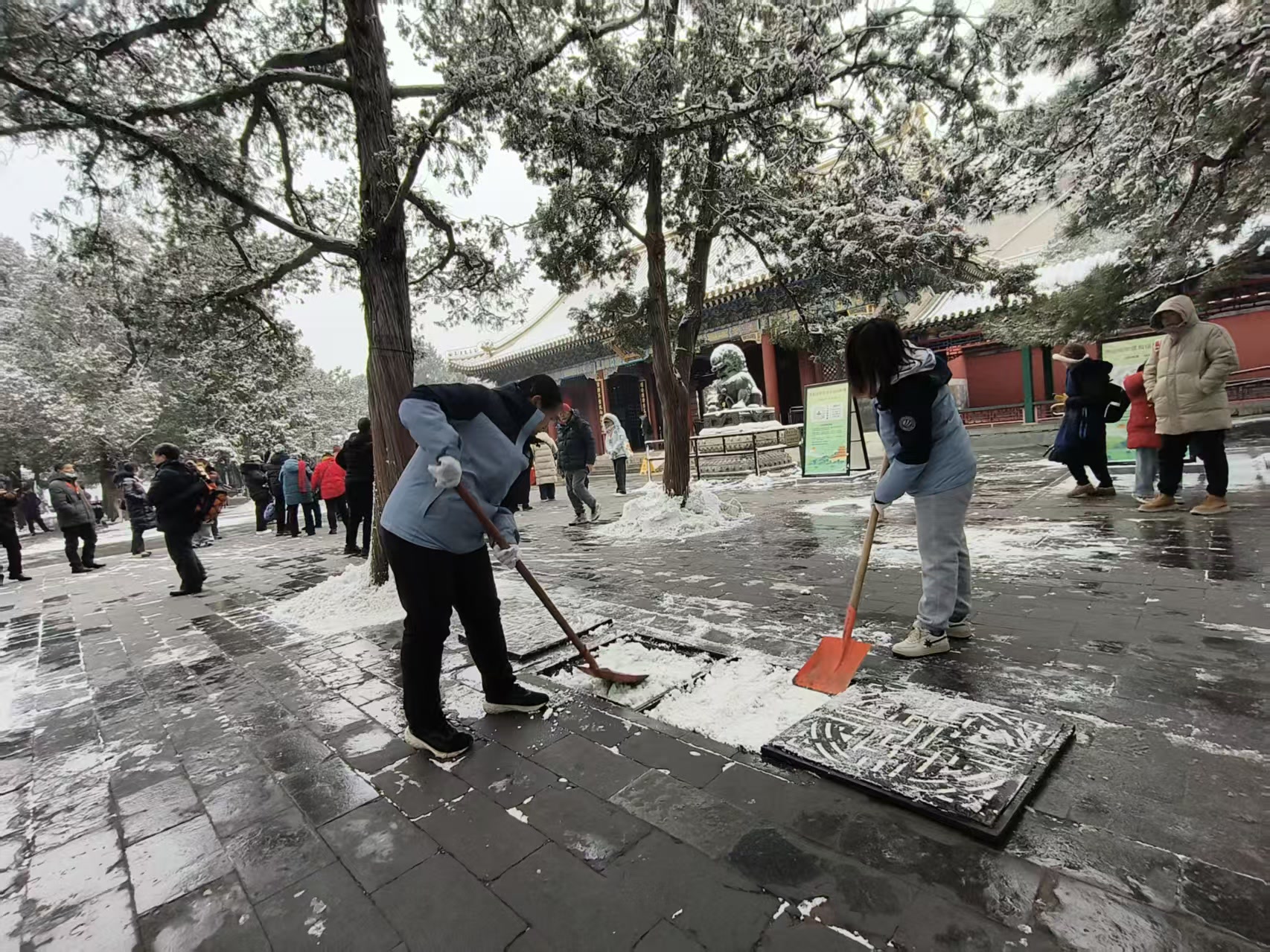 一场大雪过后,颐和园银装素裹,宛若仙境。美景吸引了大量游客,却也给游园安全带来一定挑战。园区职工迅速行动,开启 “清雪模式”。