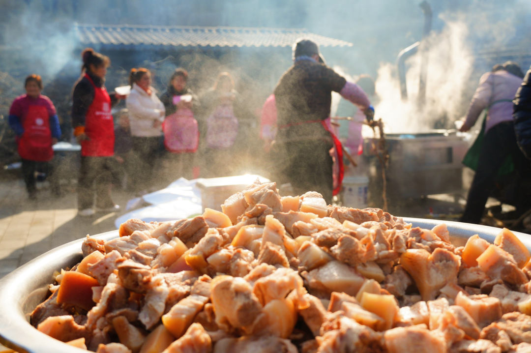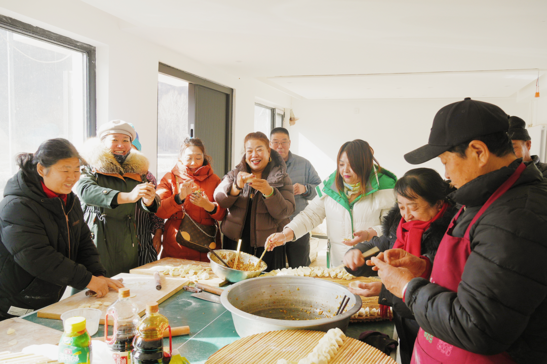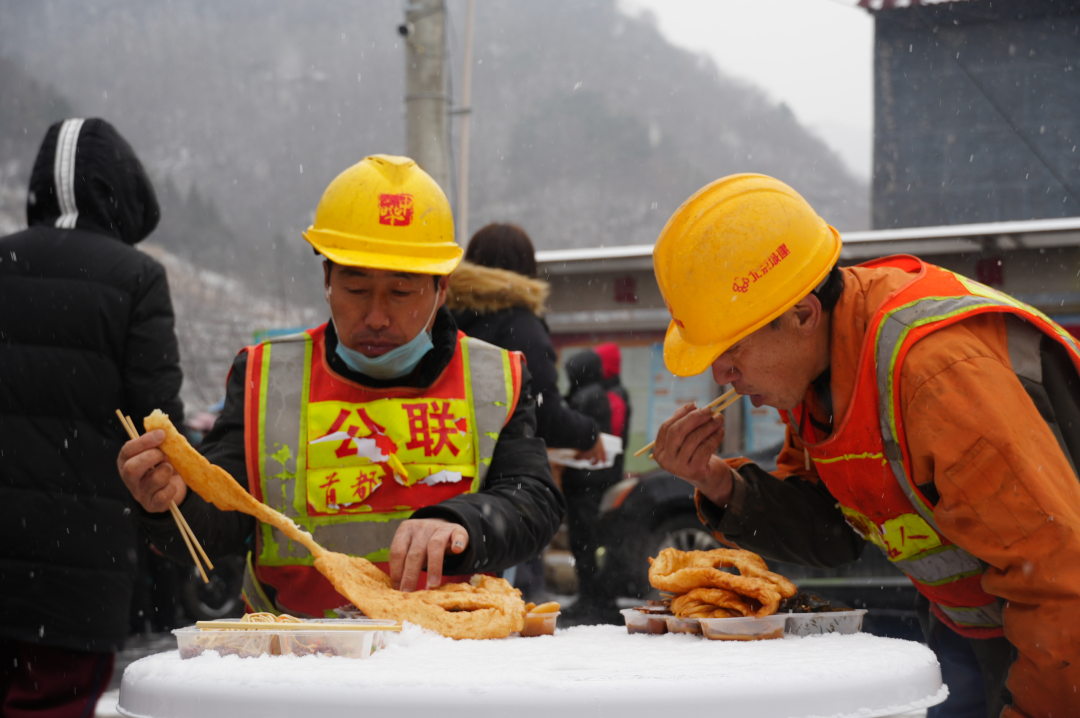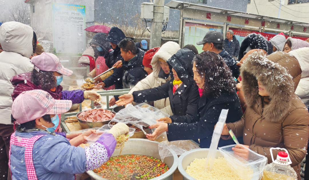 在鱼水洞村,开席时分,鹅毛大雪翩然而至。刚出锅的油饼金黄酥脆,炖肉香气四溢,驱散了落雪的寒意。村里还特意请来了特殊的“亲人”——区国资公司。自去年洪水后,区国资公司便定期进村帮扶,每两周一次,从恢复生活秩序到提升村内环境,一件件实事、一点点改善,把帮扶变成了长久的相伴。大雪纷飞中,一碗热饭、一句问候,把客人变成了自家人。