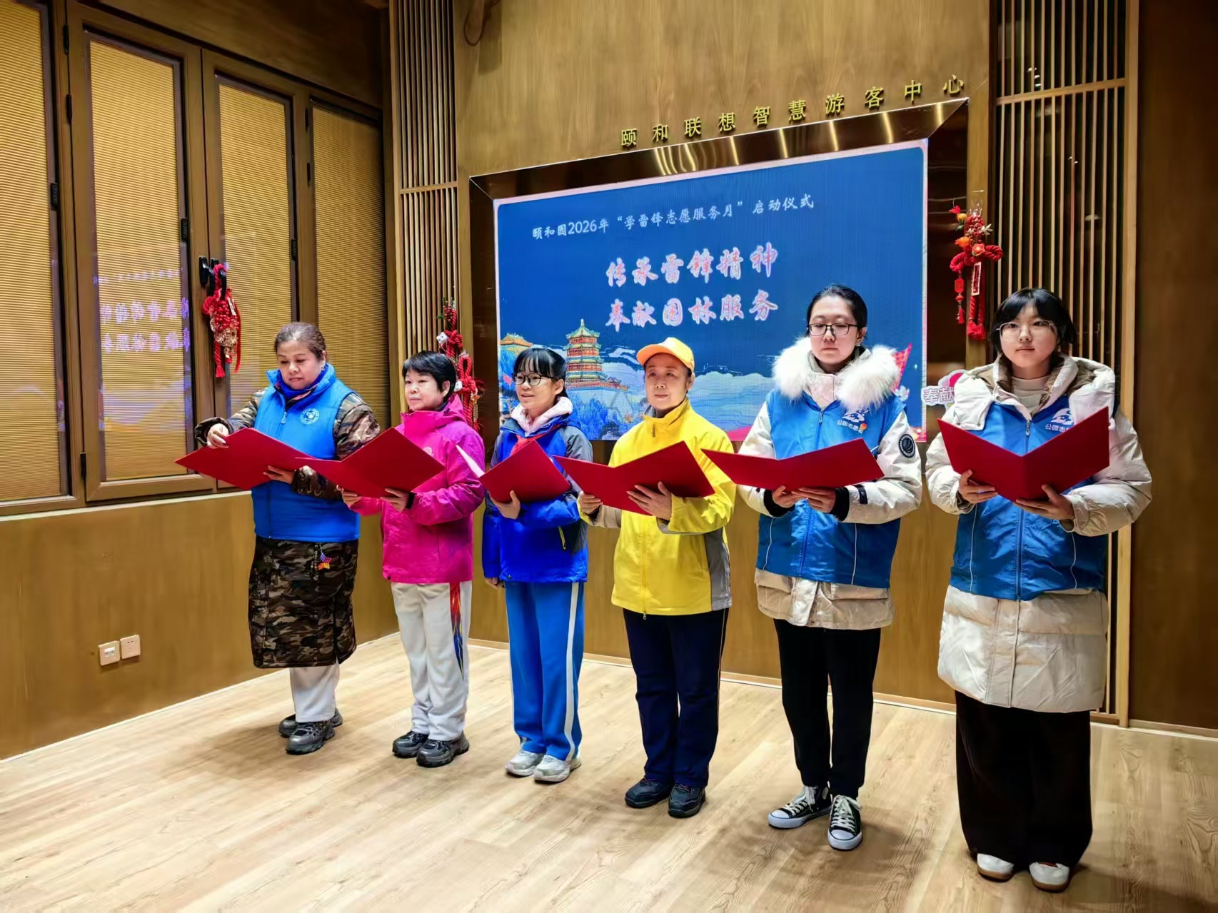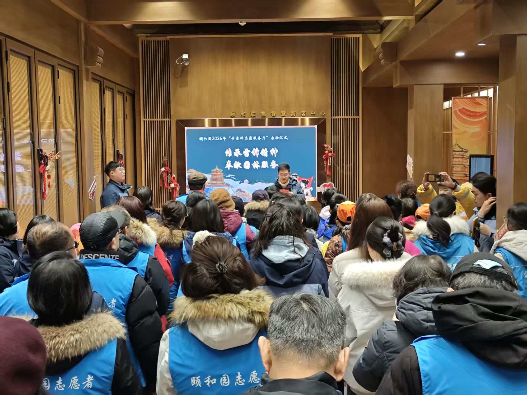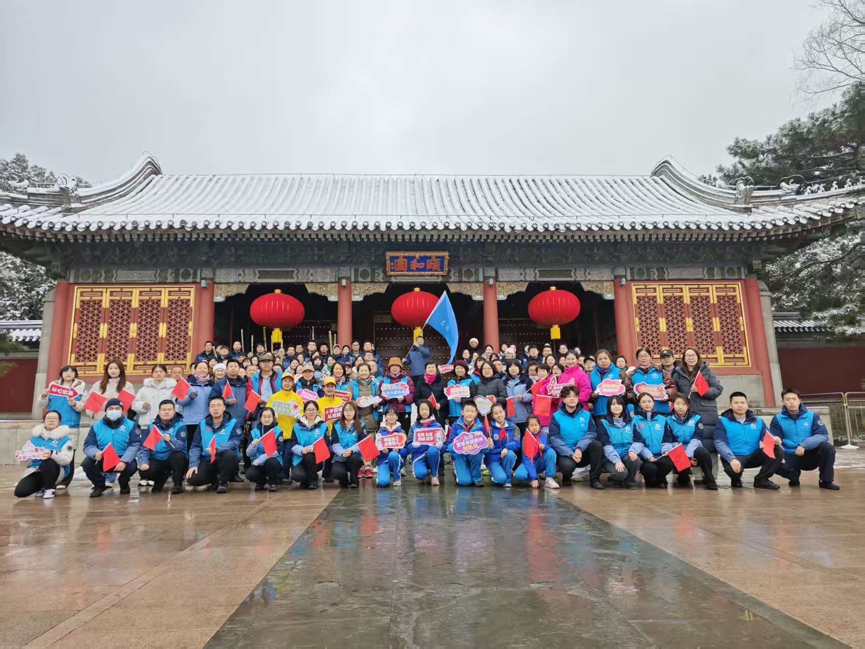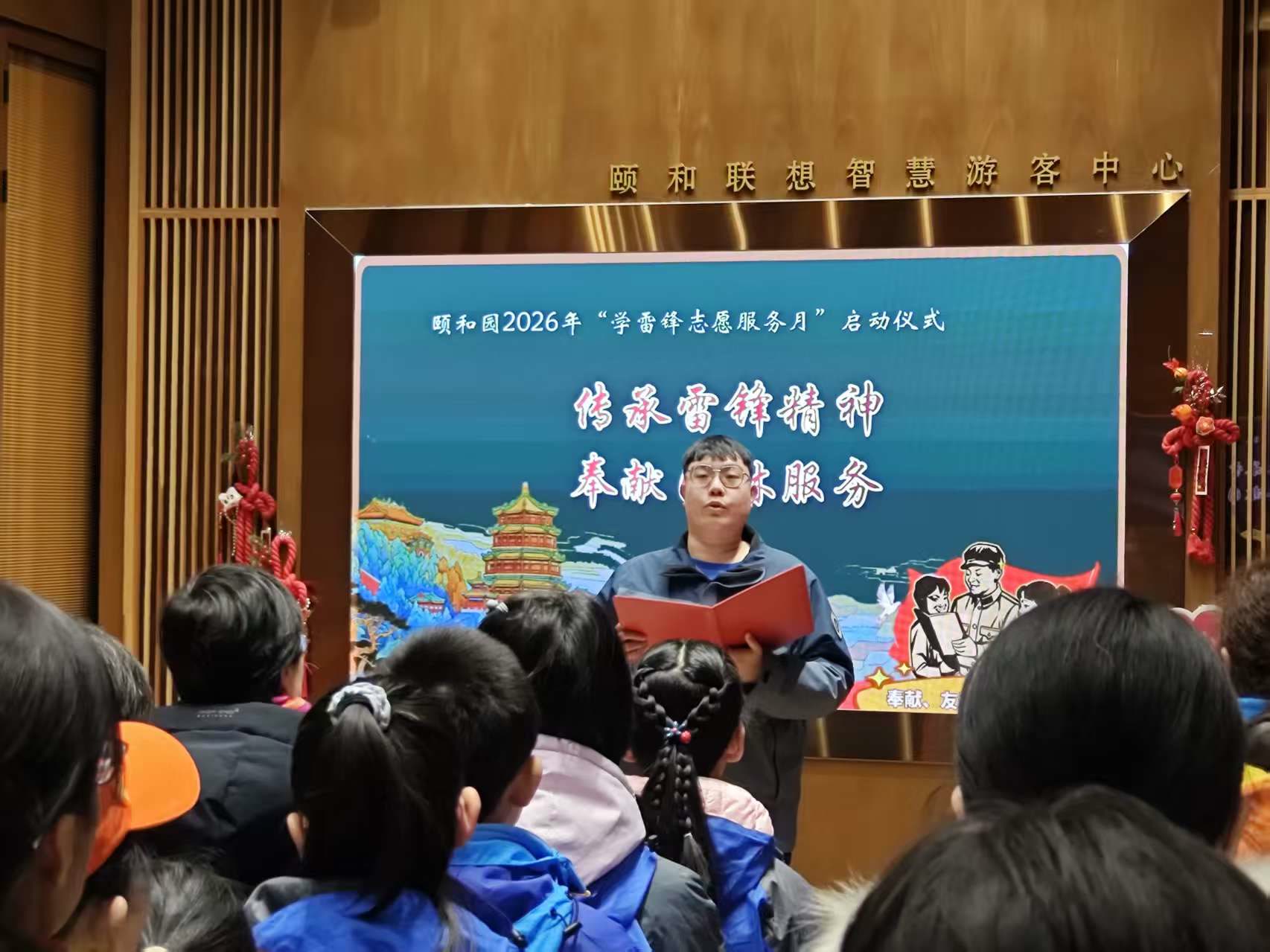 随着宣布颐和园学雷锋志愿服务月正式启动,全体人员移步东宫门广场,共唱《学习雷锋好榜样》,嘹亮的歌声回荡在传统园林上空。合影留念后,新老志愿者携手为游客提供讲解引导服务,用实际行动践行雷锋精神。