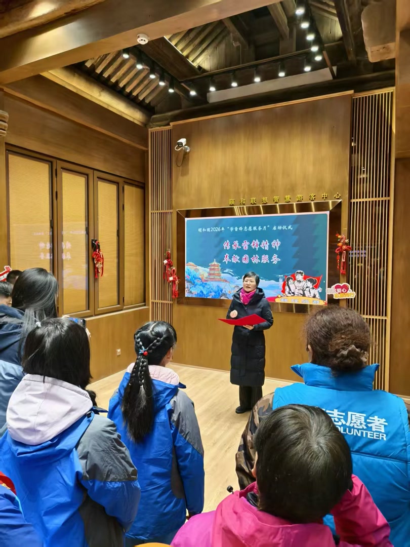 启动仪式在游客服务中心志愿服务站内拉开帷幕。暖场小片里,一幕幕熟悉的画面闪现:东宫门前首都公共文明引导员挥舞小旗疏导客流、青龙桥义务指路队员为游客手绘路线图、“海淀青之光”巾帼志愿者搀扶老人走过石阶……这些常年活跃在园区的志愿服务力量,构成了颐和园独特的“人文风景”。随后,志愿者代表深情朗诵,青年志愿者代表郑杰文分享了参与园林服务的感悟。