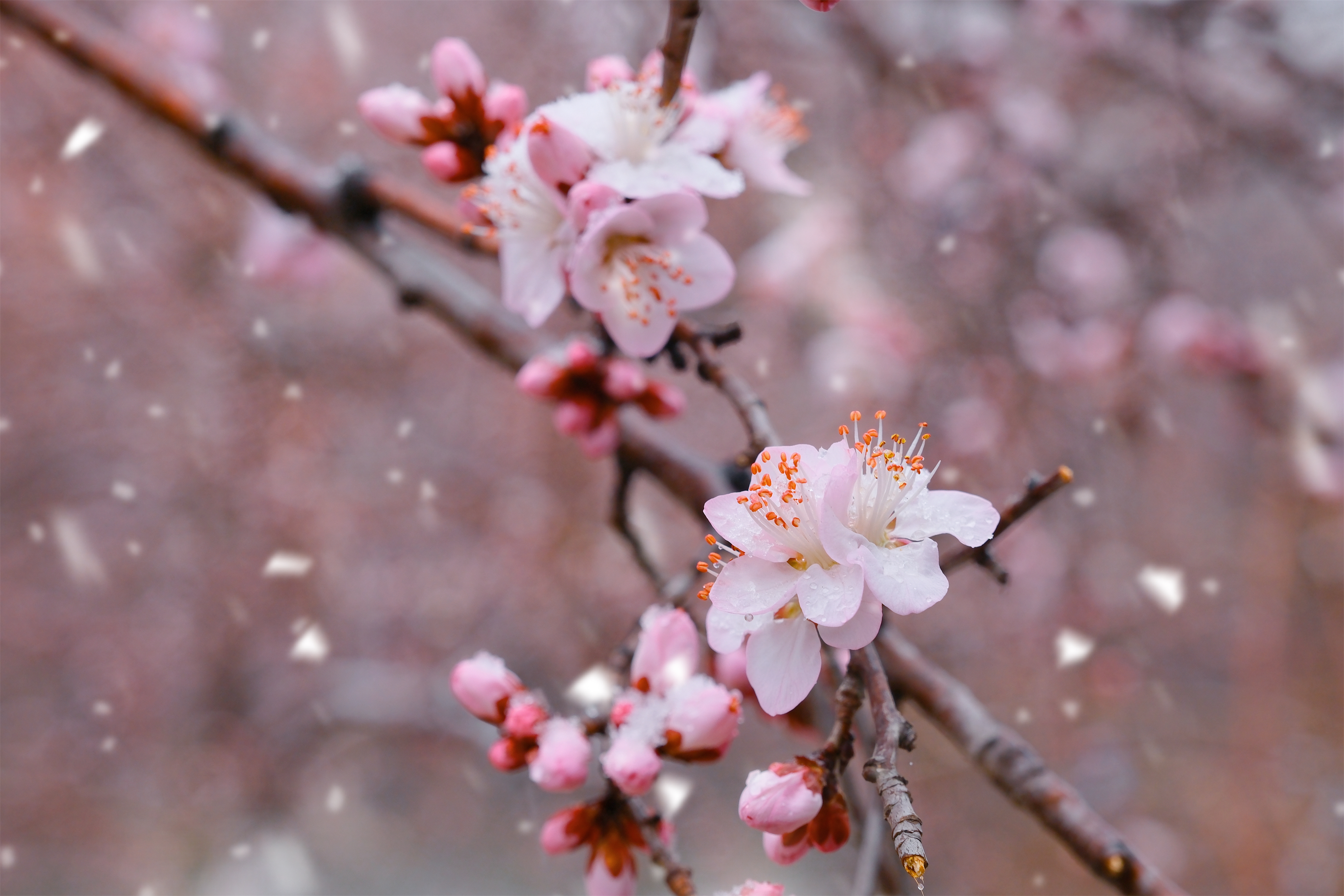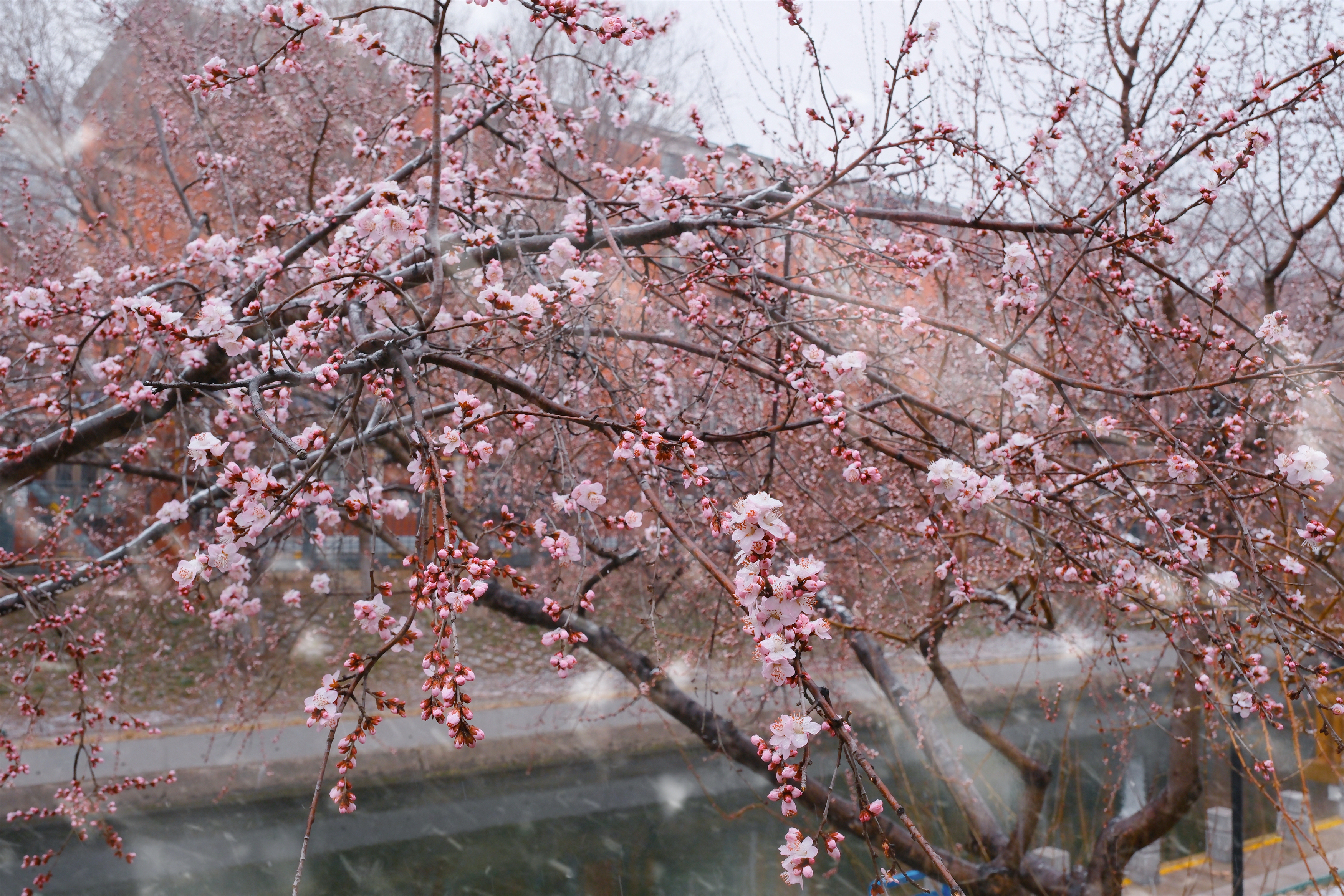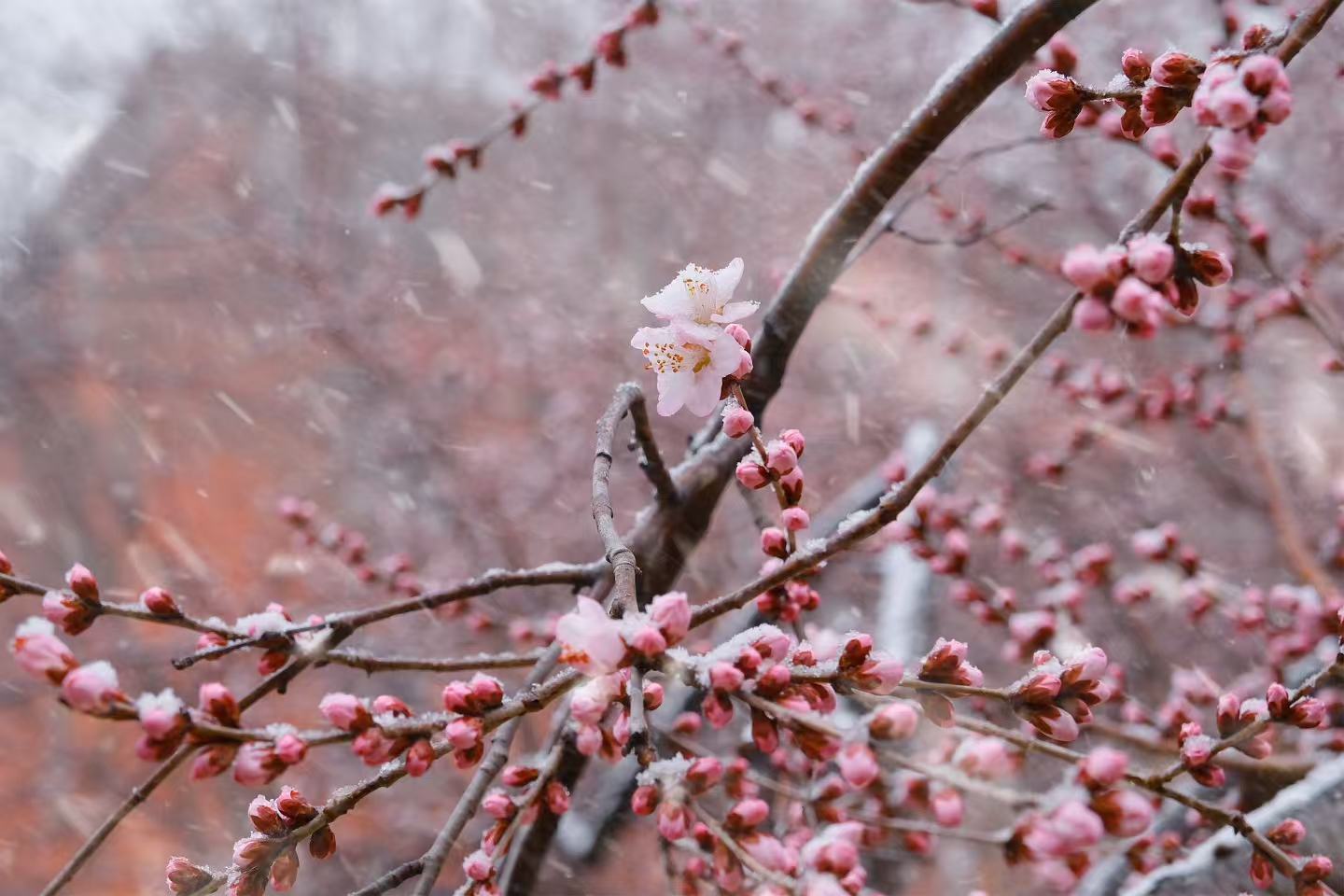 3月4日,京城迎来罕见的春雪。位于朝阳区二道沟边的两株山桃花,在春雪中绽放,粉色的花瓣映着晶莹的白雪,格外娇俏。