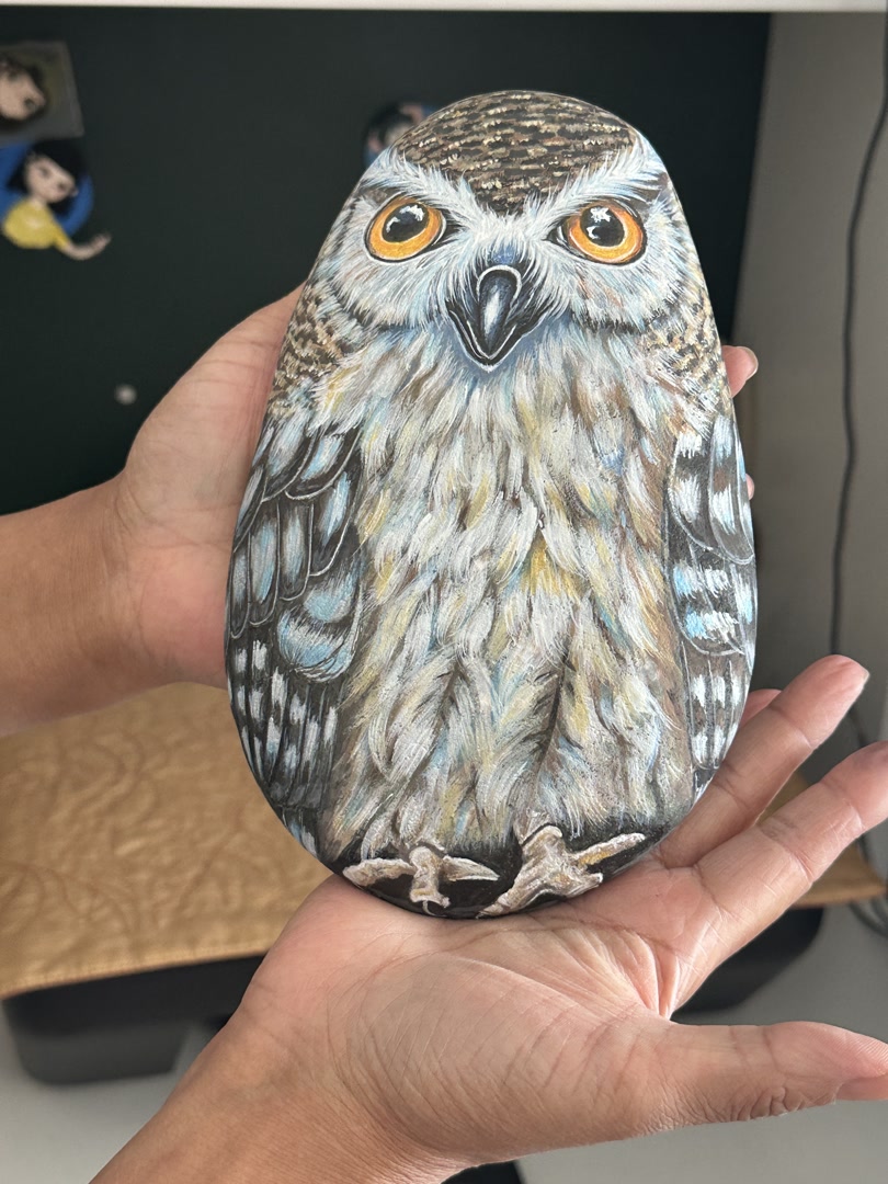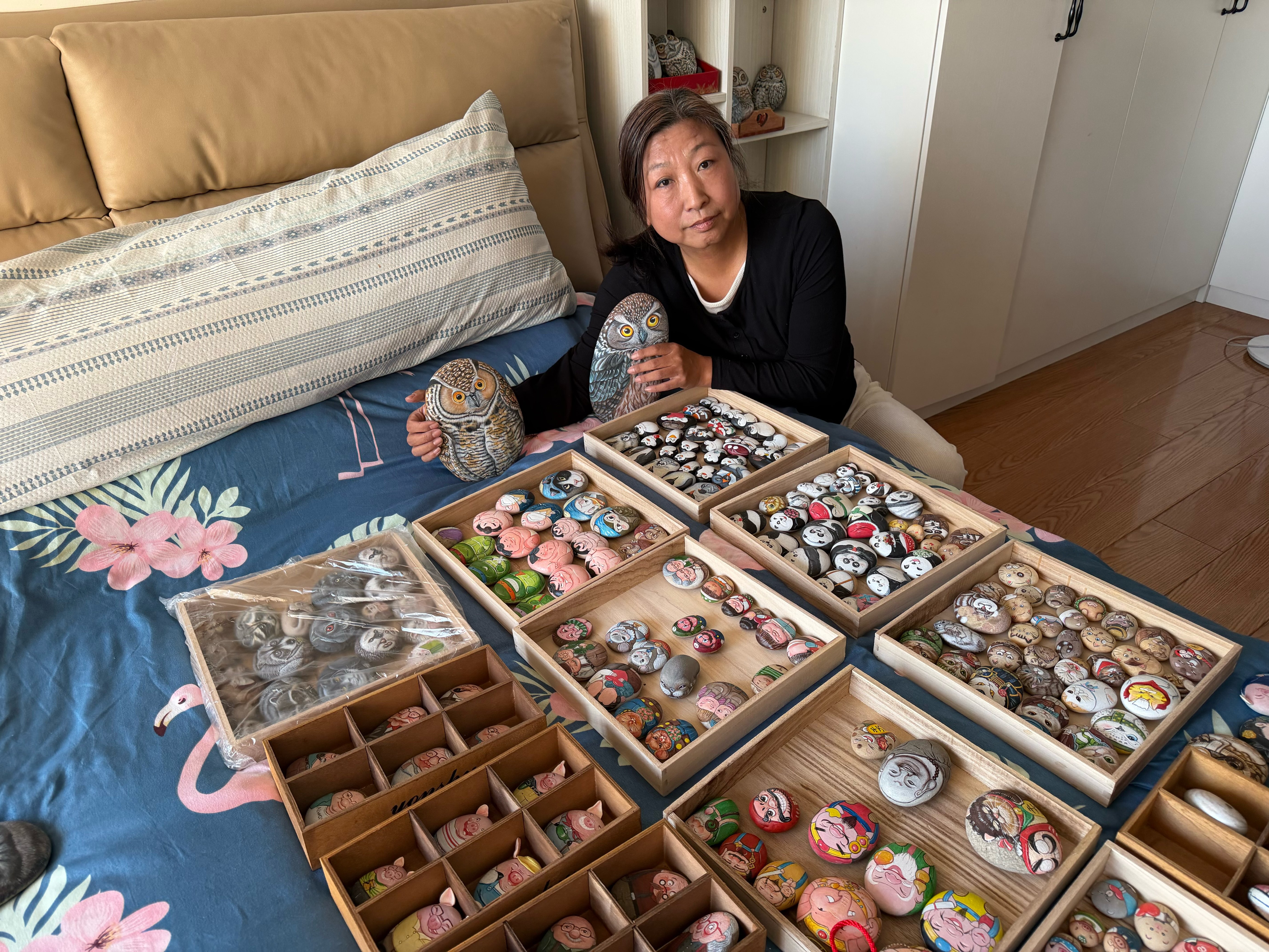 走进郭秀梅的家,她创作的“石头画”摆满了每个角落。桌上,为女儿绘制的“石头画像”眉眼含情;柜子里,石头上的小动物活灵活现,瓜果梨桃等“美食”栩栩如生;卧室靠窗的四层架子上,摆满了形态各异的猫头鹰……家里但凡能储物的地方,都藏着她的作品。构思、用铅笔勾勒草稿、上色、修饰细节……平日里,郭秀梅总爱埋头坐在桌前的石头堆里,用她的巧手,将一块块原本平平无奇的石头“点石成花”, 赋予它们全新的生命。