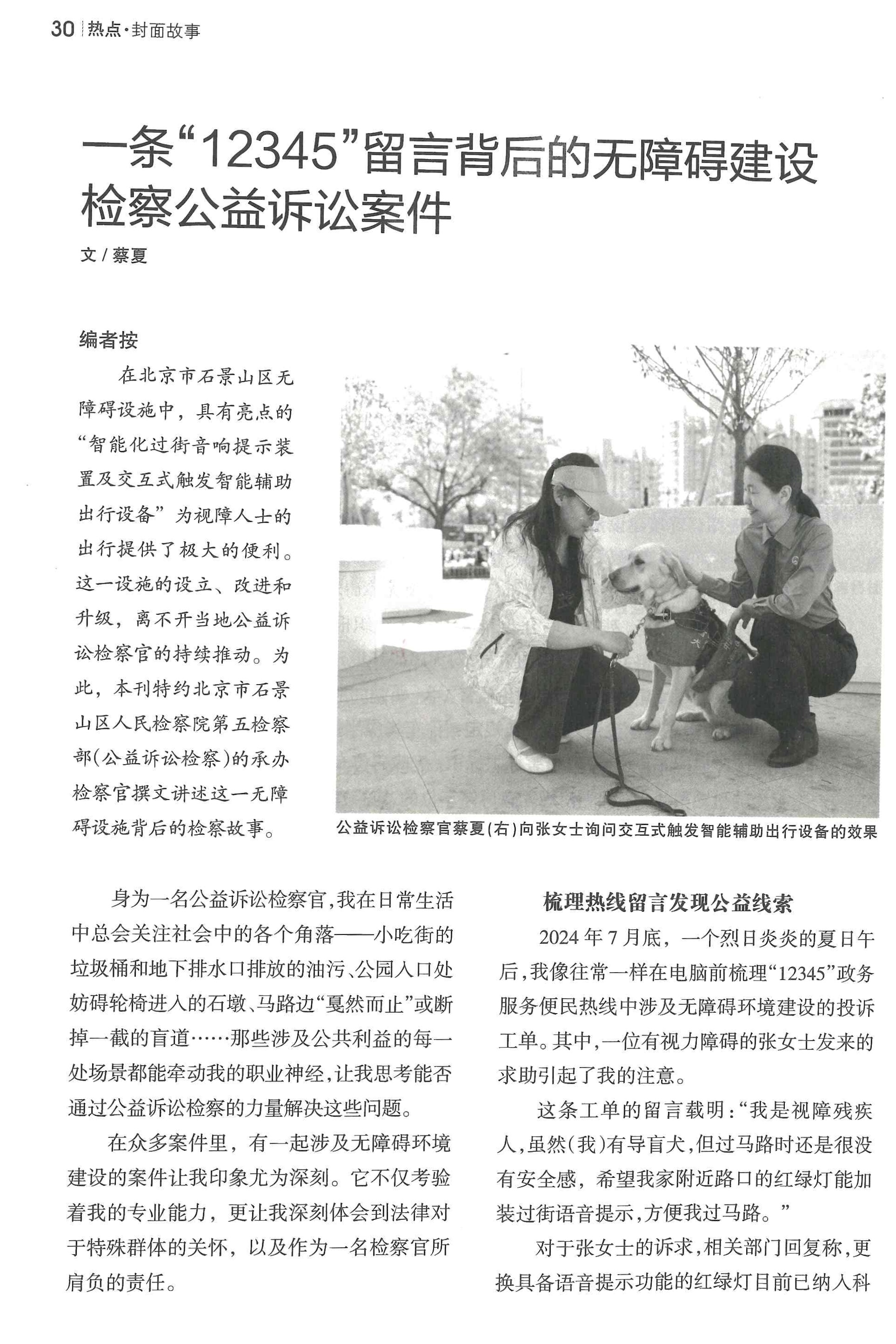 杂志同时以“一条‘12345’留言背后的无障碍建设检察公益诉讼案件”为题,聚焦我区通过检察公益诉讼推动无障碍设施完善的典型案例:从群众一条诉求出发,以法治力量推动问题解决、促进系统治理,生动展现了我区以群众需求为导向、多部门协同推进无障碍环境建设的成功实践。未来,石景山区残联将持续巩固提升无障碍环境建设成果,不断强化设施建设,优化服务供给,加强监督管理,让“有爱无碍”融入城市血脉,让更多特殊群体共享城市发展成果,切实增强人民群众的获得感幸福感安全感。