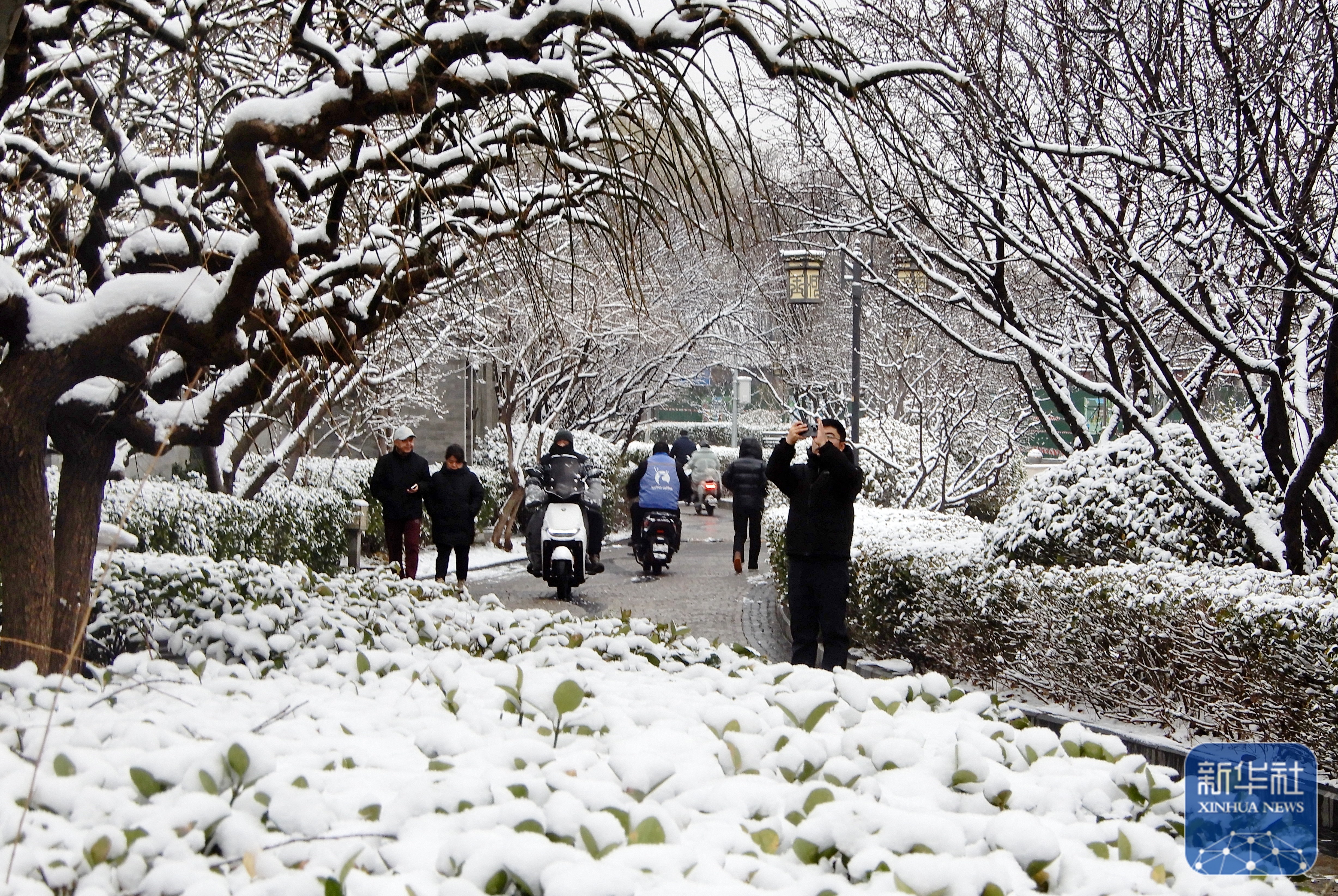 ↑ 3月5日,行人在北京宣武门西大街路边拍摄雪景。