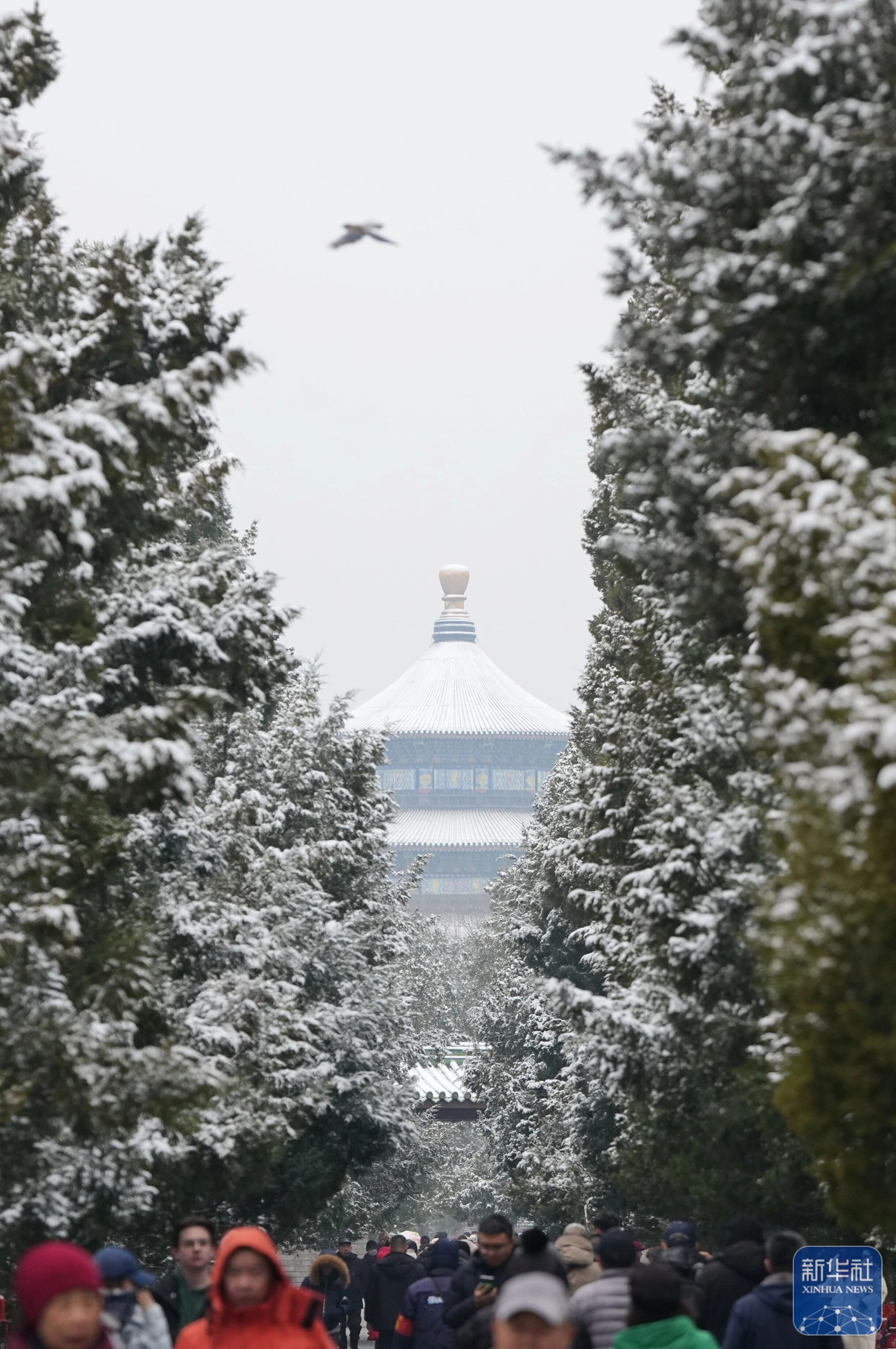 ↑ 3月5日,游客在雪后的北京天坛公园参观游览。