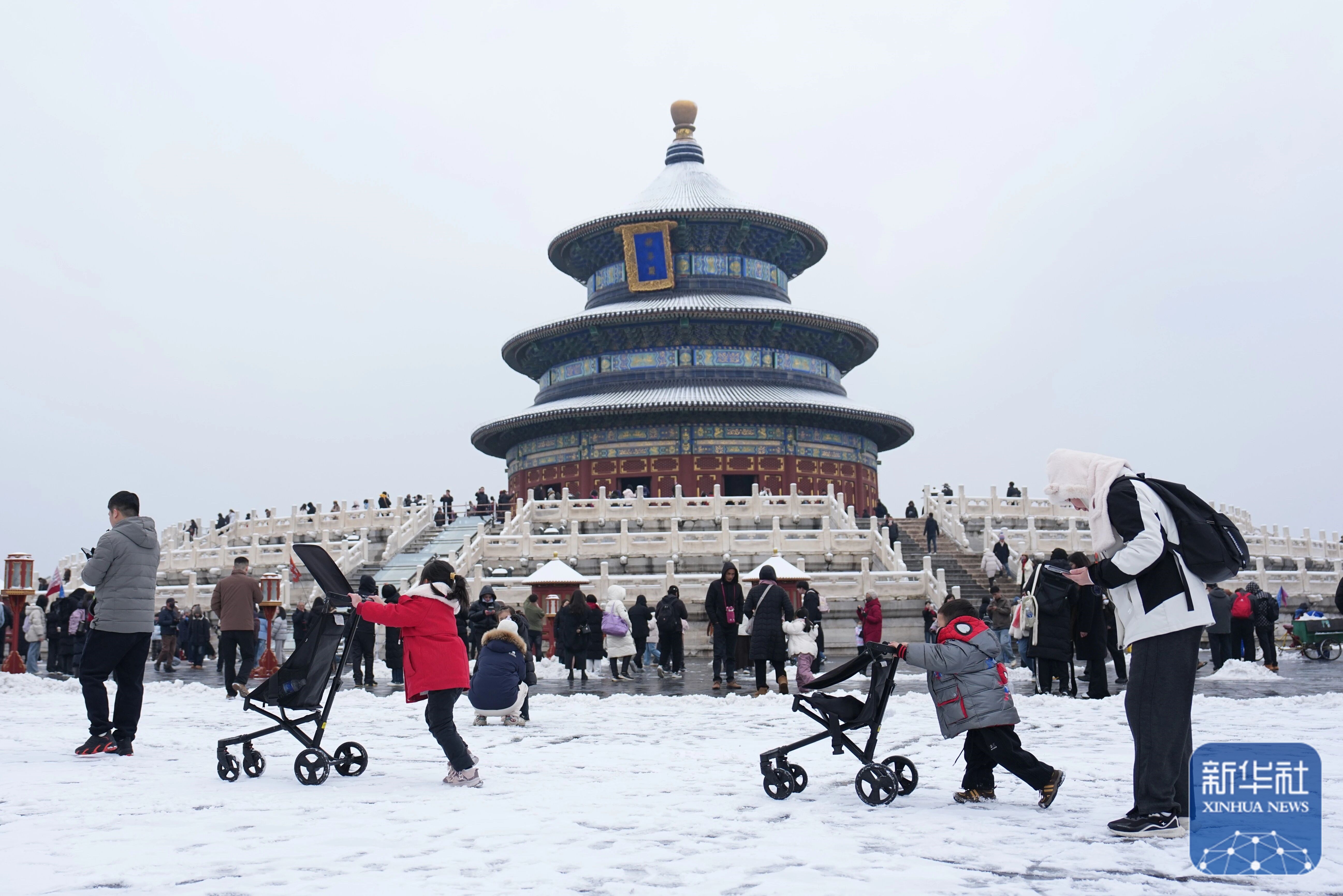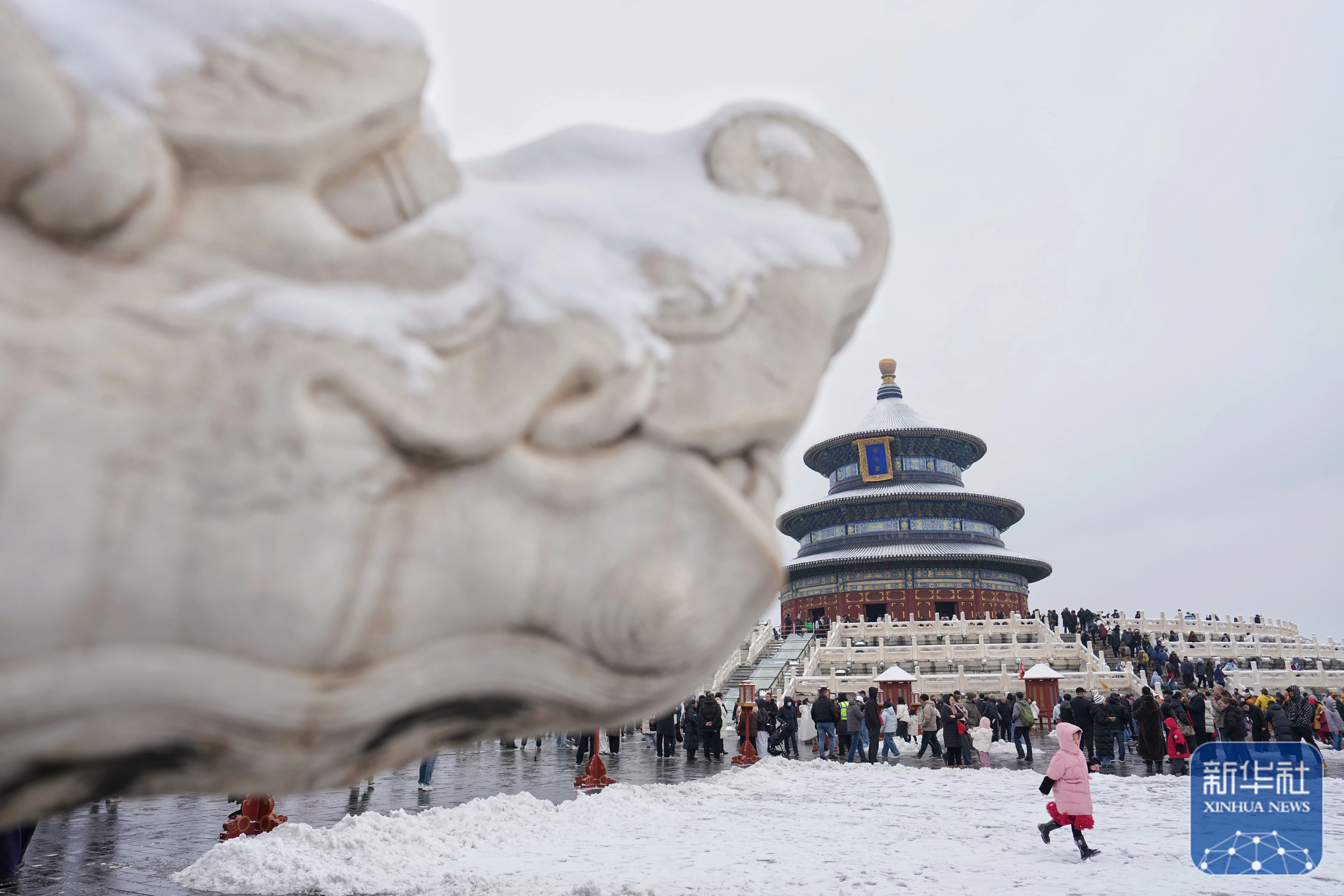 ↑ 3月5日,游客在雪后的北京天坛公园祈年殿参观游览。