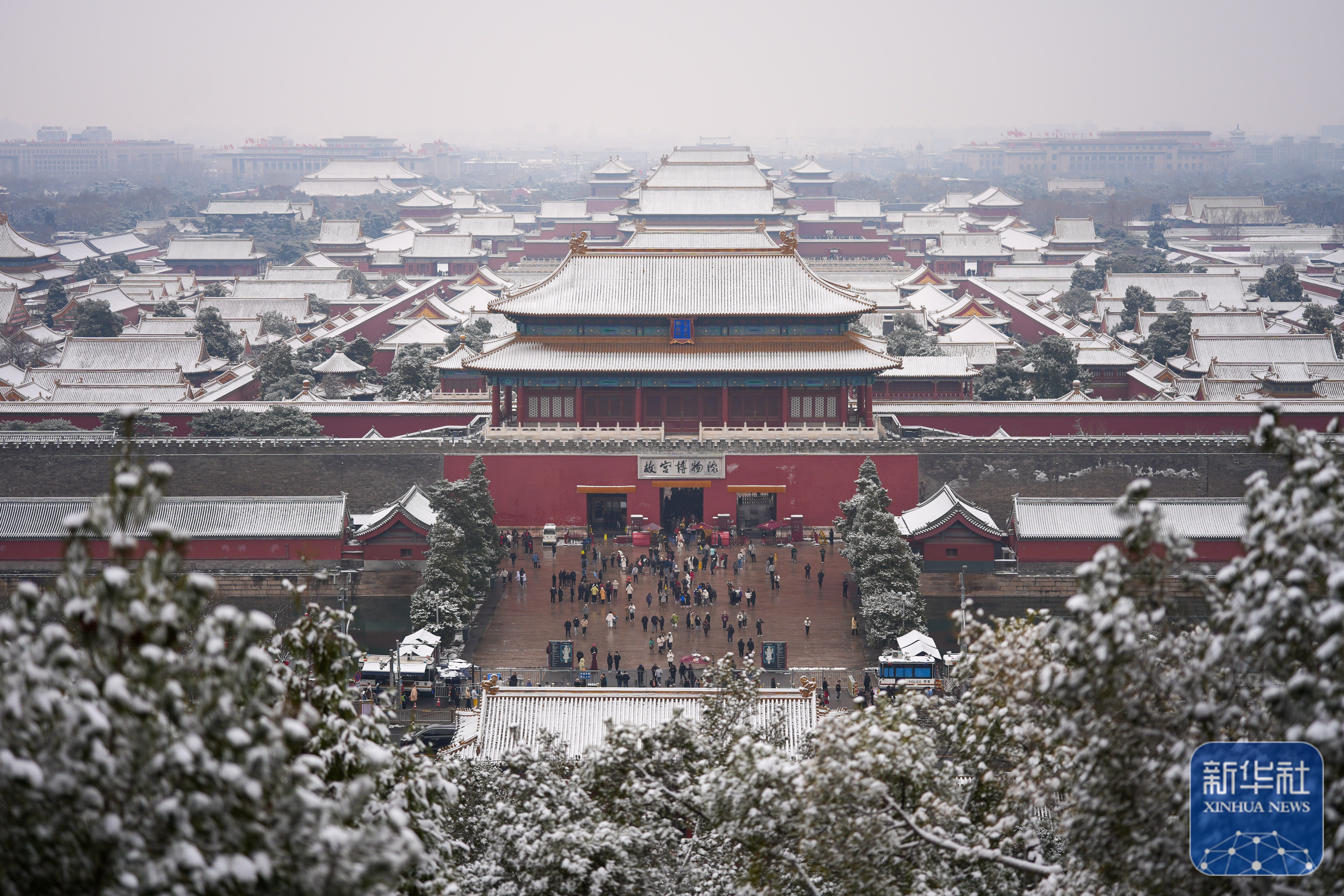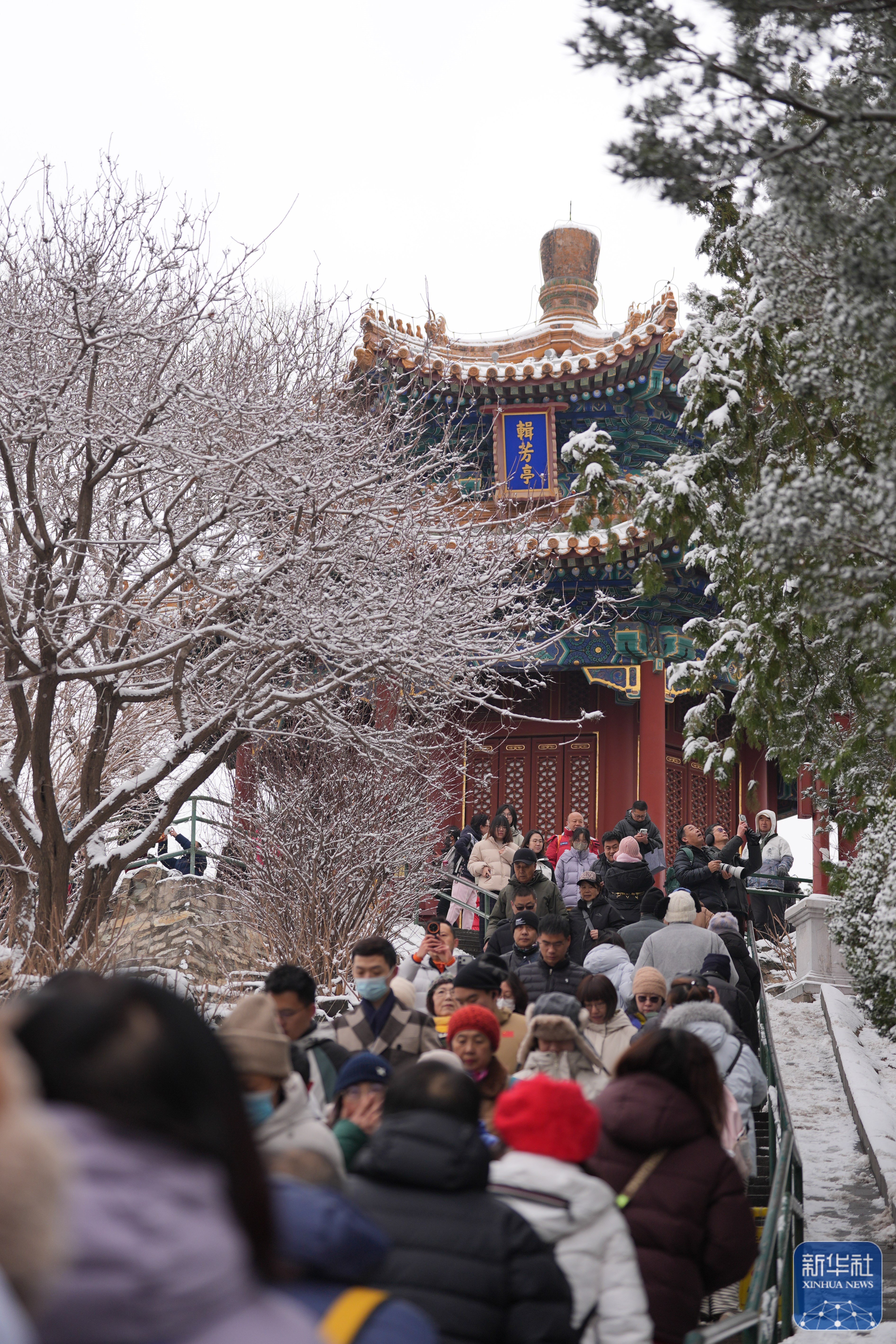 ↑ 3月5日,游客在雪后的北京景山公园参观游览。
