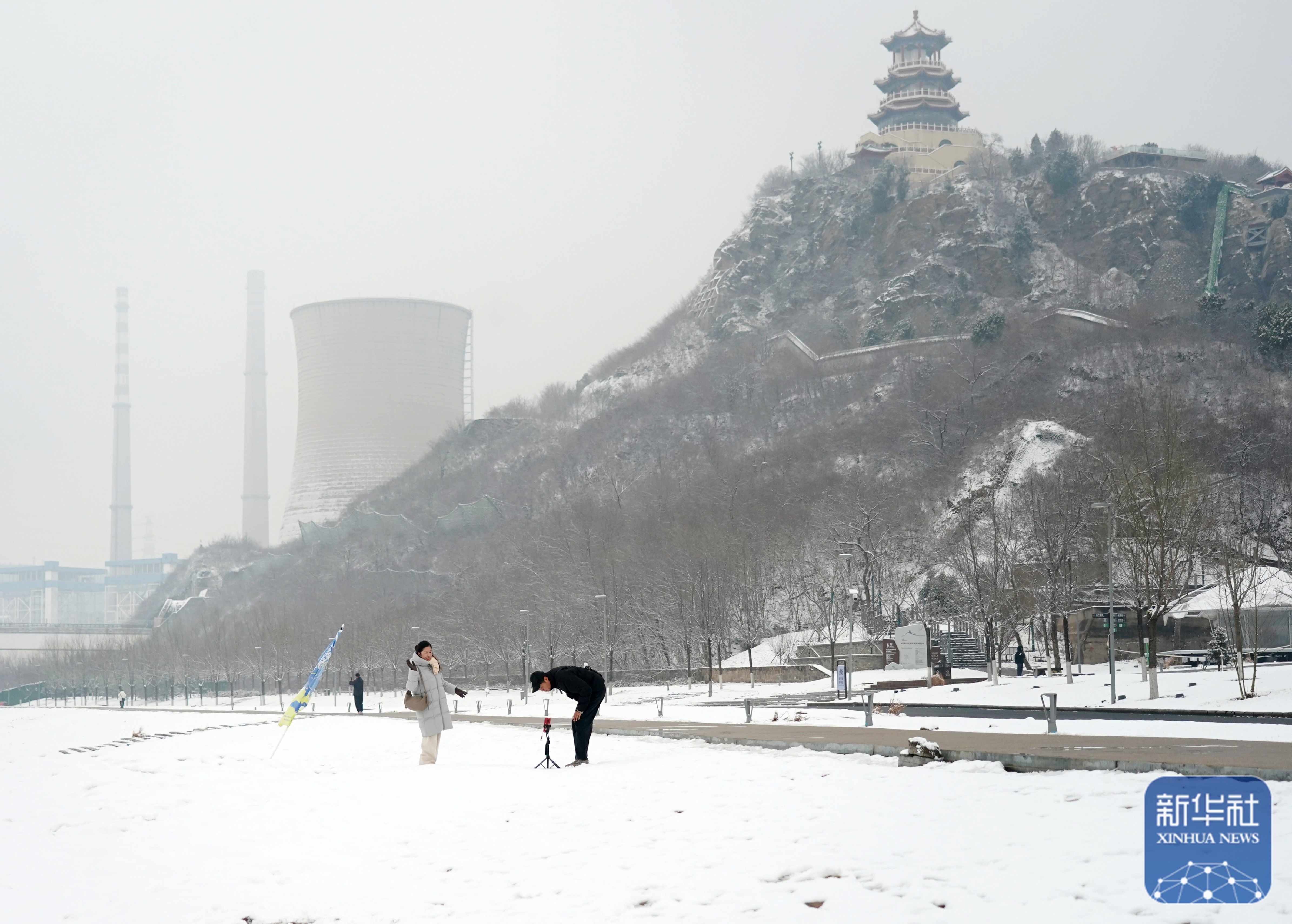 ↑ 3月5日,游客在雪后的北京首钢园参观游览。