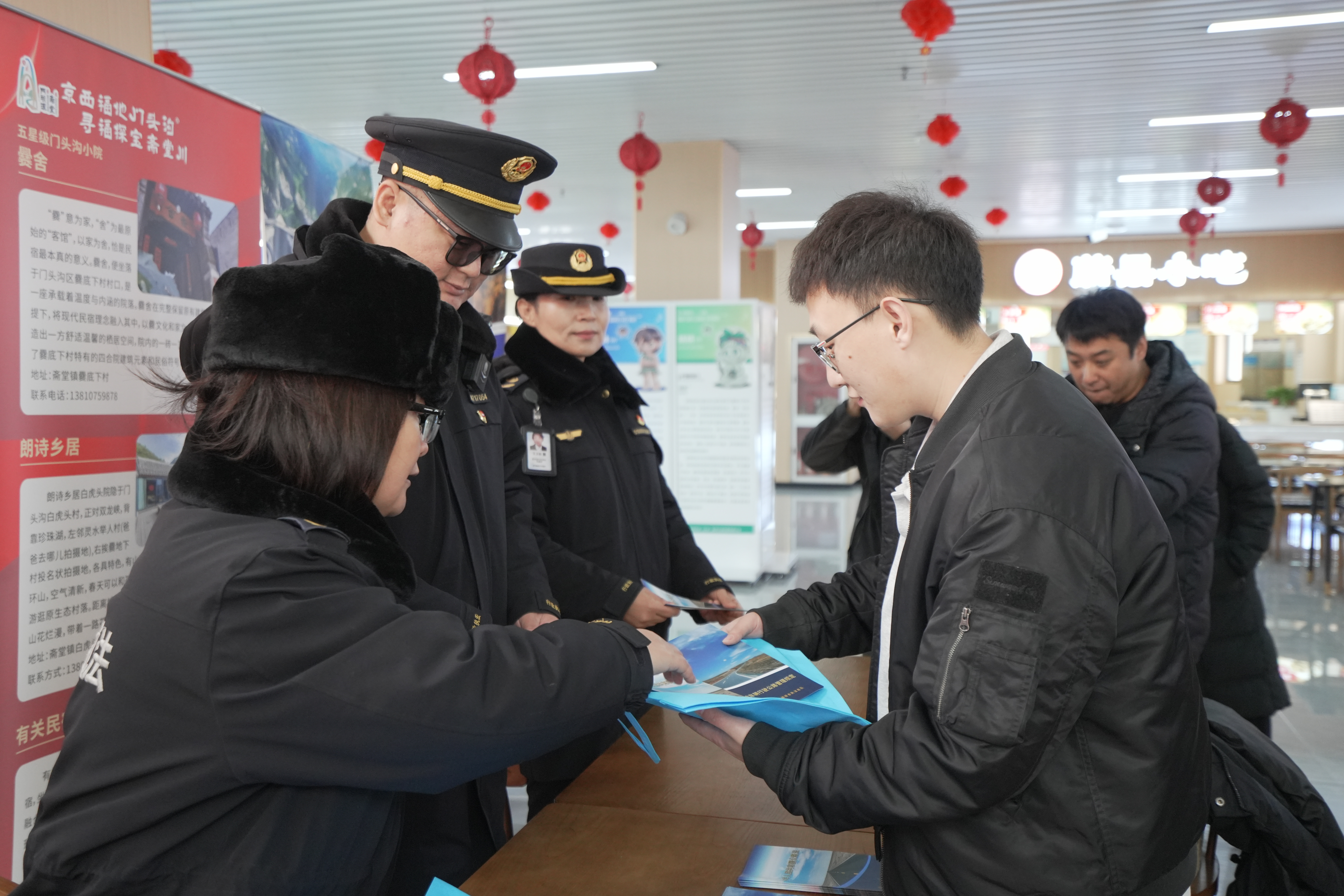 斋堂镇政府设立特色展台,通过宣传册、展板等形式,向过往旅客推介双龙峡、爨底下村、京西古道等沿线旅游景区,以及特色民宿、民俗文化和农特产品。志愿者同步提供旅游路线规划、景点咨询等便民服务。活动现场还开展了服务满意度问卷调查,广泛收集意见建议。