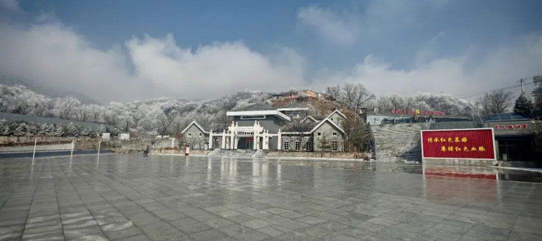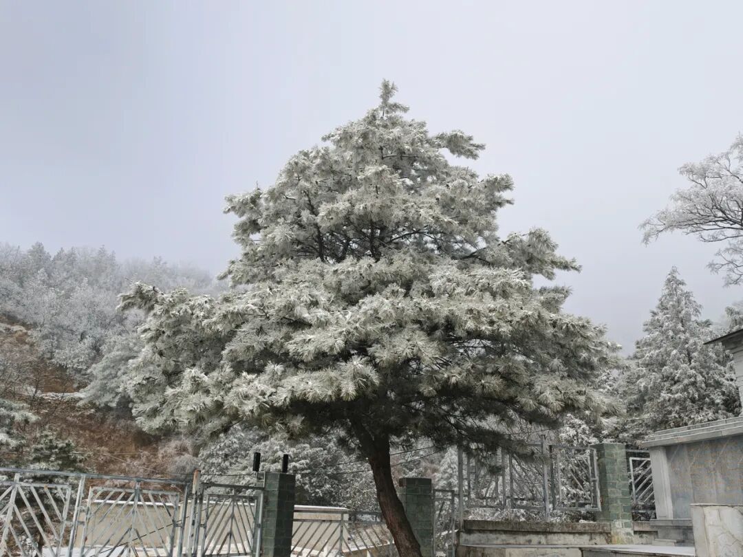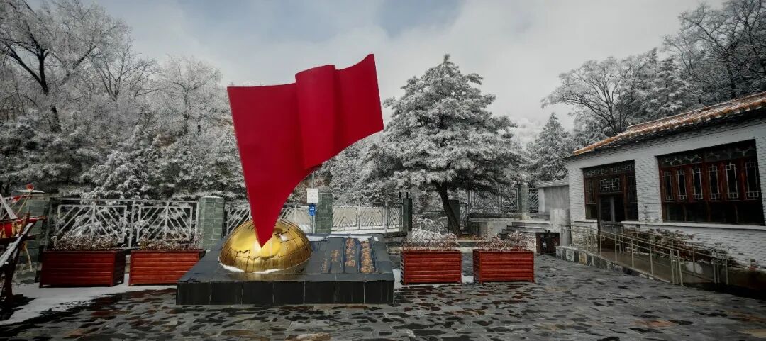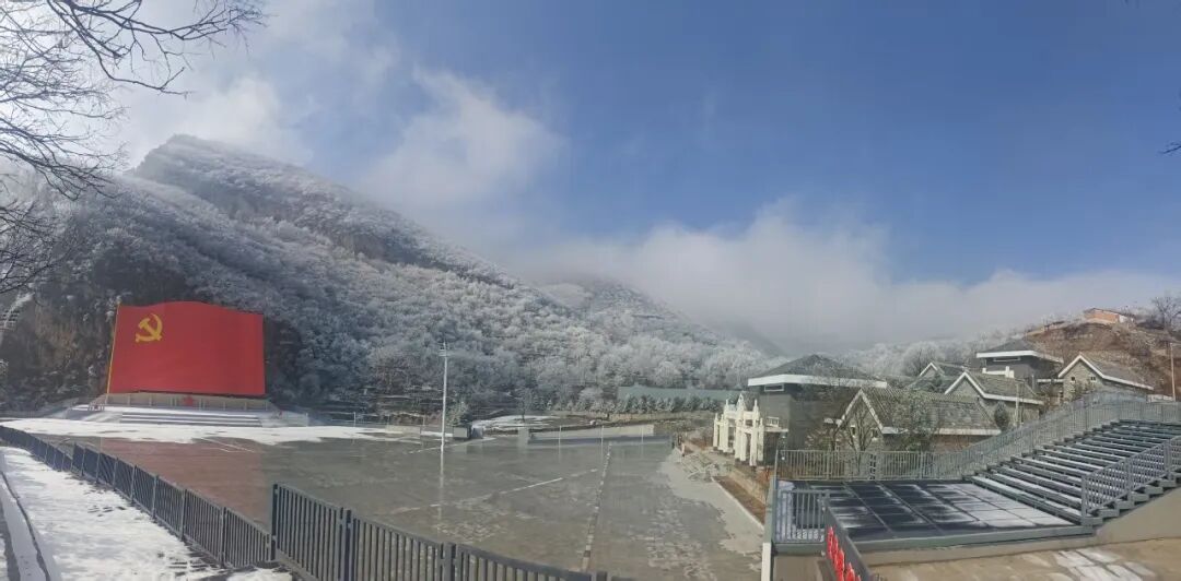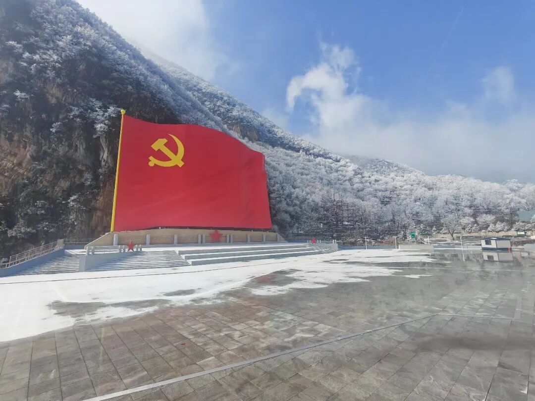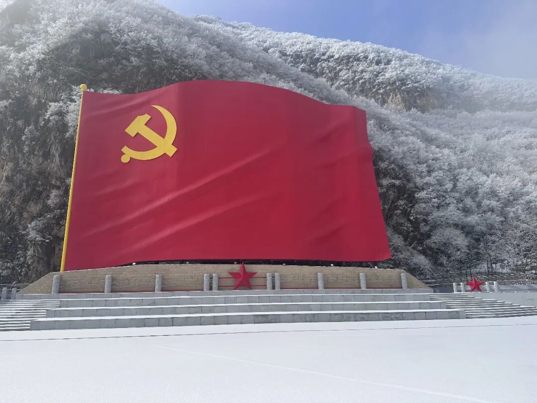洁白的雾凇,如琼枝玉树,将连绵的群山装点得宛如画境。山风拂过,枝头的冰晶簌簌作响,仿佛在低声诉说着往昔。在这片银装素裹之中,960平方米巨幅党旗鲜艳夺目,在冰雪的映衬下,更显庄严。它与远山的雾凇交相辉映,让红色信仰在纯净的天地间愈发熠熠生辉。