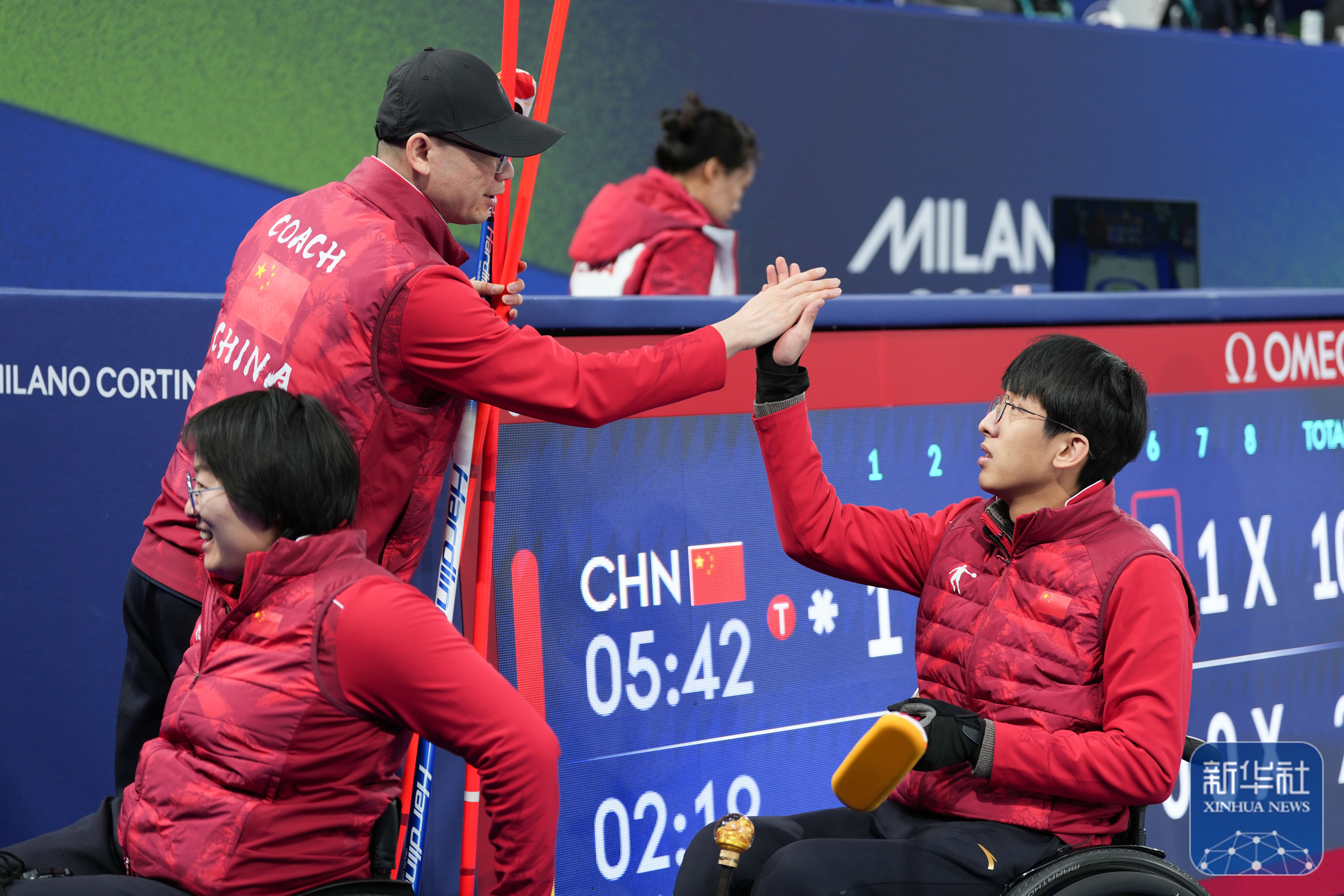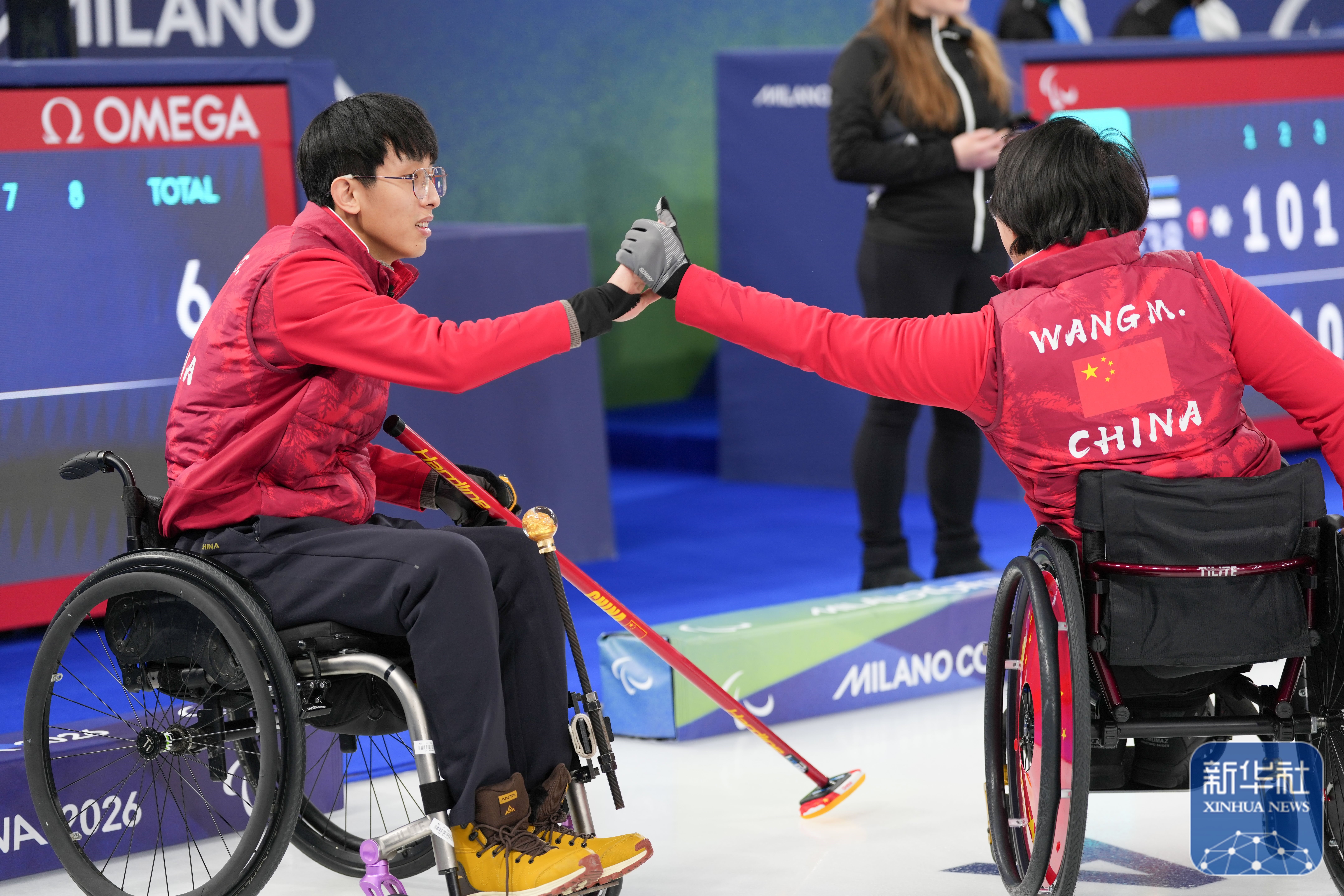 ↑3月5日,中国队选手王蒙(右)和杨金桥在比赛中庆祝得分。新华社记者 连振 摄