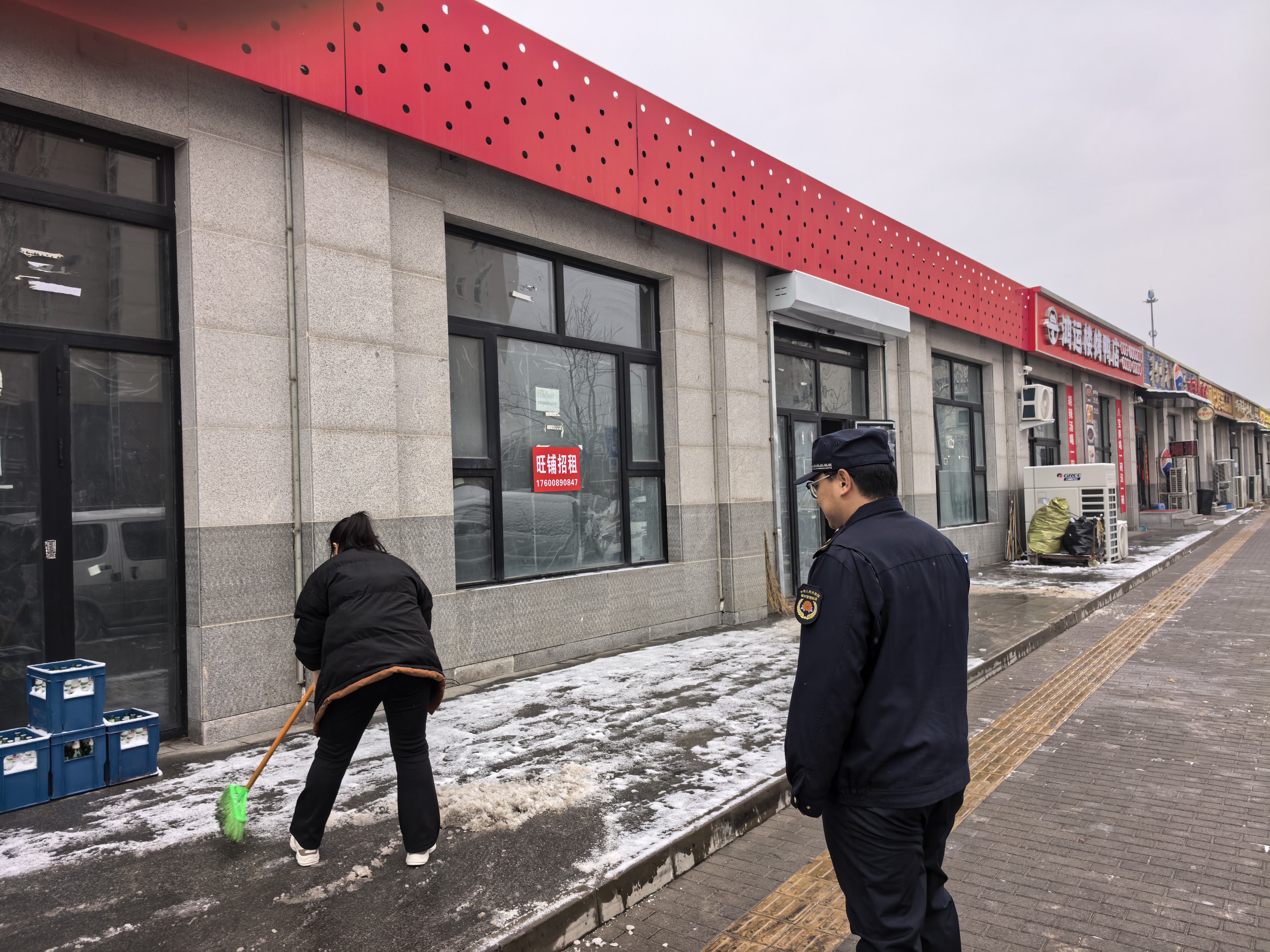“你好,雪天路滑,请尽快把店铺门前的积雪清理一下,铺上防滑垫。”执法队员手持扫雪工具,协助商户清理积雪。针对部分商户人手不足、工具短缺的情况,执法队员主动提供帮助,并协调环卫部门优先清理重点路段,确保行人通行安全。
