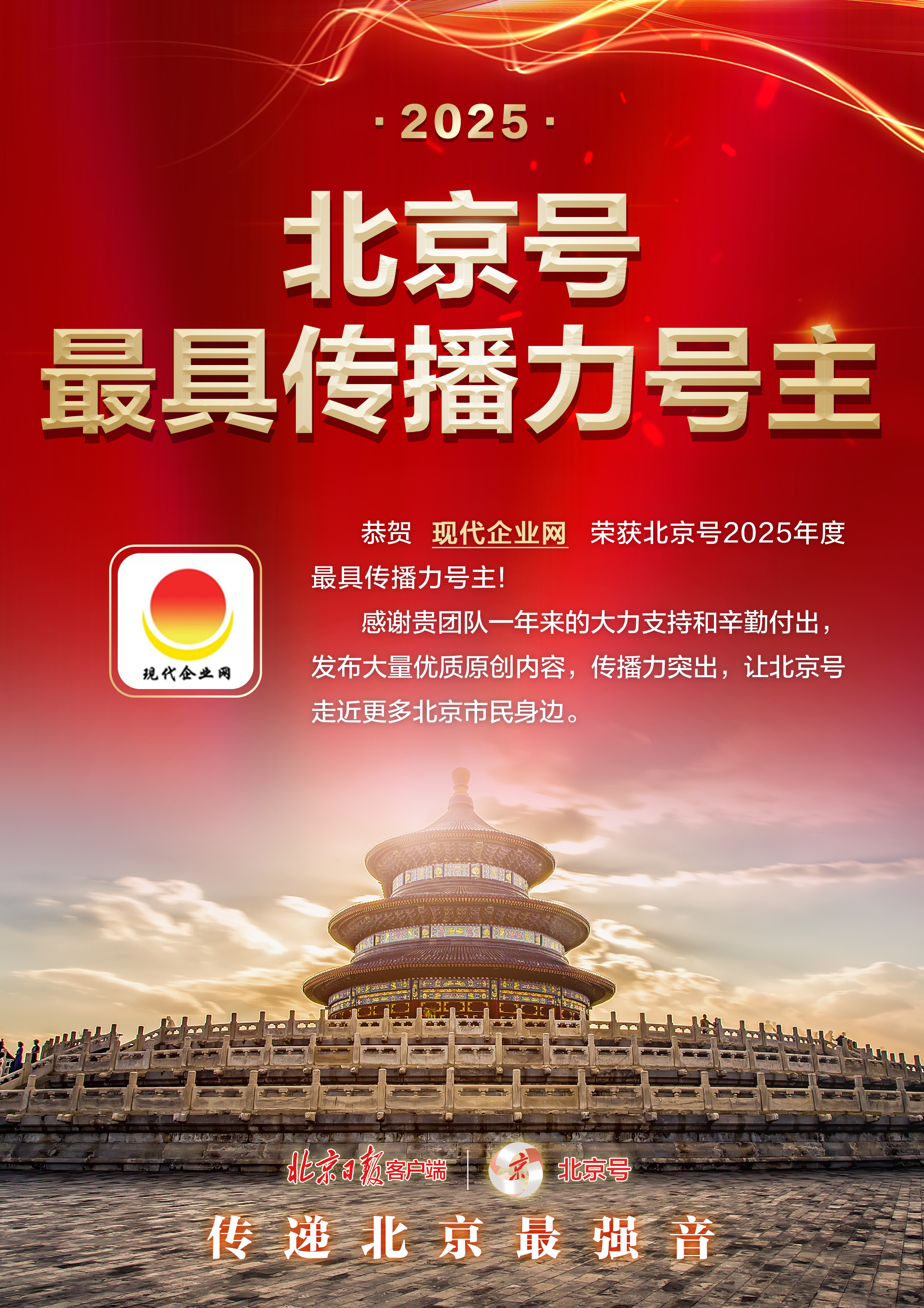 2026年3月4日,由北京日报报业集团举办的“共创・共赢——北京日报2026创作者思享会”在北京日报社一层报告厅圆满举办。现代企业网北京号在本次活动中获得“北京号2025年度最具传播力号主”殊荣。