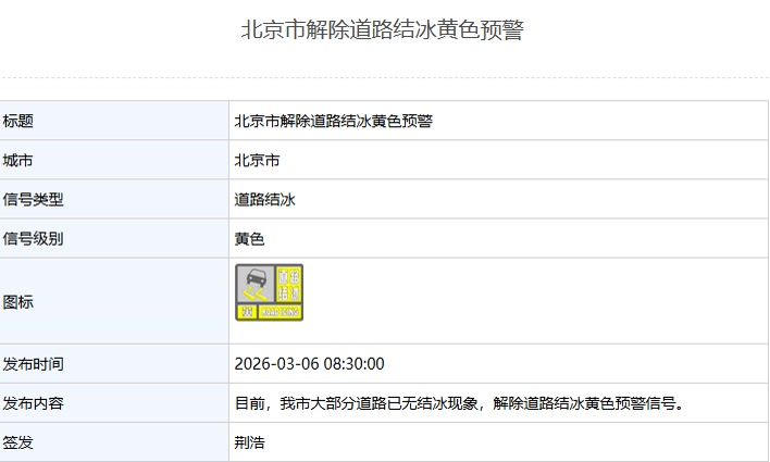 6日8时30分,北京解除道路结冰黄色预警