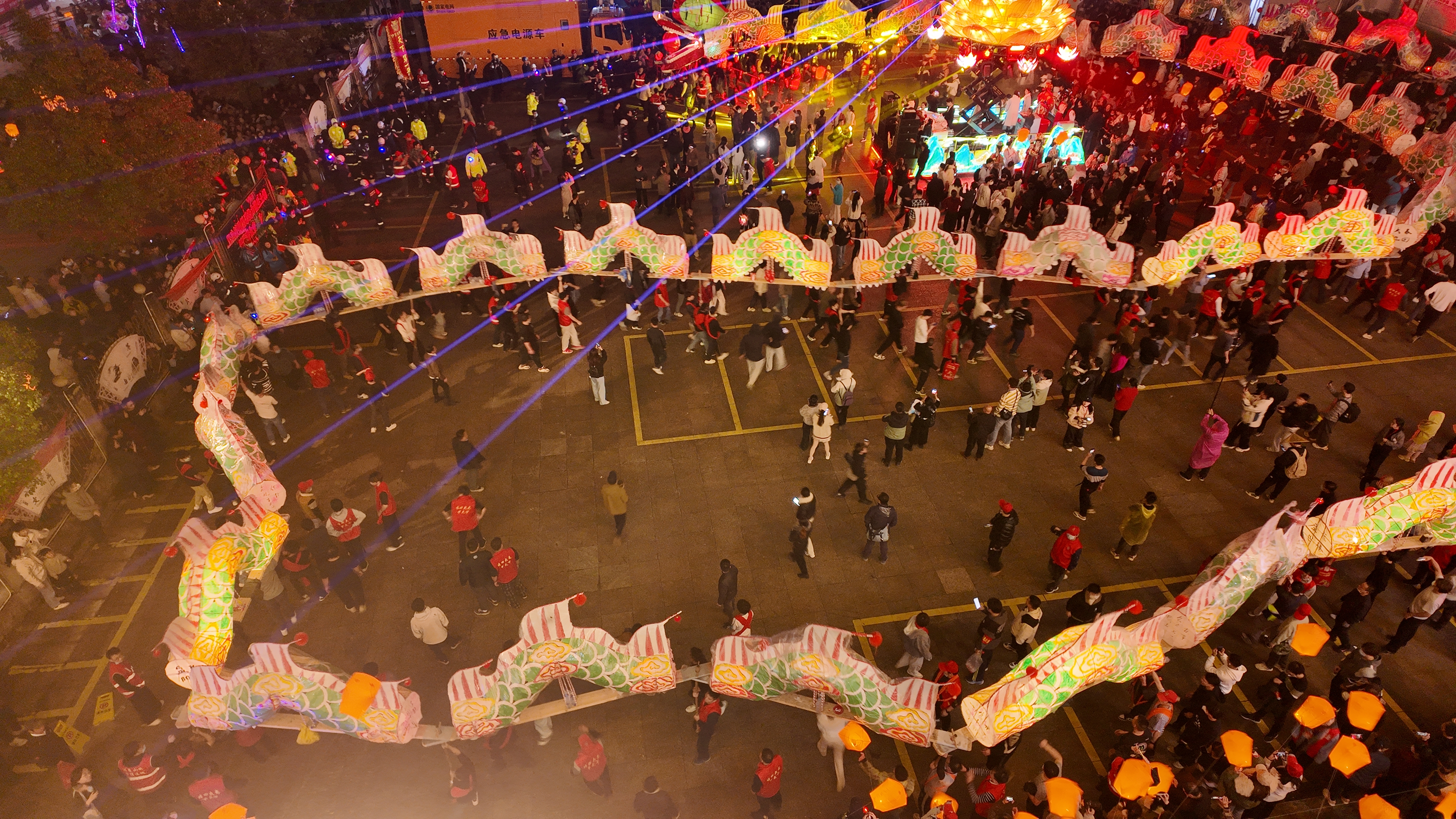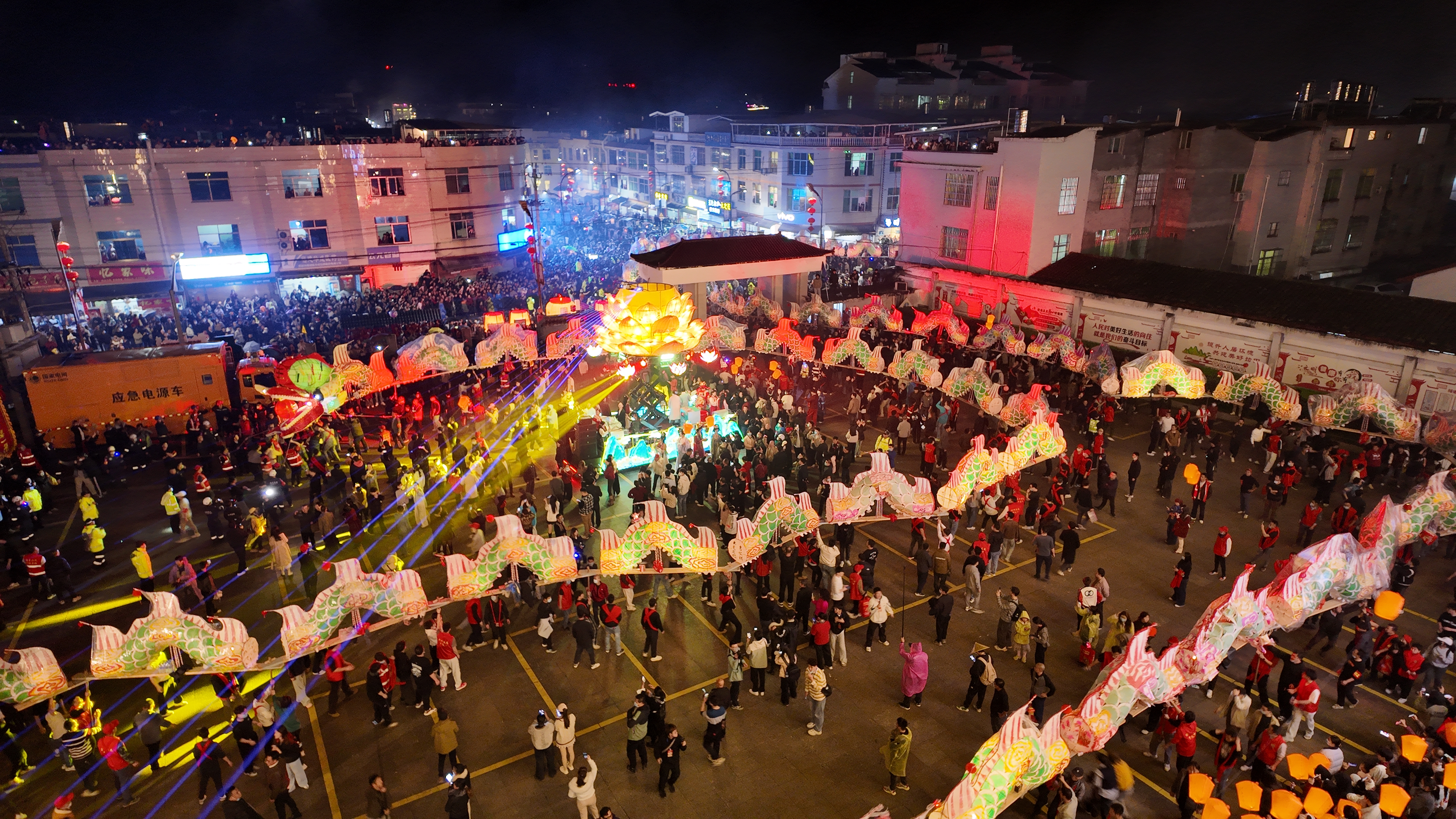 晚上9点,大龙仍在走街串巷为当地居民送去祝福与庇佑,乡间黑夜被焰火、灯光照亮,村民沿街同游,场面热闹非凡。不少游客都被这幅幸福烟火画卷深深触动,“抬龙的人互相协助,观礼的人全心投入,我们有如此中国式浪漫!”