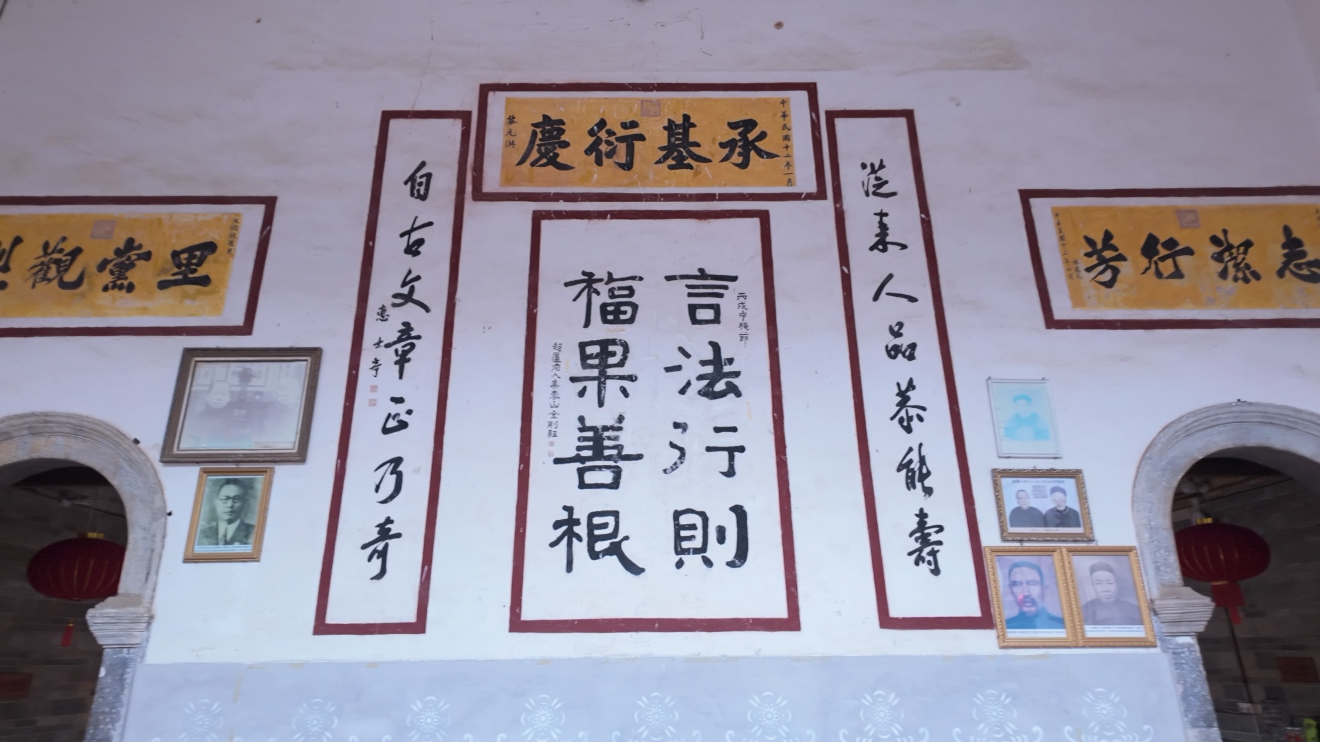在洪坑村,被称作“土楼王子”的振成楼,以《易经》布局为骨,以家风祖训为魂。中心祖堂前的四根石柱,镌刻着两副传世家训,成为族人立身行事的圭臬:中柱“振乃家声,好就孝悌一边做去;成些事业,端从勤俭两字得来”,直指家风根本;侧柱“能不为忧患挫志,自不为安乐肆志;在官无傥来一金,居家无浪费一金”,彰显修身底线。祖堂正中“观自在”三字与警示楹联相映,族人若有逾矩,便在此反省思过,让家规祖训从文字化为日常约束。